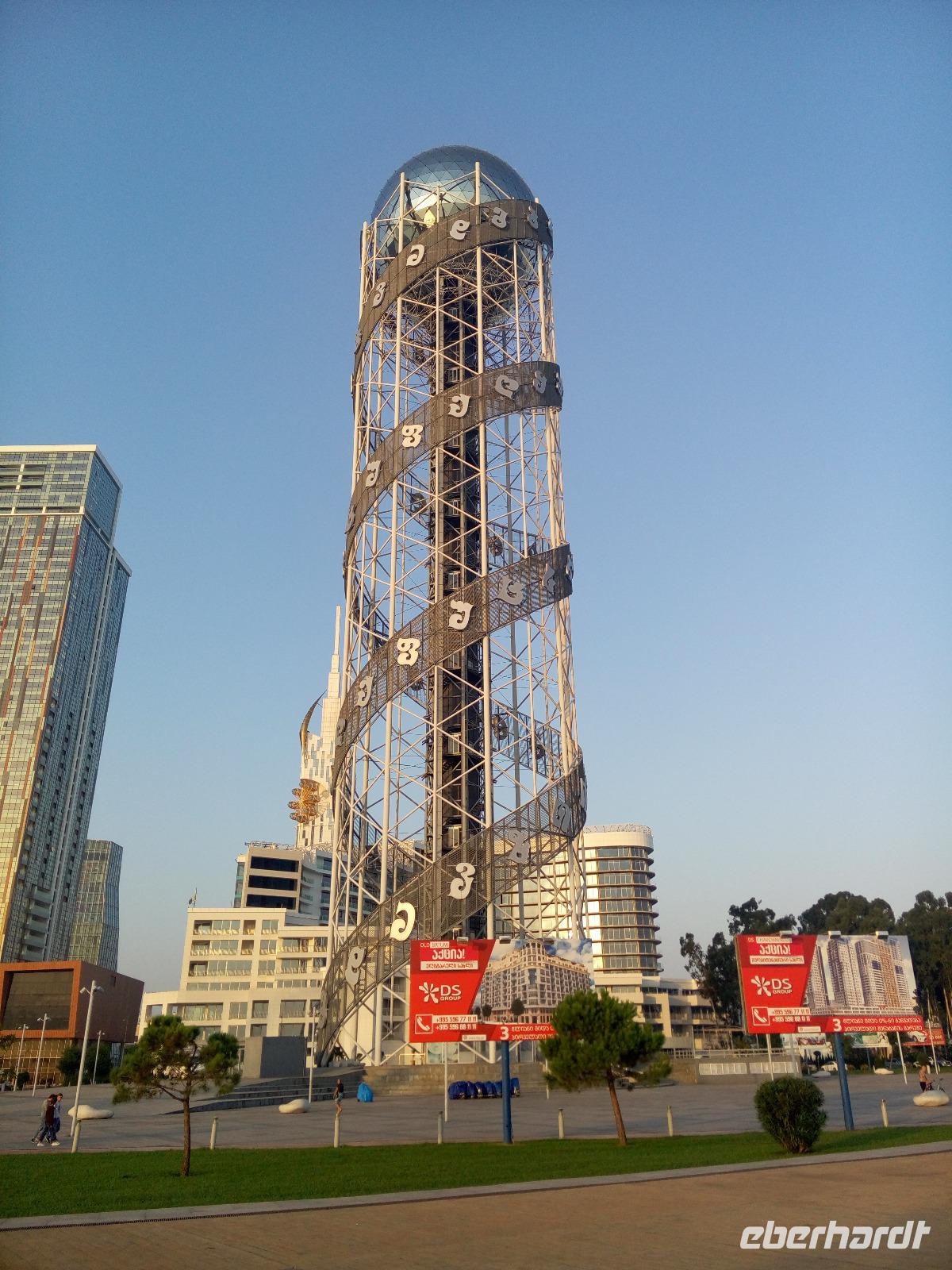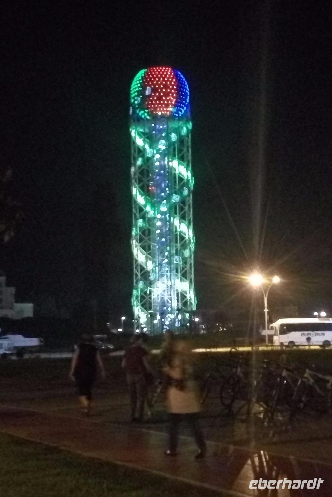 Bis zum Hotel war es nicht weit und nach dem problemlosen Einchecken und nach dem wir uns etwas frisch gemacht haben, haben wir unseren Weg zum Alphabettower fortgesetzt, wo unser erstes Abendessen stattfinden sollte. Im Alphabettower von Batumi befindet sich ein wunderschönes Restaurant, der sich auch noch dreht. Wir haben georgische Spezialitäten gekostet, viele Gerichte waren für uns ganz neu. Nach dem Abendessen sind wir zu der Panoramaebene gefahren, um Fotos zu machen und die nächtliche Batumi von oben zu beobachten. Ganz erschöpft und müde, aber voll von Emotionen sind wir ins Hotel zurückgekehrt.