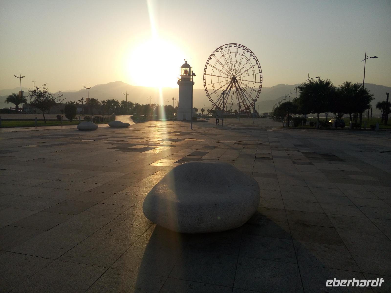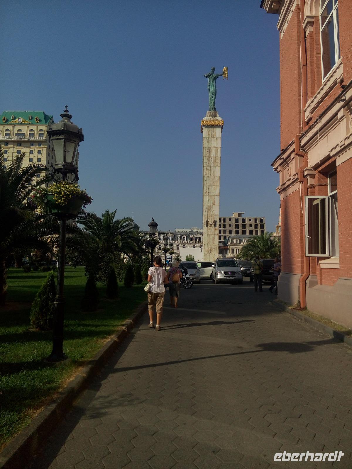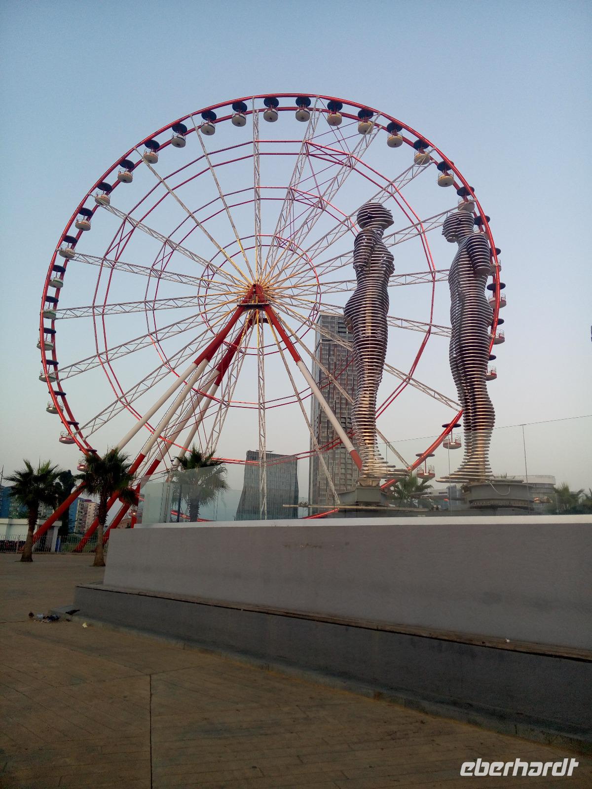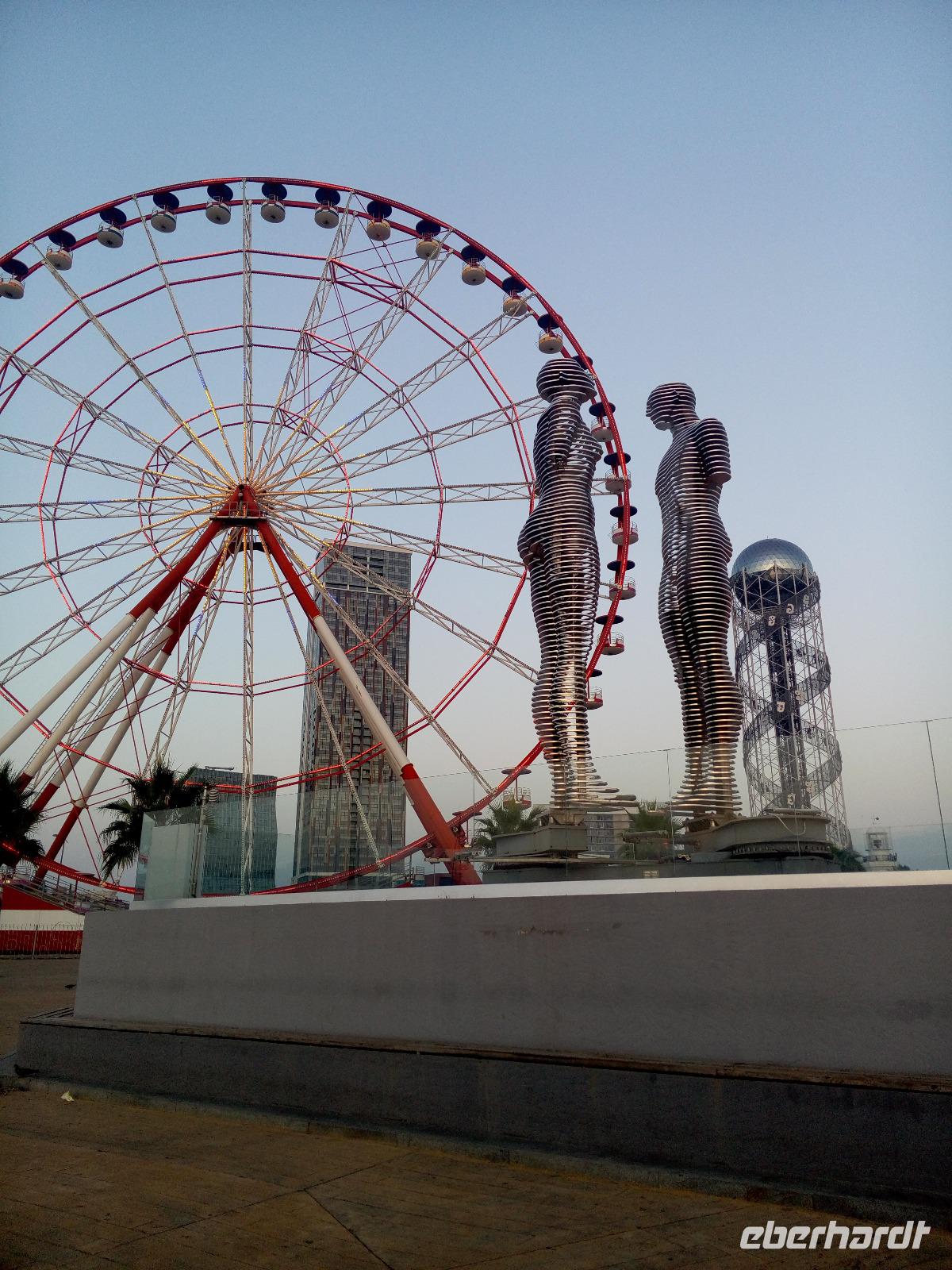 Wunderschönen Sonnenaufgang haben wir beobachtet als wir den Kieselstrand von Batumi entlanggingen. Einige von den Einheimischen waren auch schon unterwegs. Die Stadt wurde langsam wach. Nach dem Frühstück auf der Terrasse von Restaurant haben wir unseren Stadtrundgang mit Natja begonnen. Sie hat uns ein bisschen von der Geschichte erzählt, einige Legenden und Kuriositäten. Viele Fotos haben wir neben der Statue der Liebe von Ali und Nino gemacht. Wie viele architektonischen Objekte in der Stadt, dreht sich die Statue und die Figuren kommen einander näher.
