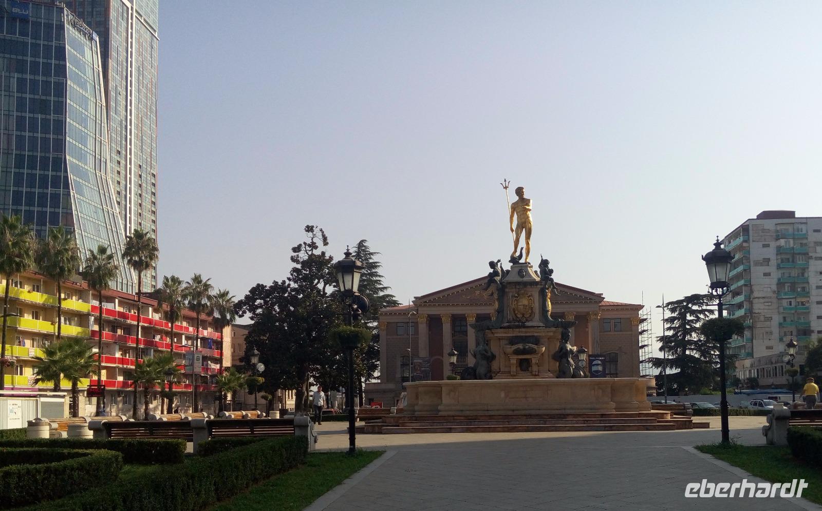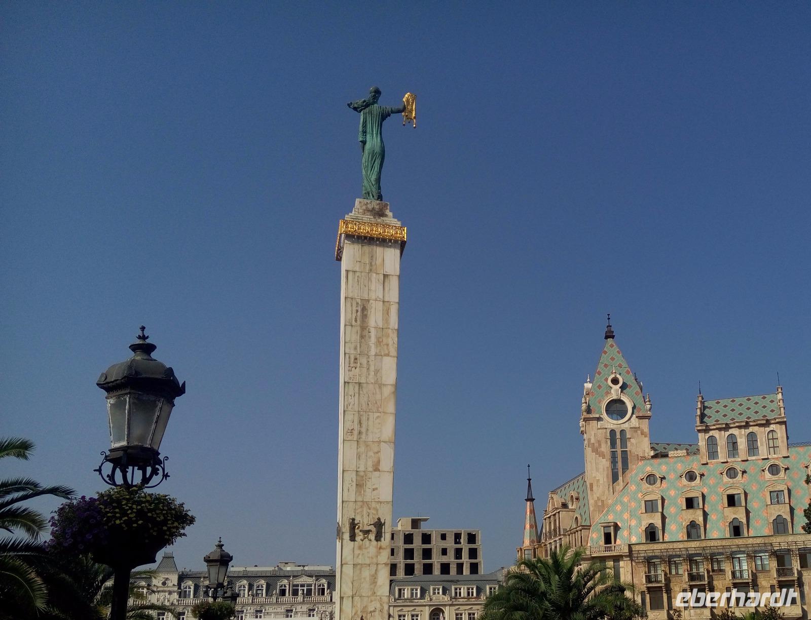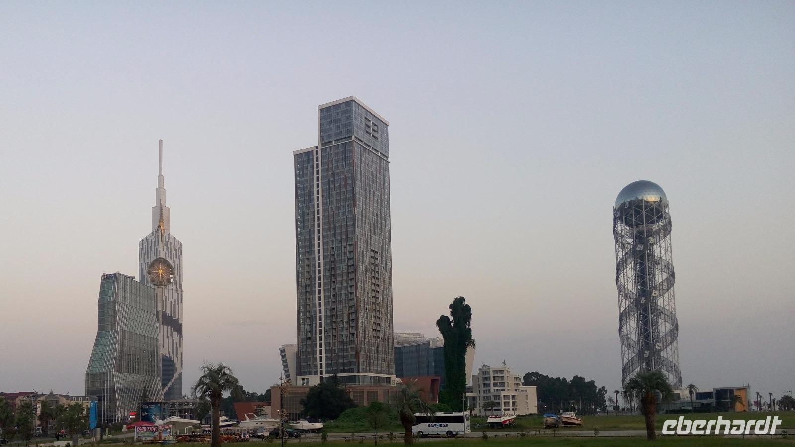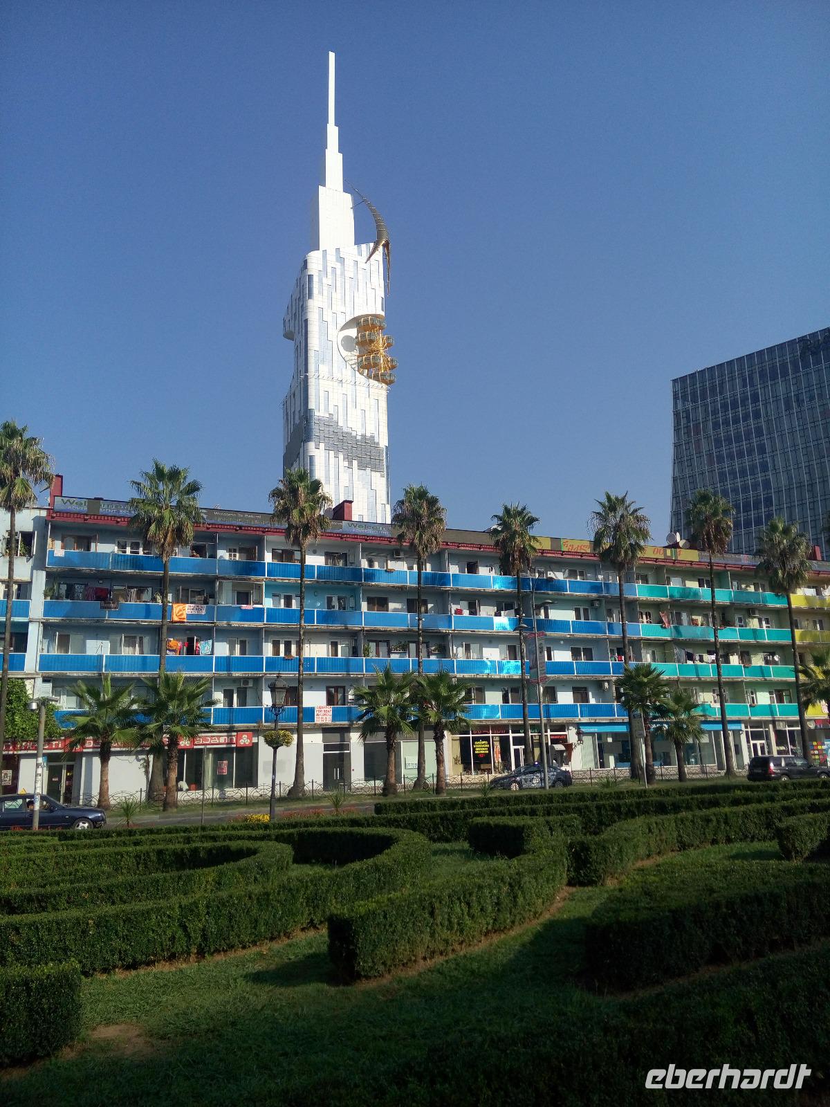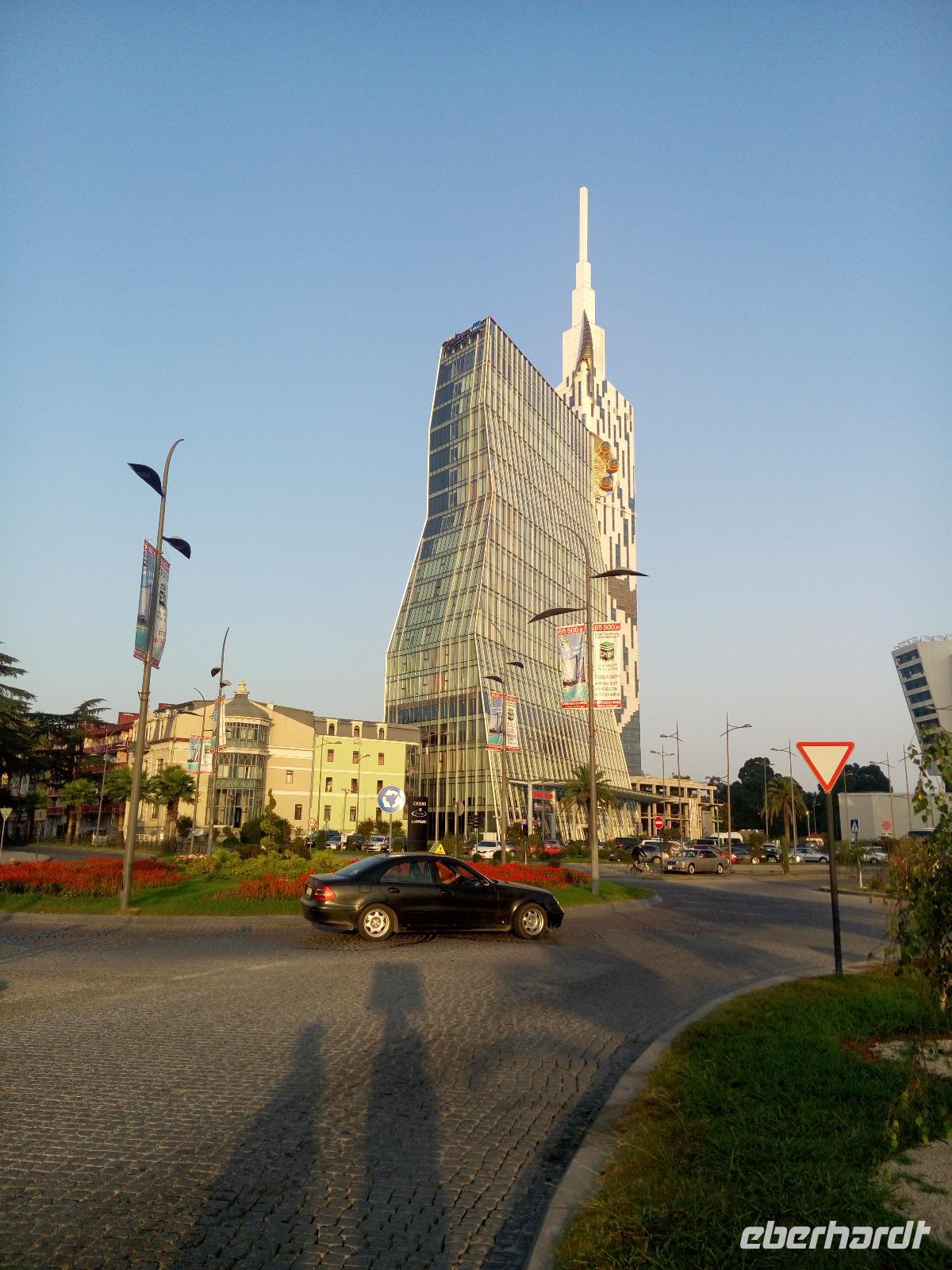 Wunderschönen Sonnenaufgang haben wir beobachtet als wir den Kieselstrand von Batumi entlanggingen. Einige von den Einheimischen waren auch schon unterwegs. Die Stadt wurde langsam wach. Nach dem Frühstück auf der Terrasse von Restaurant haben wir unseren Stadtrundgang mit Natja begonnen. Sie hat uns ein bisschen von der Geschichte erzählt, einige Legenden und Kuriositäten. Viele Fotos haben wir neben der Statue der Liebe von Ali und Nino gemacht. Wie viele architektonischen Objekte in der Stadt, dreht sich die Statue und die Figuren kommen einander näher.
