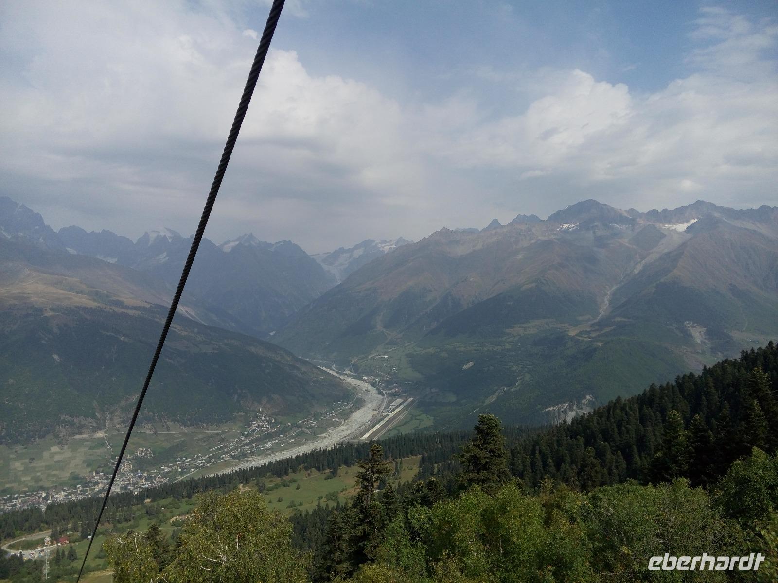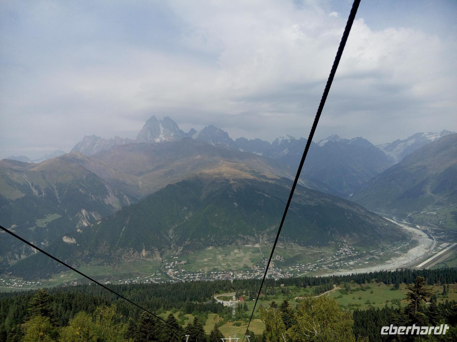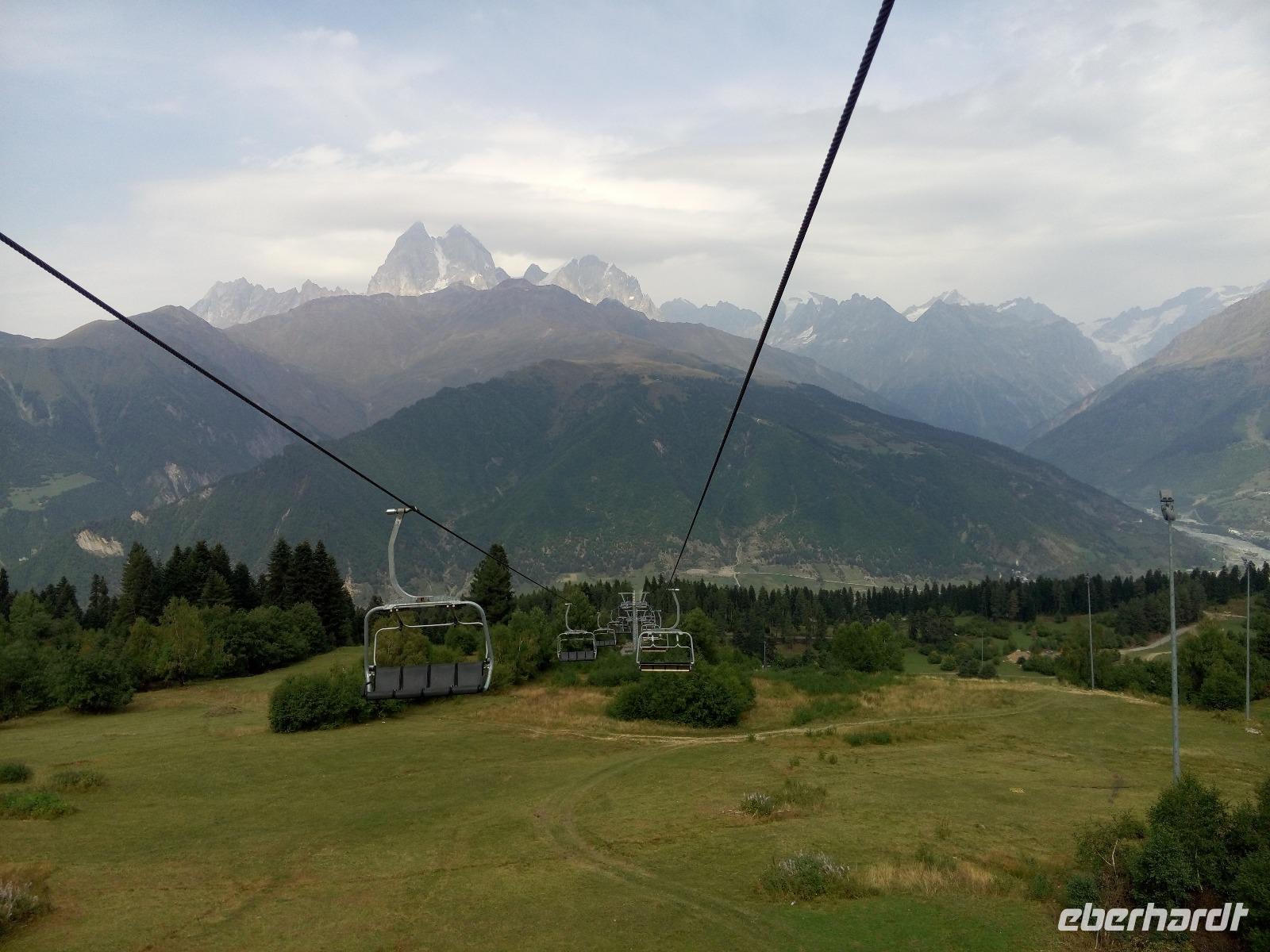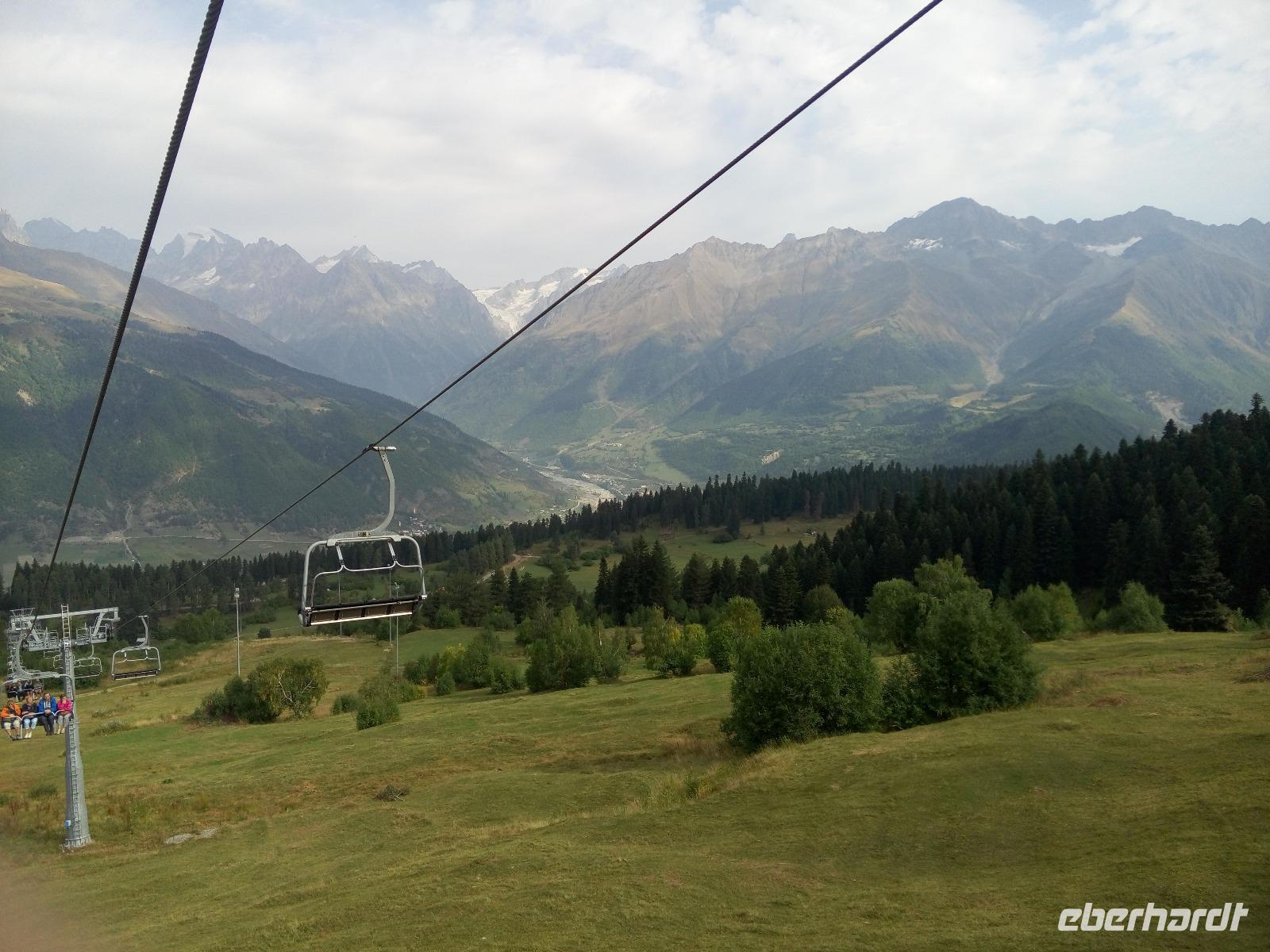 Das Wetter war gut, also haben wir den Plan etwas umgeändert und sind zuerst zu dem Sessellift gefahren. Eine 20 minütige Fahrt mit dem Sessellift kostete ca. 2 Euro. Wir waren auf dem Berg wo man das ganze Swanetien sehen konnte. Nach der erfrischenden Tasse Kaffee sind wir runtergefahren in die Stadt von Mestia. Unser Mittagessen war bei einem Restaurant, wo man Deutsch gesprochen hat, also gab es keine Probleme, um sich zu verständigen. Generell, sprechen 80 % der Bevölkerung in Georgien Russisch, also haben wir unsere Schulkenntnisse von dieser Sprache aufgefrischt.