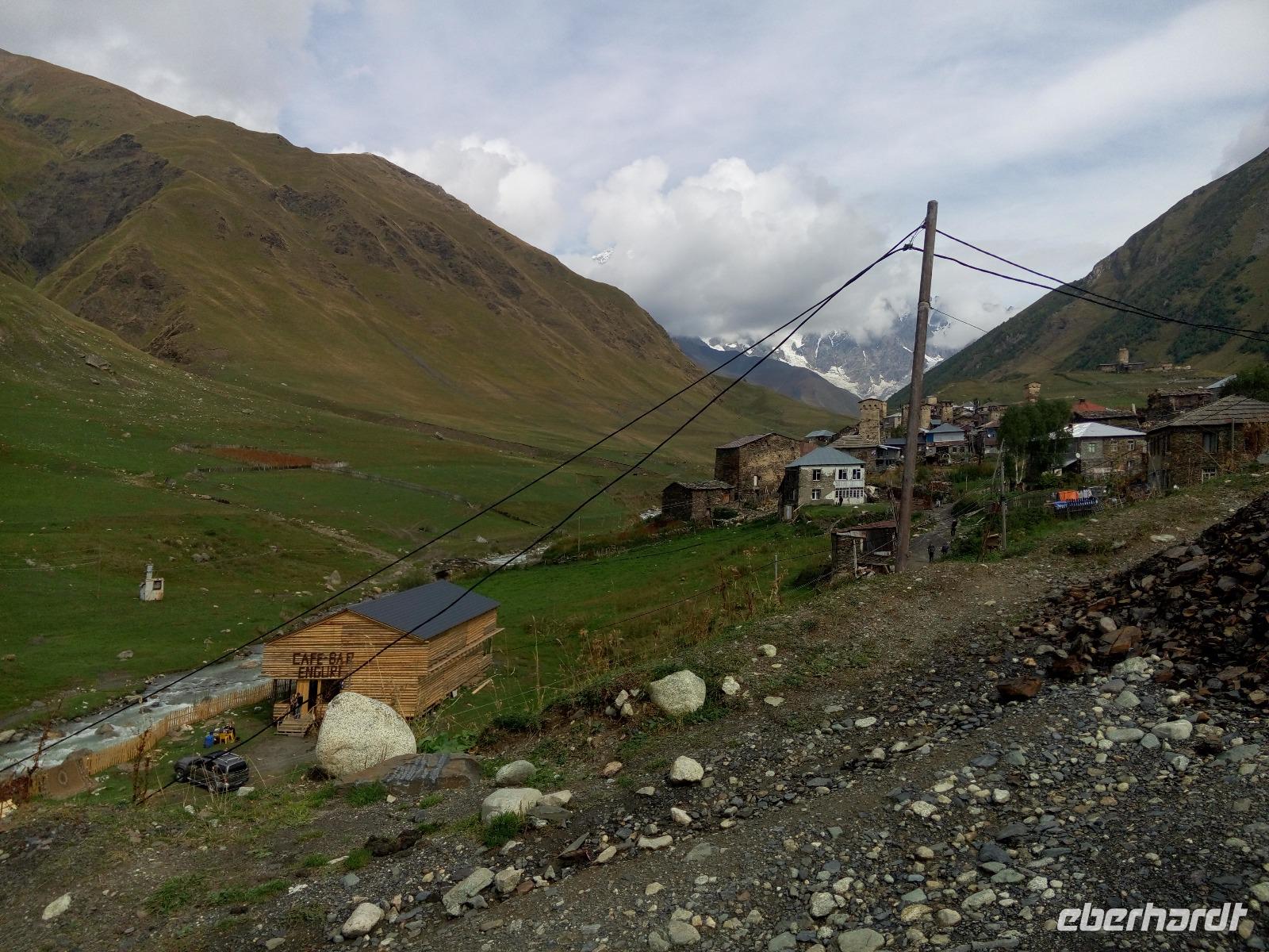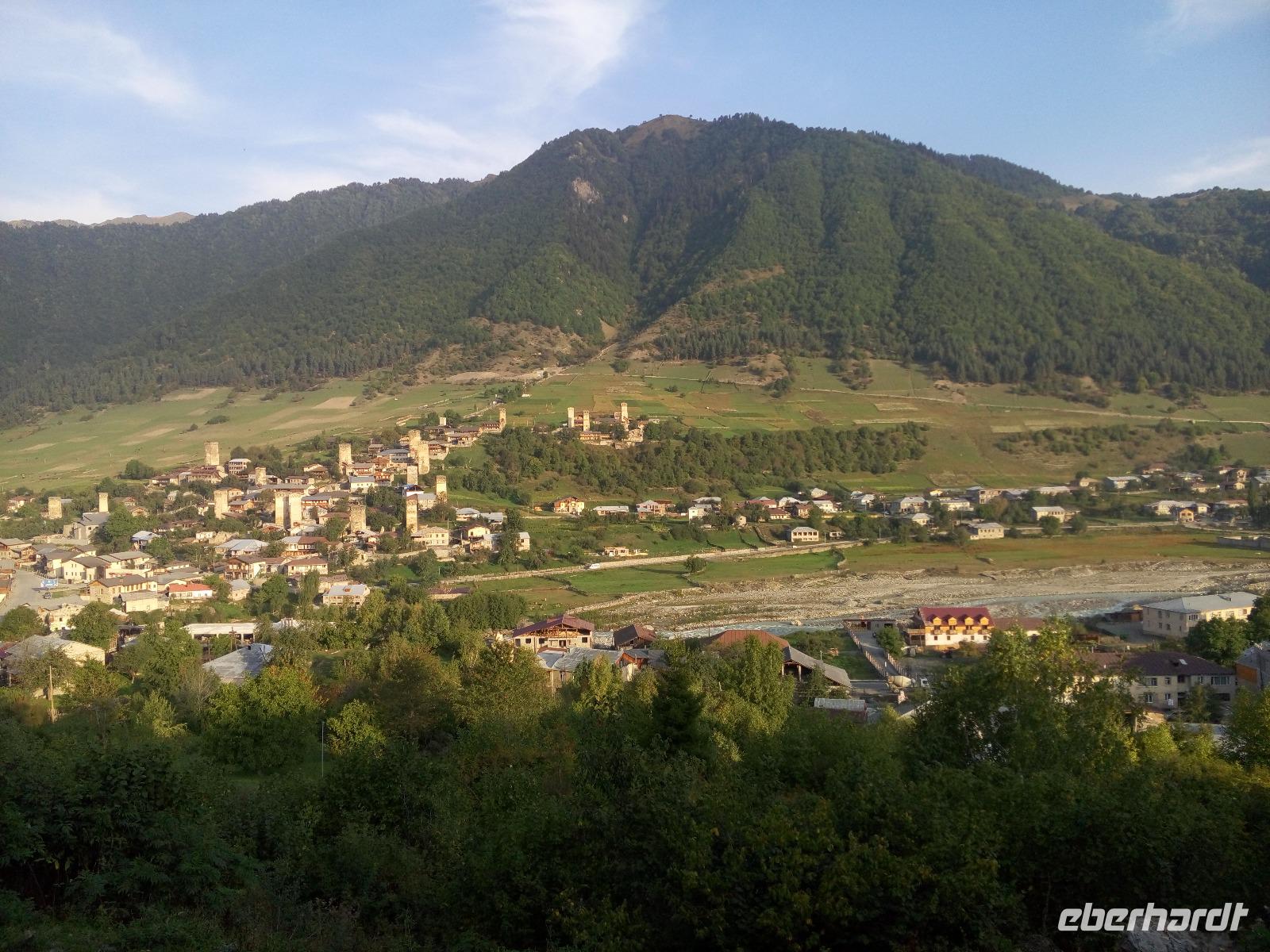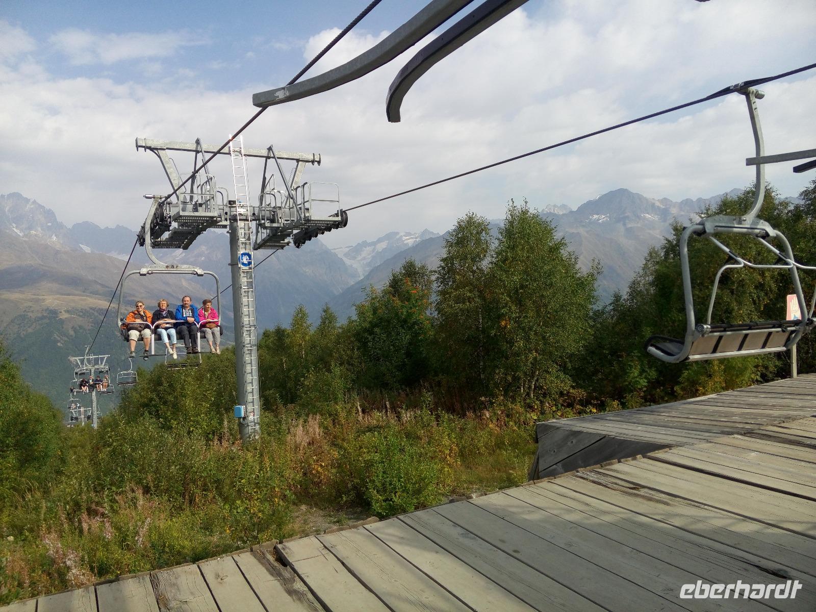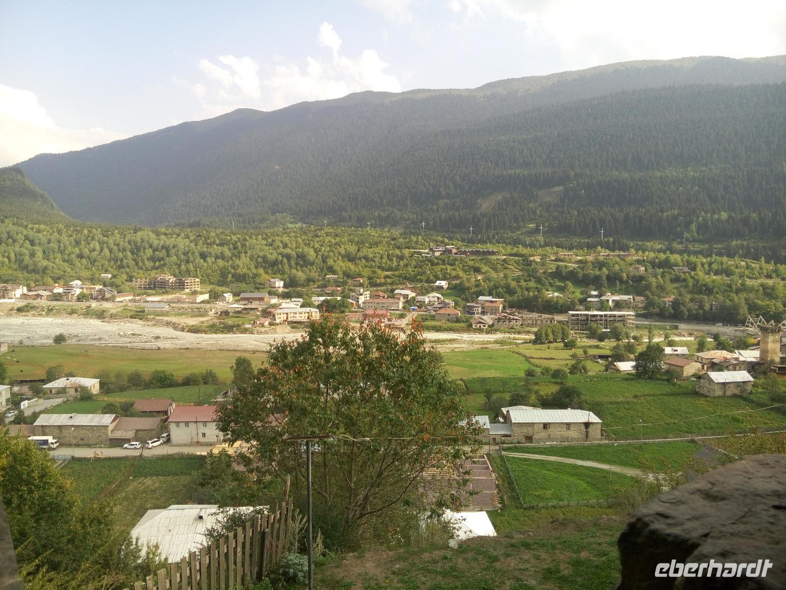 Das Wetter war gut, also haben wir den Plan etwas umgeändert und sind zuerst zu dem Sessellift gefahren. Eine 20 minütige Fahrt mit dem Sessellift kostete ca. 2 Euro. Wir waren auf dem Berg wo man das ganze Swanetien sehen konnte. Nach der erfrischenden Tasse Kaffee sind wir runtergefahren in die Stadt von Mestia. Unser Mittagessen war bei einem Restaurant, wo man Deutsch gesprochen hat, also gab es keine Probleme, um sich zu verständigen. Generell, sprechen 80 % der Bevölkerung in Georgien Russisch, also haben wir unsere Schulkenntnisse von dieser Sprache aufgefrischt.