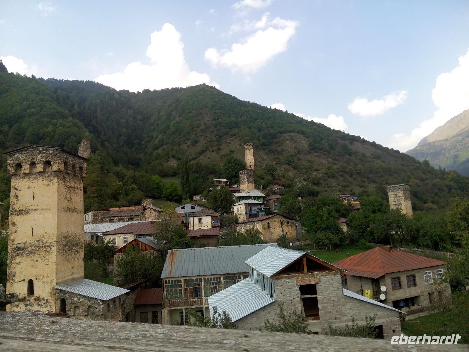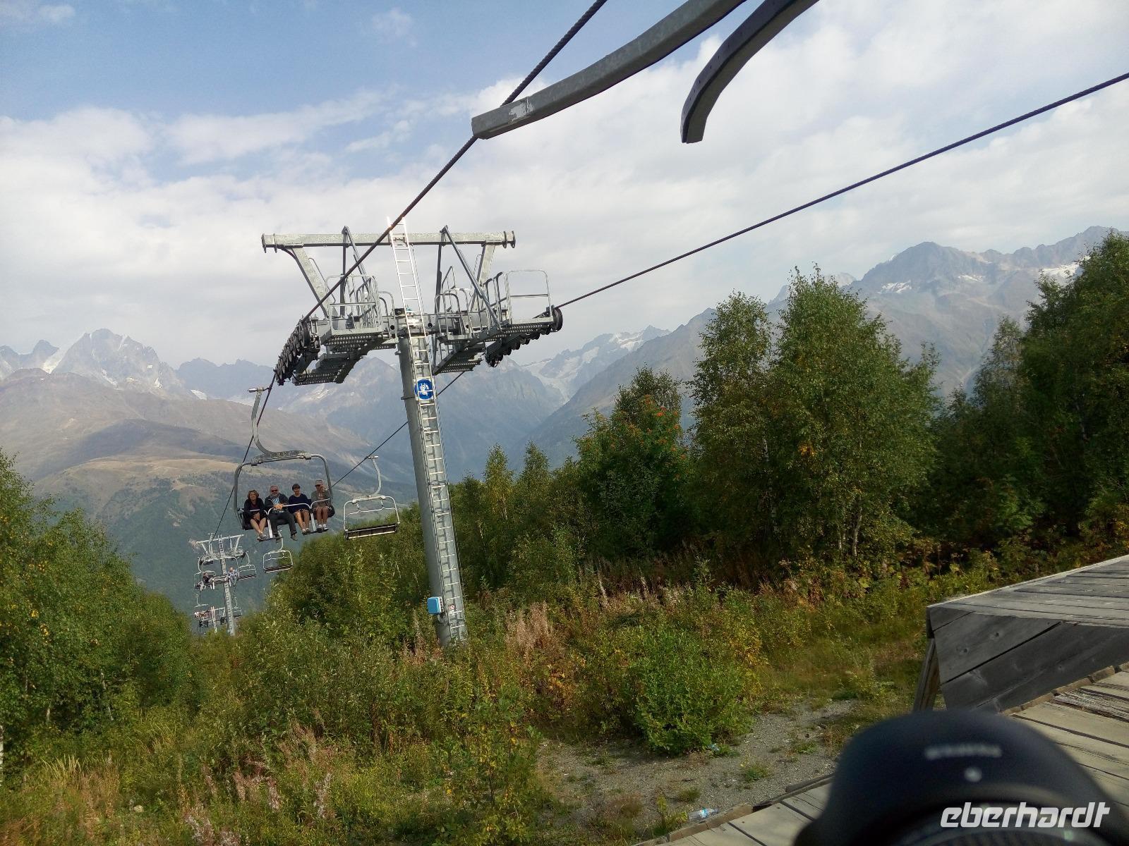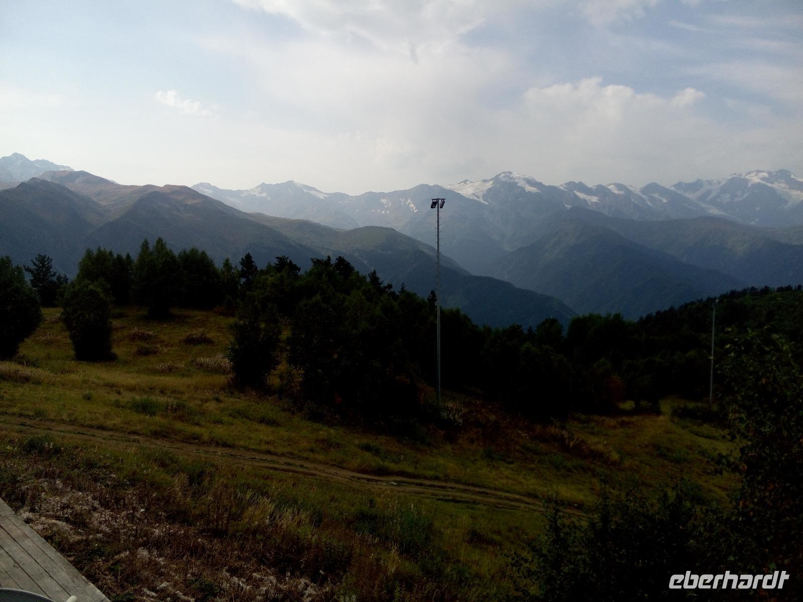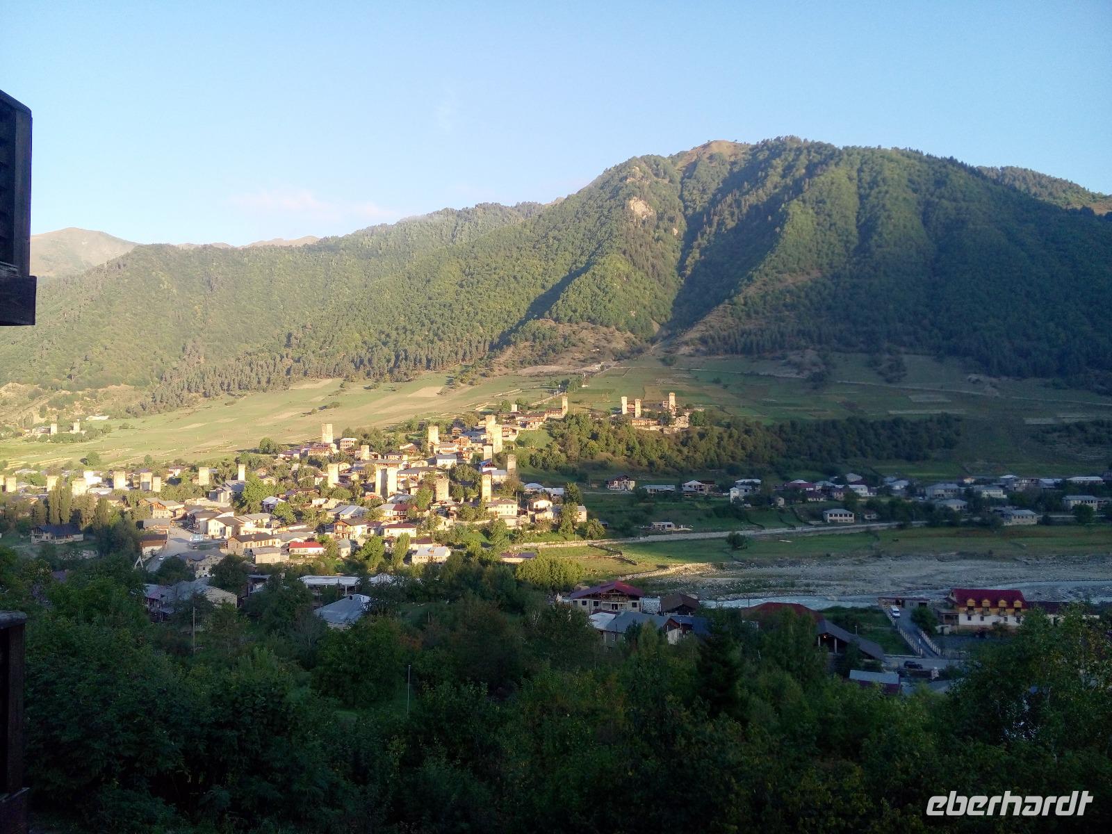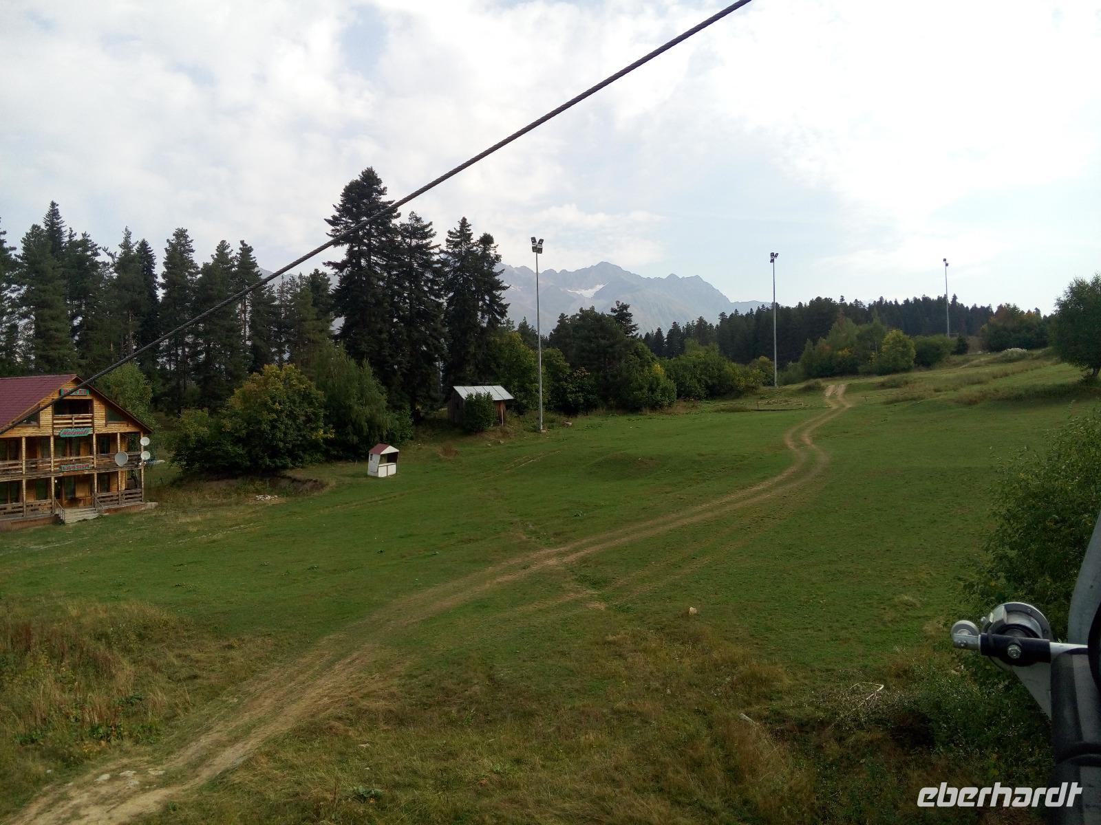 Das Wetter war gut, also haben wir den Plan etwas umgeändert und sind zuerst zu dem Sessellift gefahren. Eine 20 minütige Fahrt mit dem Sessellift kostete ca. 2 Euro. Wir waren auf dem Berg wo man das ganze Swanetien sehen konnte. Nach der erfrischenden Tasse Kaffee sind wir runtergefahren in die Stadt von Mestia. Unser Mittagessen war bei einem Restaurant, wo man Deutsch gesprochen hat, also gab es keine Probleme, um sich zu verständigen. Generell, sprechen 80 % der Bevölkerung in Georgien Russisch, also haben wir unsere Schulkenntnisse von dieser Sprache aufgefrischt.