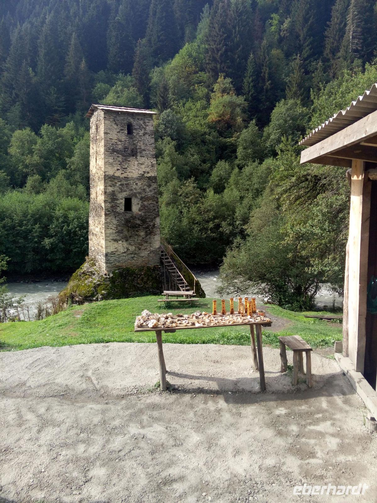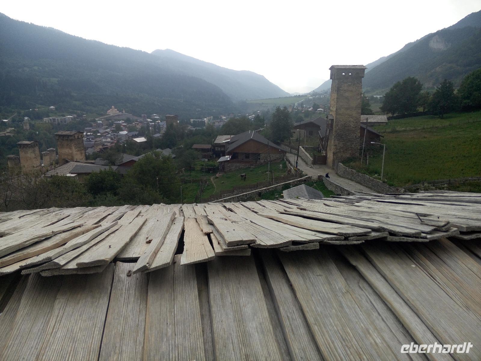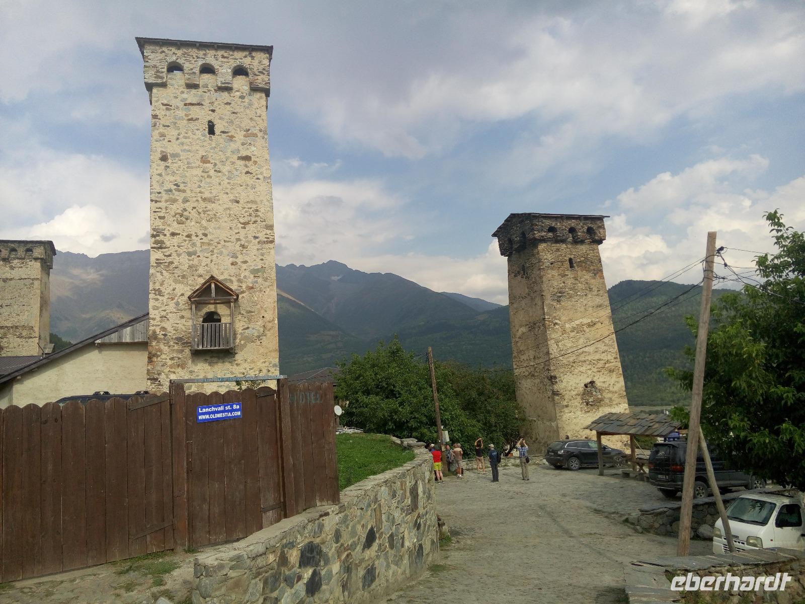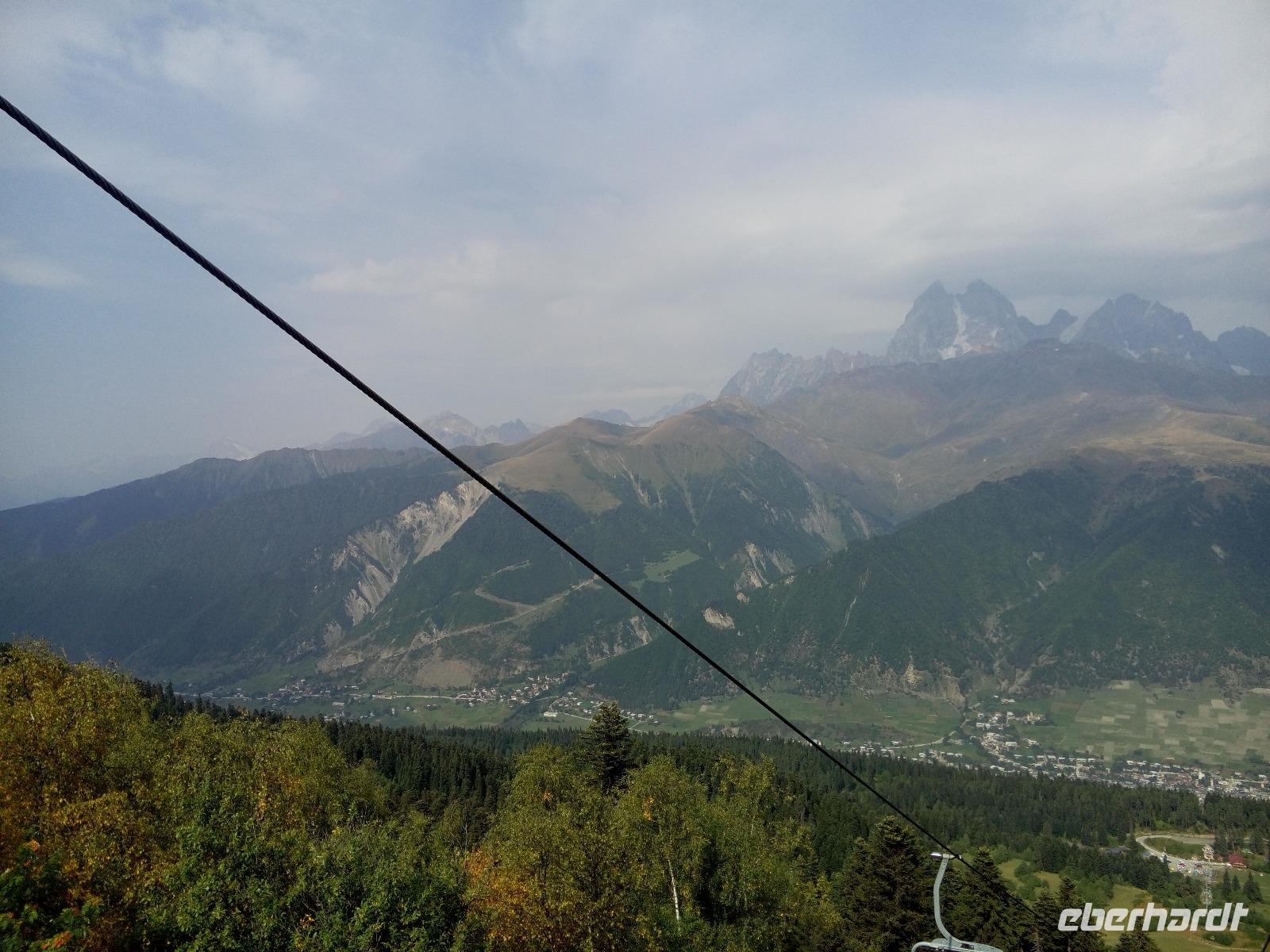 Das Wetter war gut, also haben wir den Plan etwas umgeändert und sind zuerst zu dem Sessellift gefahren. Eine 20 minütige Fahrt mit dem Sessellift kostete ca. 2 Euro. Wir waren auf dem Berg wo man das ganze Swanetien sehen konnte. Nach der erfrischenden Tasse Kaffee sind wir runtergefahren in die Stadt von Mestia. Unser Mittagessen war bei einem Restaurant, wo man Deutsch gesprochen hat, also gab es keine Probleme, um sich zu verständigen. Generell, sprechen 80 % der Bevölkerung in Georgien Russisch, also haben wir unsere Schulkenntnisse von dieser Sprache aufgefrischt.