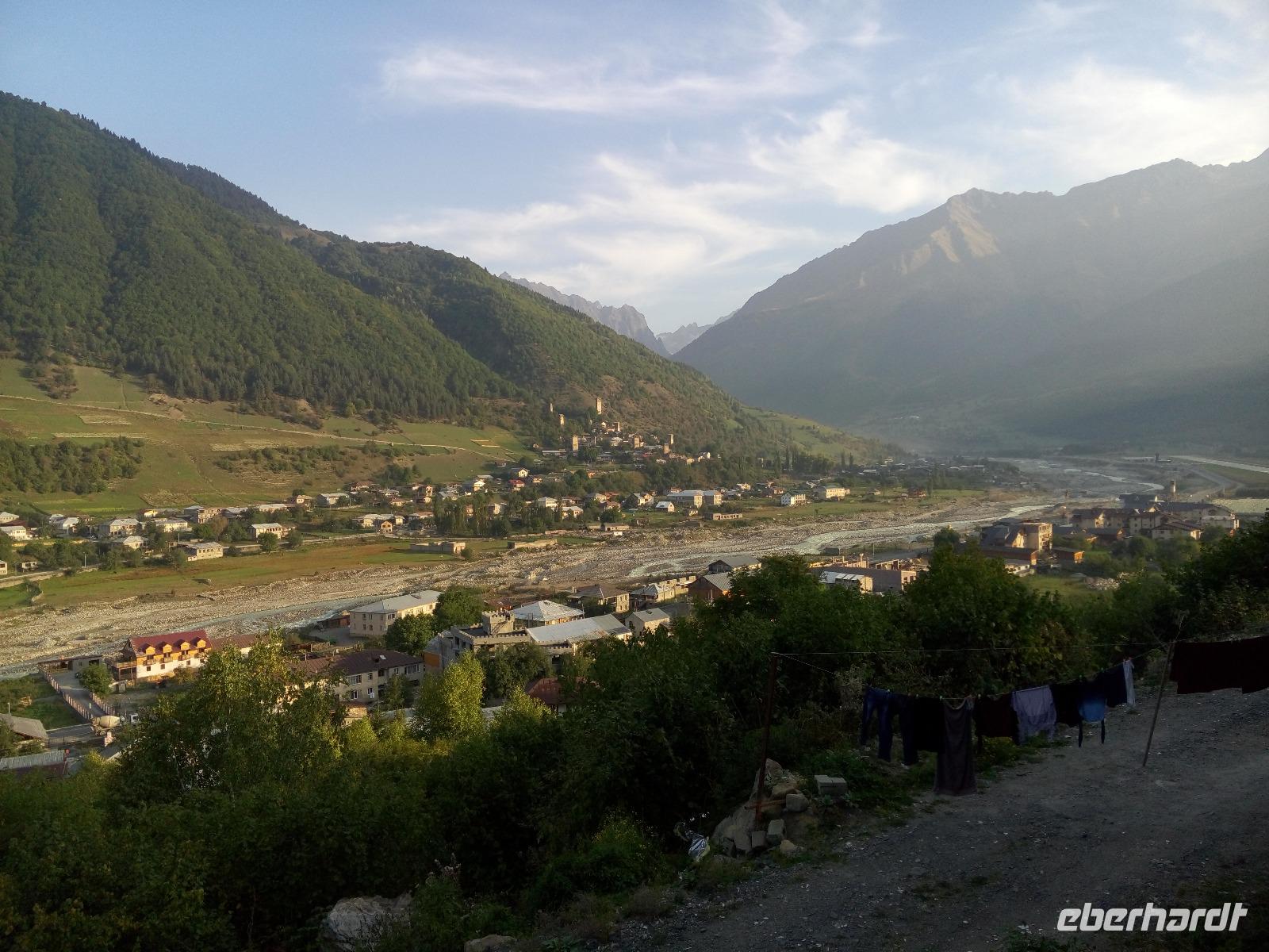 Kurz vor 21 Uhr sind wir nach Mestia angekommen. Es war schon dunkel, also haben wir nicht viel von der Umgebung des Hotels gesehen. Zum Abendbrot haben wir verschiedene Salate bekommen, Fleisch und reichlich Wein. Der lange Tag war um, und nach dem kurzen Aufenthalt in der Bar sind wir alle in unsere Zimmer gegangen.