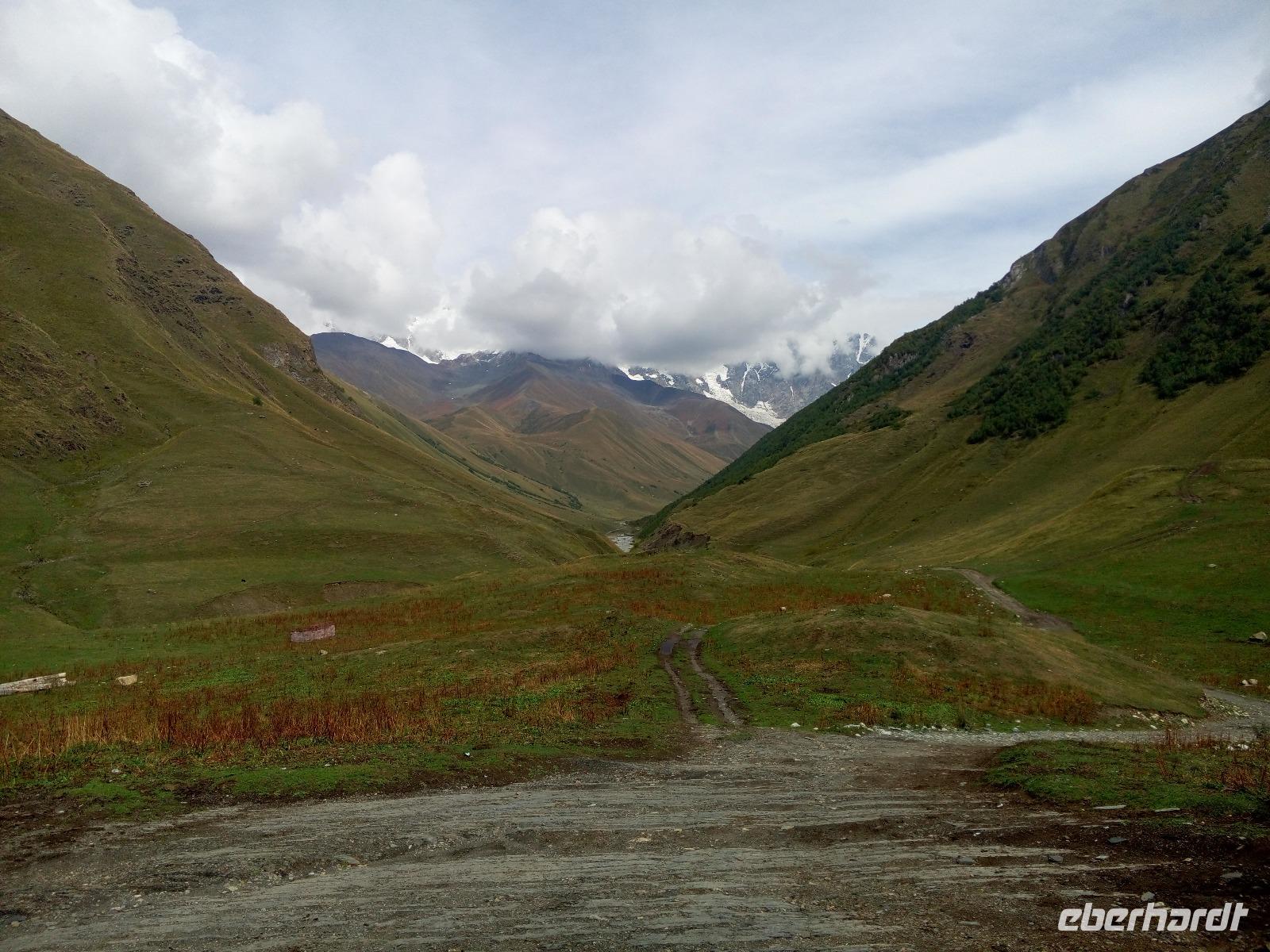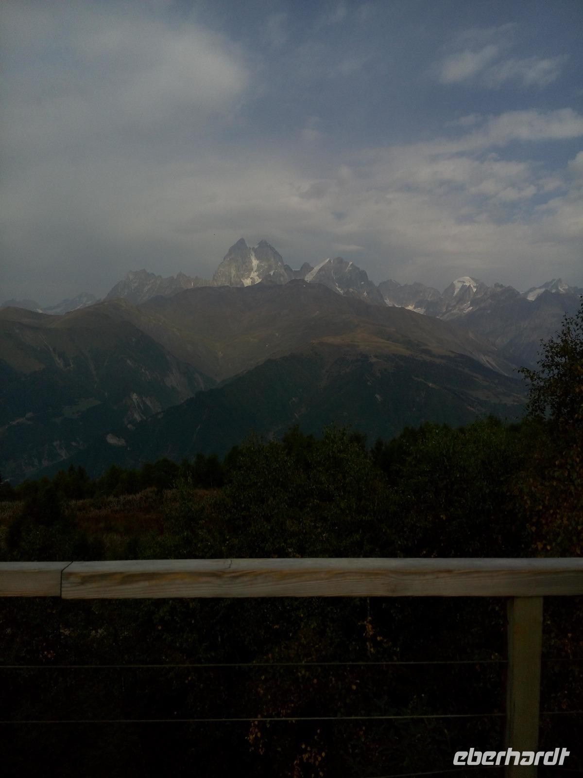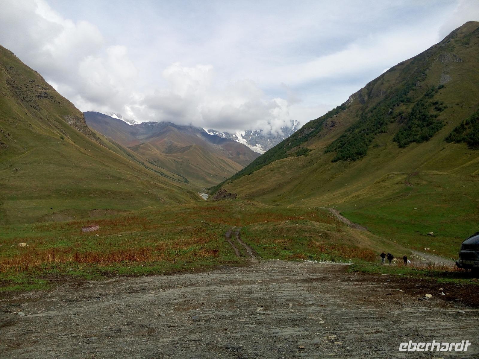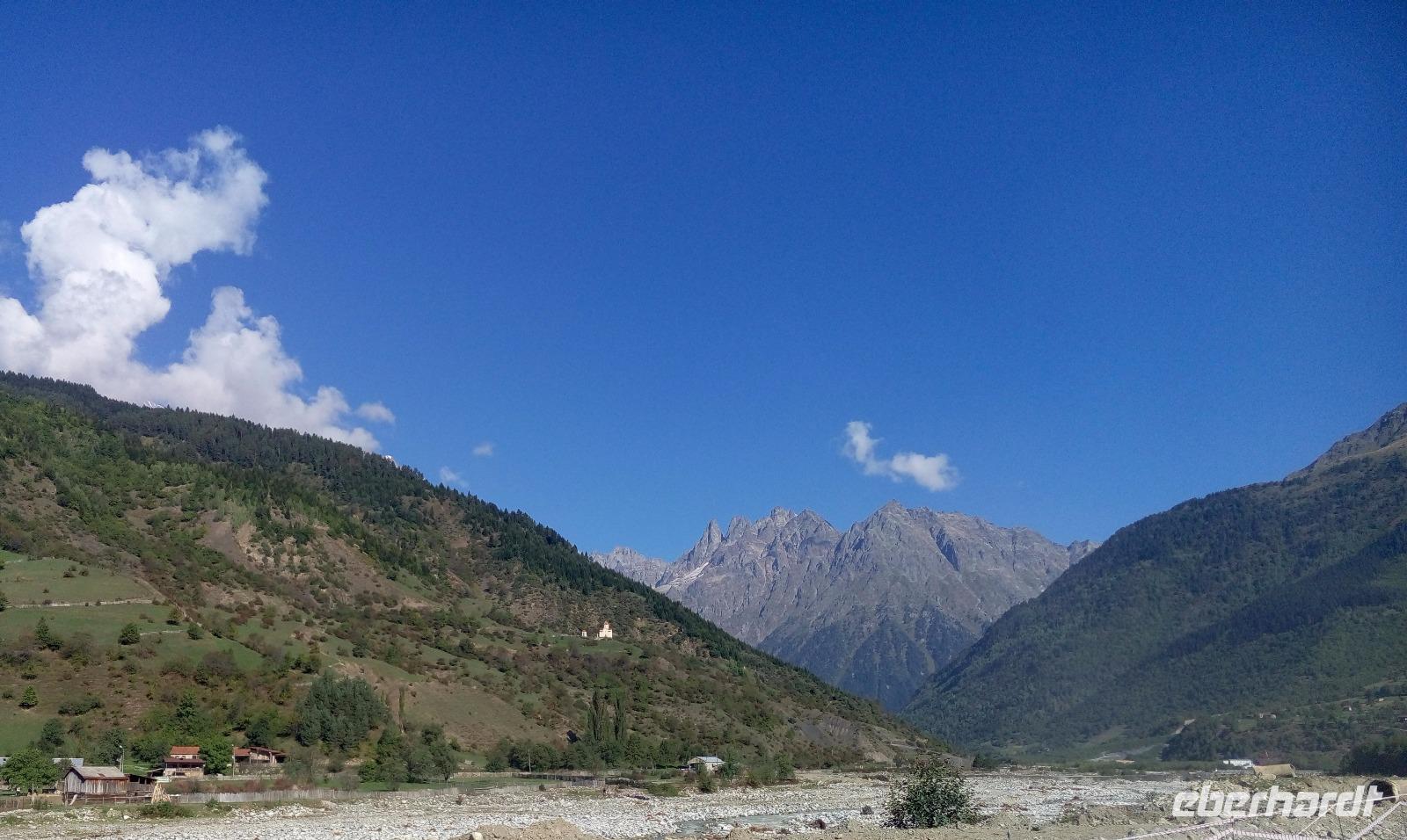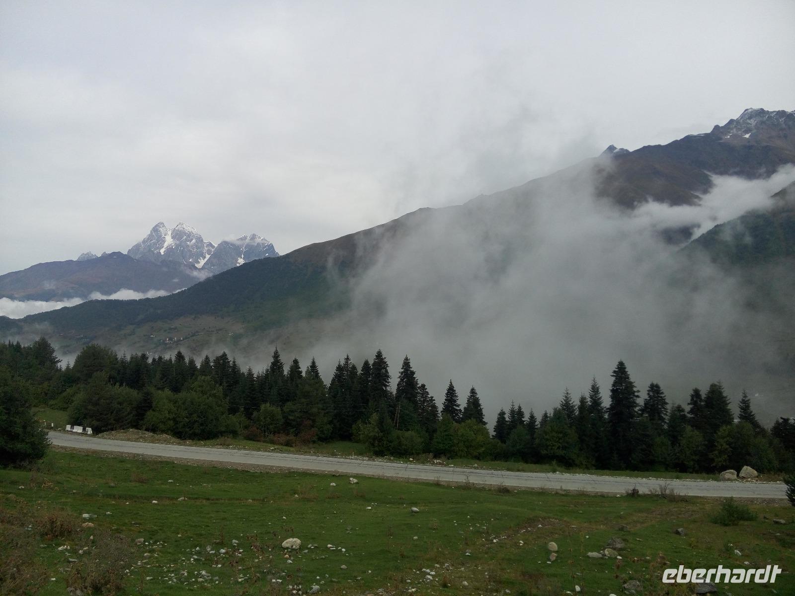 An diesem Tag war die Reise zu dem höchsten Dorf Europas geplant. Als wir gefrühstückt haben, waren schon Natja und die Fahrer von Jeeps da und haben auf uns gewartet. Auf unsere Frage, wie der Weg sei, haben wir eine geheimnisvolle Antwort bekommen: "nicht gut, aber auch nicht sehr schlecht". Damit konnten wir wenig anfangen, also haben wir uns unserem Schicksal überlassen. Und schon fing die Reise an. Der Himmel war ab und zu mit den Wolken bedeckt, aber gerade so, damit wir die zweiköpfige Uschba fotografieren konnten. Bis zum 1905 galt der Südgipfel von Uschba als der schwierigste Berg der Welt. Immer mit den kleinen Pausen bei der Turm der Liebe, bei einer alten kleinen Kirche oder einfach so, wo wir Fotos machen konnten sind wir Richtung Uschguli gefahren.
