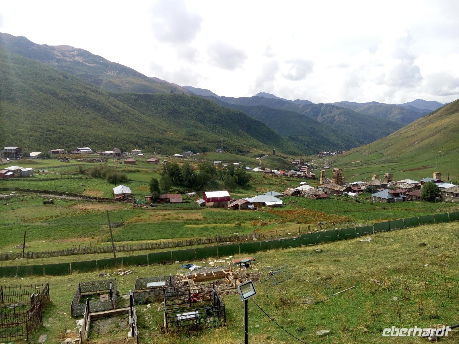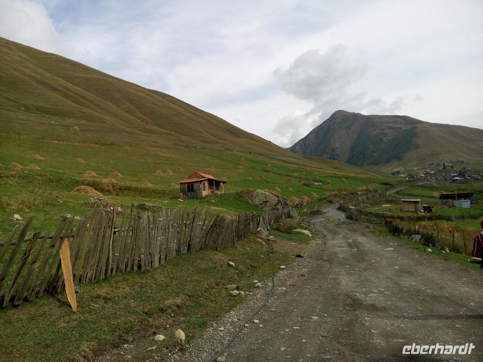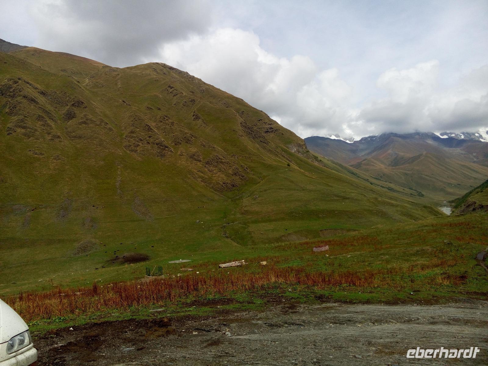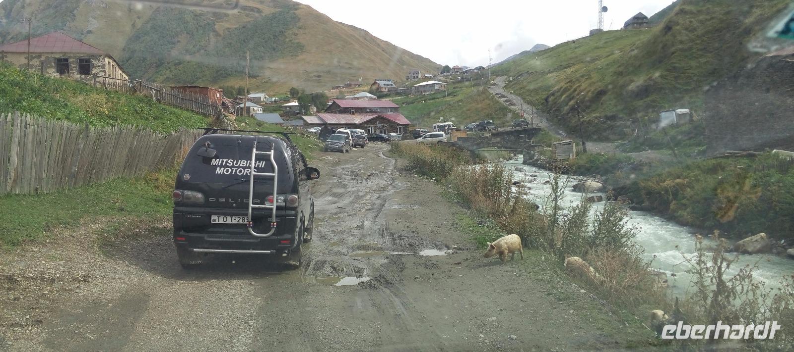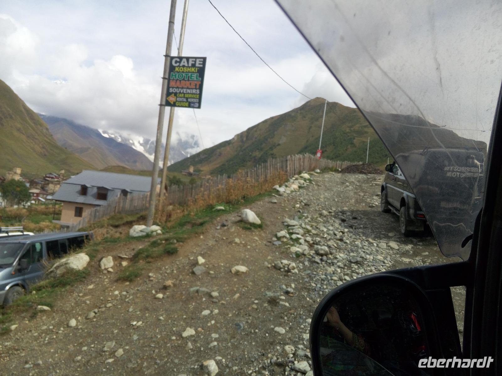 Uschguli, so heisst eine Gemeinschaft von 4 Dörfern, die sich auf der Höhe von 2200 Meter über dem Meeresspiegel befindet. Sie gilt als höchste in Europa. Da gibt es eine kleine Schule, 70 bis 80 Familien leben dort. Unsere Hinfahrt hat ca. 2,5 Stunden gedauert. In dieser Zeit haben wir die Distanz von 40-50 km gemacht, die Mestia von Uschguli trennen. Da haben wir grade den Satz von Vormittag verstanden: "nicht gut" entspricht vollkommen der Wahrheit, aber man freut sich, dass es überhaupt einen Weg gibt, daher die Fortsetzung "aber auch nicht sehr schlecht". Ich kann Euch versichern, dass das, was "sehr schlecht" ist, wollte ich nicht erleben. ;-)