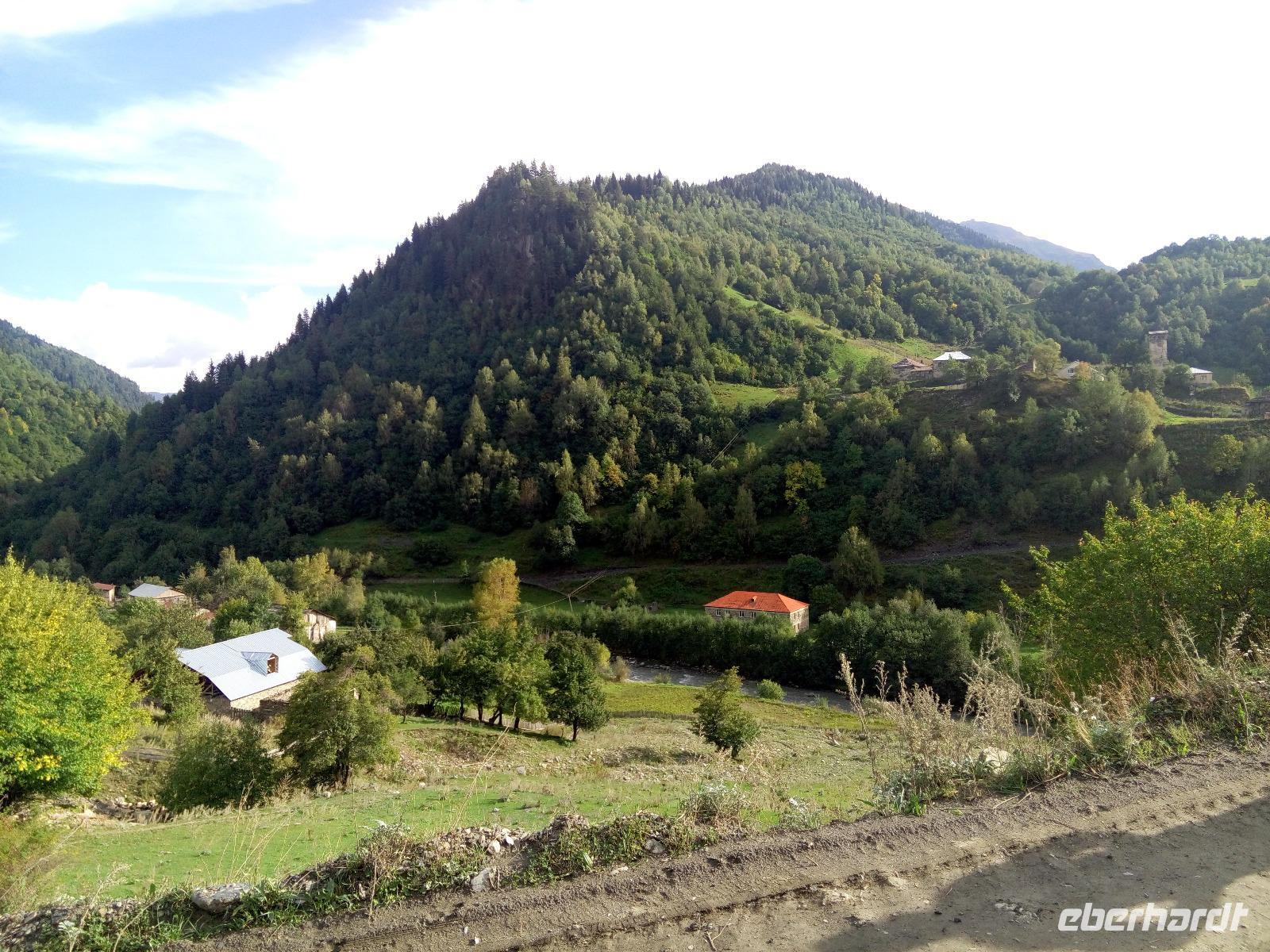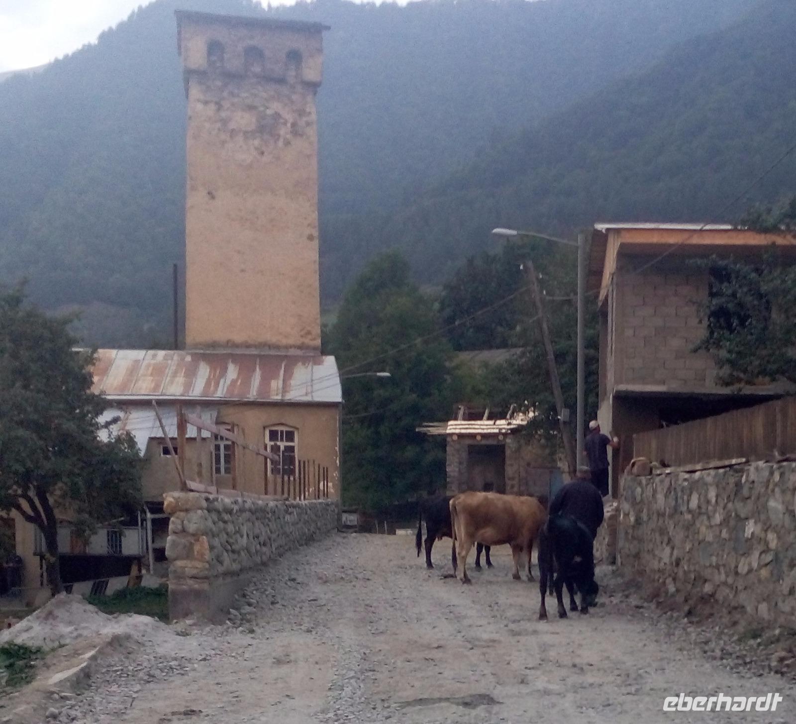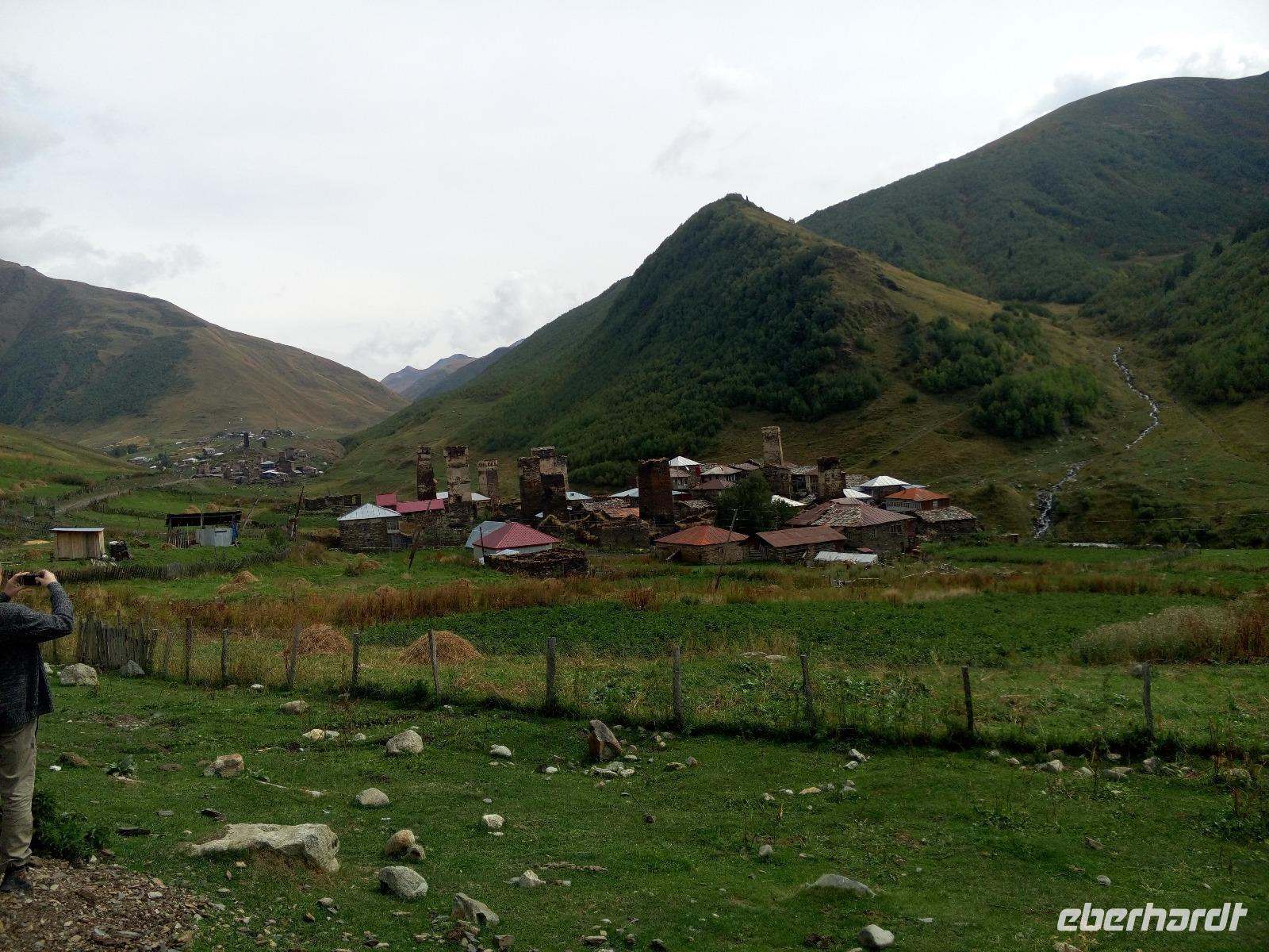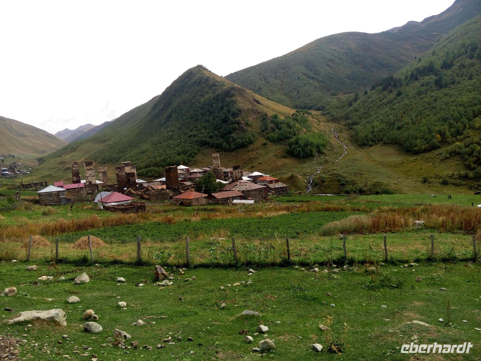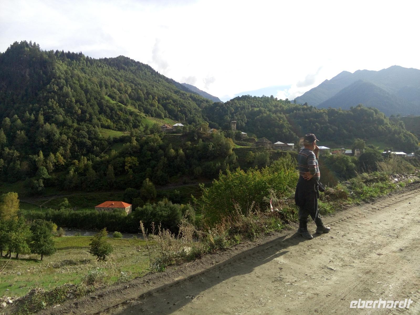 Uschguli, so heisst eine Gemeinschaft von 4 Dörfern, die sich auf der Höhe von 2200 Meter über dem Meeresspiegel befindet. Sie gilt als höchste in Europa. Da gibt es eine kleine Schule, 70 bis 80 Familien leben dort. Unsere Hinfahrt hat ca. 2,5 Stunden gedauert. In dieser Zeit haben wir die Distanz von 40-50 km gemacht, die Mestia von Uschguli trennen. Da haben wir grade den Satz von Vormittag verstanden: "nicht gut" entspricht vollkommen der Wahrheit, aber man freut sich, dass es überhaupt einen Weg gibt, daher die Fortsetzung "aber auch nicht sehr schlecht". Ich kann Euch versichern, dass das, was "sehr schlecht" ist, wollte ich nicht erleben. ;-)