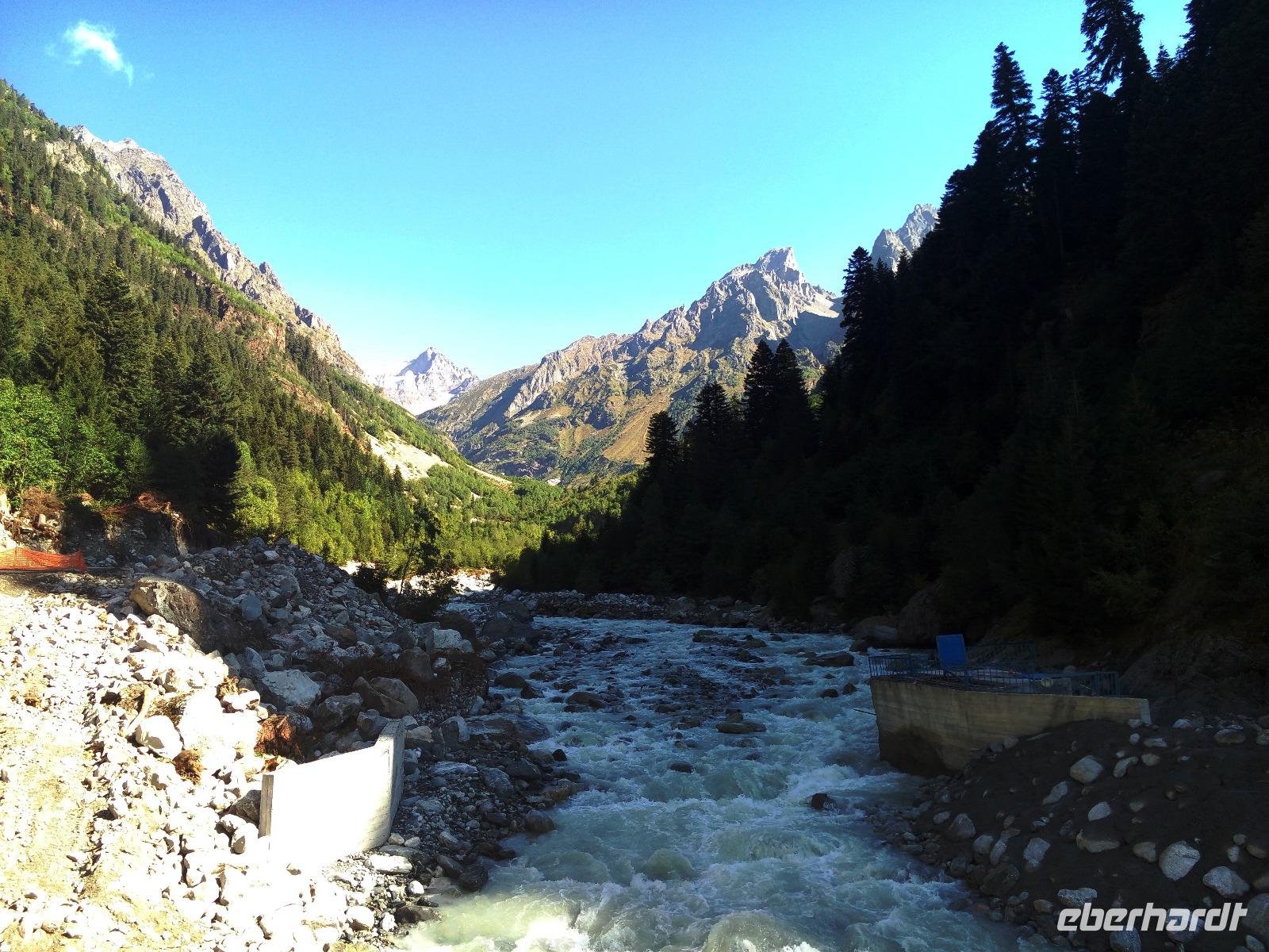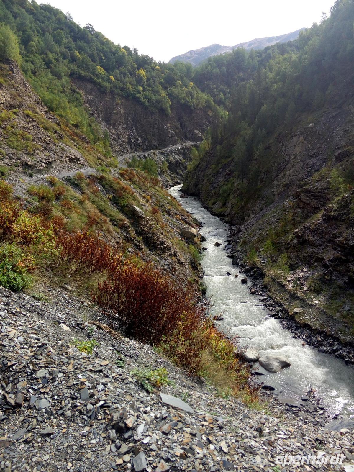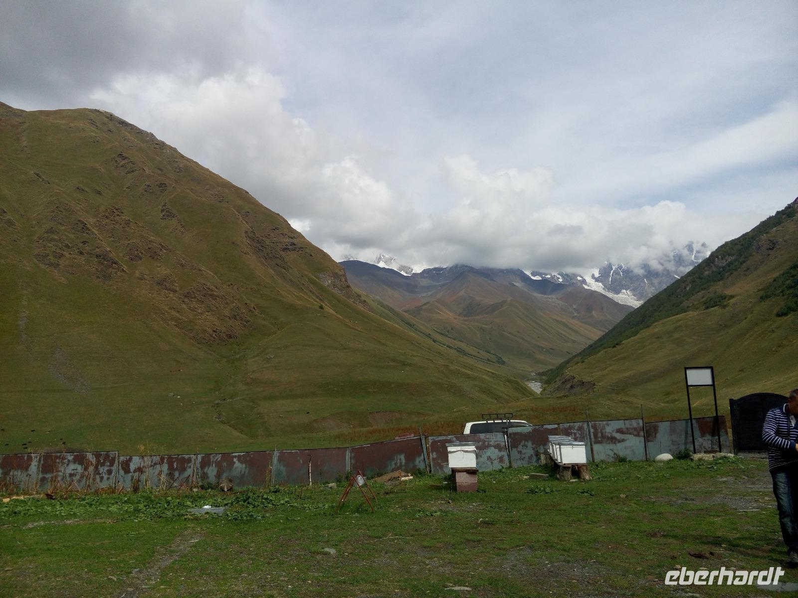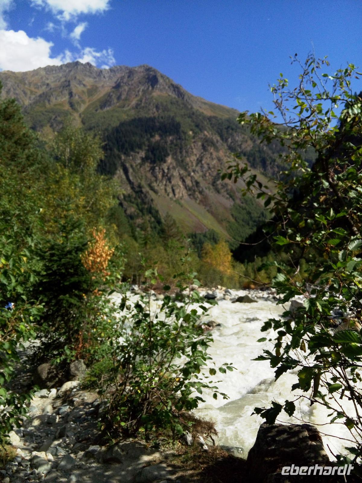 Heute früh waren Natja und ich einkaufen. Es wurde eine Wanderung zu dem Gletscher angesagt und wir haben ein Picknick vorbereitet. Pünktlich um 10:07 haben wir angefangen. Nach ca. 30 minütigen Fahrt mit unseren Jeeps sind wir ausgestiegen, haben eine kleine Brücke überquert und unsere Wanderung angefangen. Der Weg lief im Wald, war sehr angenehm. Der erste Teil war nicht so anstrengend, aber nach ca. 1,5 km wurde es komplizierter. Überall lagen große Steine. Bei dem Gletscher war viel los. Es war eine Gruppe von 30 Russen dabei. Wir haben nur den ersten Teil von dem Gletscher gesehen. Die Blicke waren herrlich, das Wetter war fantastisch. Sogar auf dieser Höhe war es warm. Ein Teil von den Russen ist mit ihrem Guide noch höher gegangen. Aber da brauchte man viel mehr Erfahrung, bessere Schuhe und so weiter. Wir entgegen sind nach einer Pause zurückgekehrt. Auf der Hälfte der Strecke haben wir ein Lagerfeuer gemacht und ein kleines Picknick vorbereitet. Aus den Ästen die überall lagen, haben wir paar Spieße gebastelt und Brot und Wurst auf dem Feuer gebraten. Mmmm, war das lecker. In Georgien, wie in Russland, kann man Feuer überall machen, es ist nicht verboten. Der Fluss mit dem kalten Wasser war daneben, da haben wir Bier und Wein kaltgestellt. Später haben wir das Wasser benutzt um das Feuer gründlich zu löschen.
