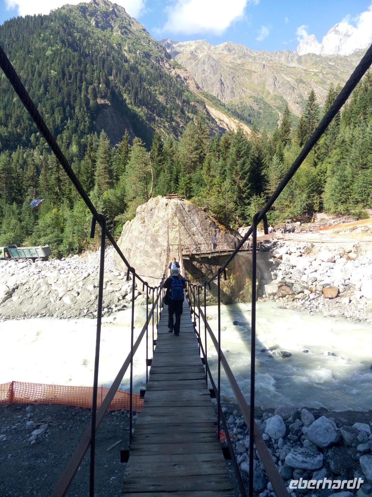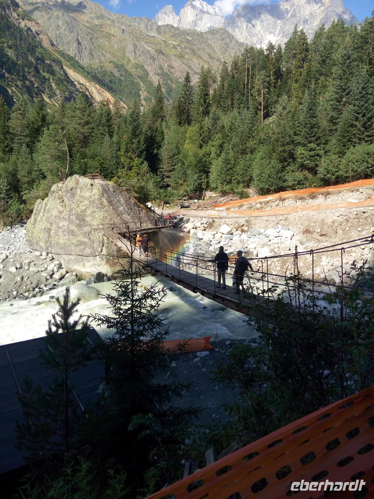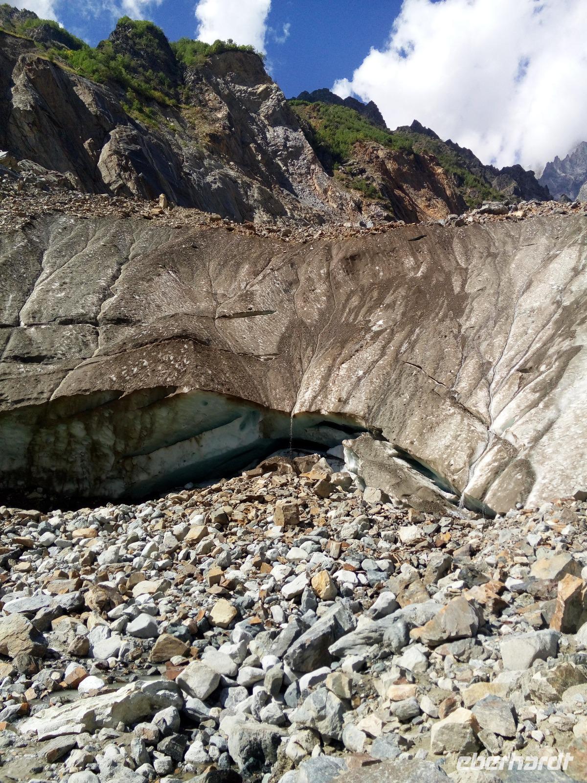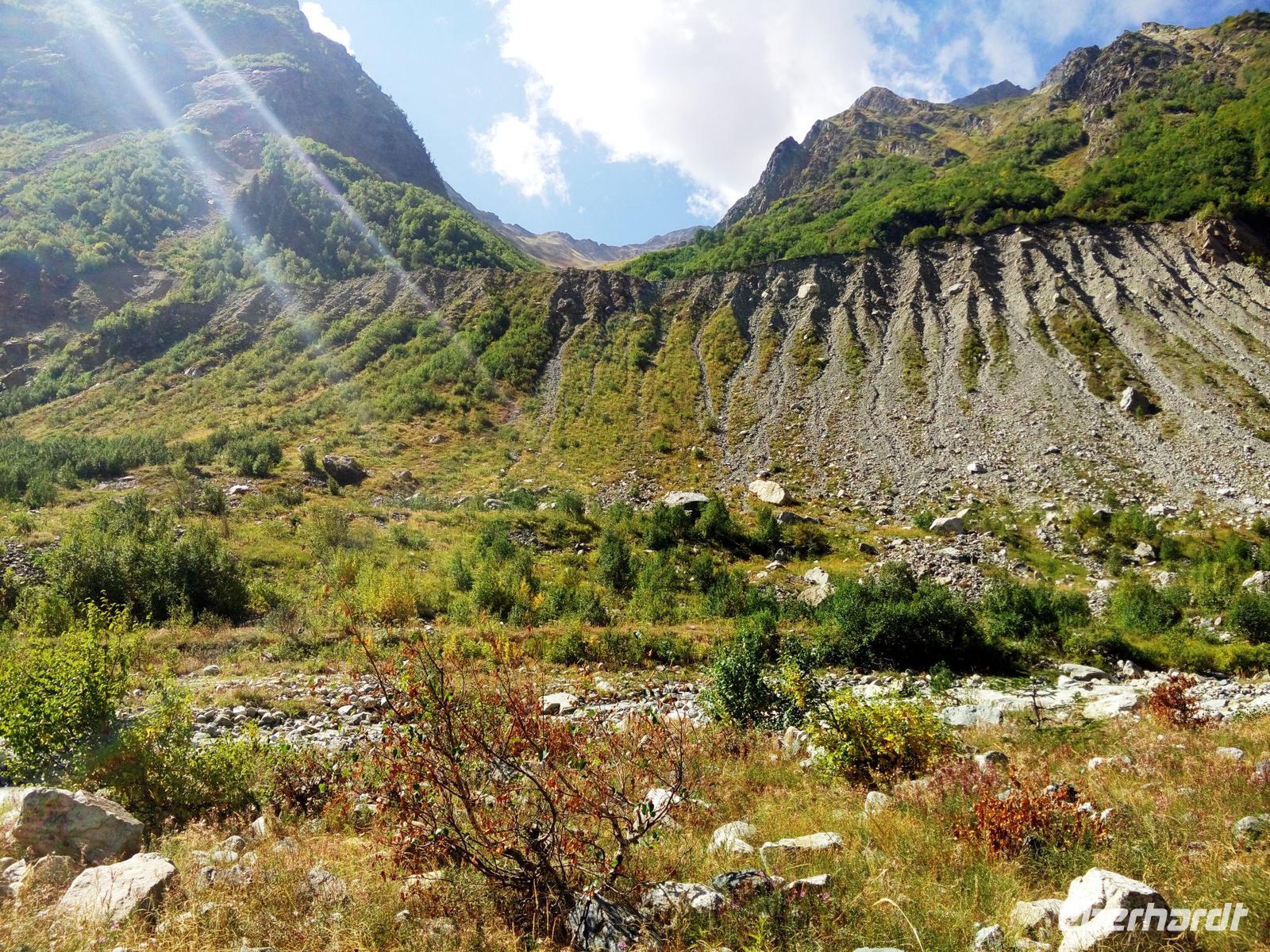 Heute früh waren Natja und ich einkaufen. Es wurde eine Wanderung zu dem Gletscher angesagt und wir haben ein Picknick vorbereitet. Pünktlich um 10:07 haben wir angefangen. Nach ca. 30 minütigen Fahrt mit unseren Jeeps sind wir ausgestiegen, haben eine kleine Brücke überquert und unsere Wanderung angefangen. Der Weg lief im Wald, war sehr angenehm. Der erste Teil war nicht so anstrengend, aber nach ca. 1,5 km wurde es komplizierter. Überall lagen große Steine. Bei dem Gletscher war viel los. Es war eine Gruppe von 30 Russen dabei. Wir haben nur den ersten Teil von dem Gletscher gesehen. Die Blicke waren herrlich, das Wetter war fantastisch. Sogar auf dieser Höhe war es warm. Ein Teil von den Russen ist mit ihrem Guide noch höher gegangen. Aber da brauchte man viel mehr Erfahrung, bessere Schuhe und so weiter. Wir entgegen sind nach einer Pause zurückgekehrt. Auf der Hälfte der Strecke haben wir ein Lagerfeuer gemacht und ein kleines Picknick vorbereitet. Aus den Ästen die überall lagen, haben wir paar Spieße gebastelt und Brot und Wurst auf dem Feuer gebraten. Mmmm, war das lecker. In Georgien, wie in Russland, kann man Feuer überall machen, es ist nicht verboten. Der Fluss mit dem kalten Wasser war daneben, da haben wir Bier und Wein kaltgestellt. Später haben wir das Wasser benutzt um das Feuer gründlich zu löschen.