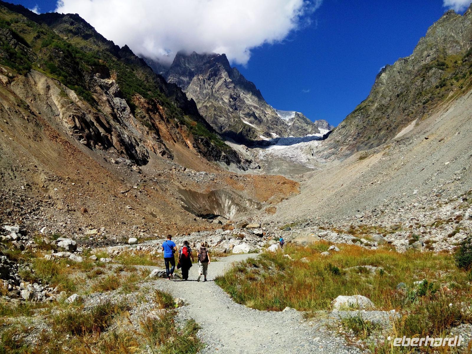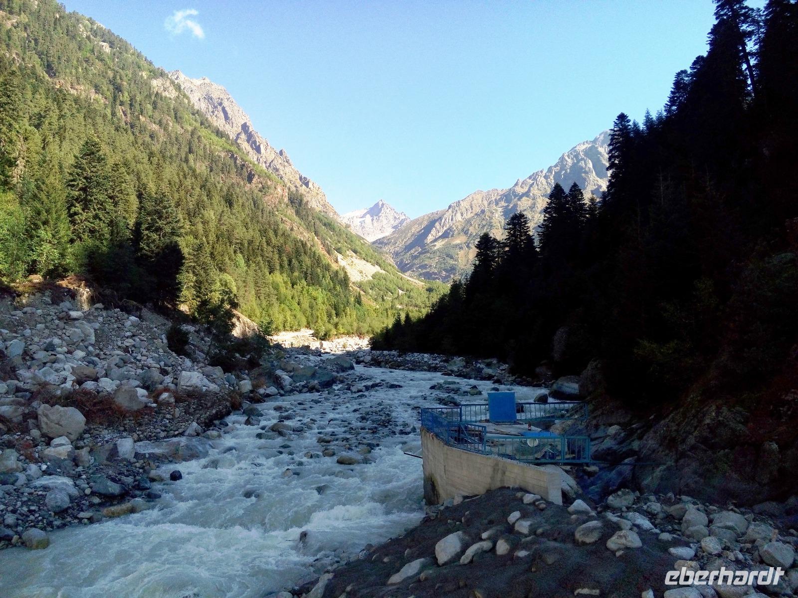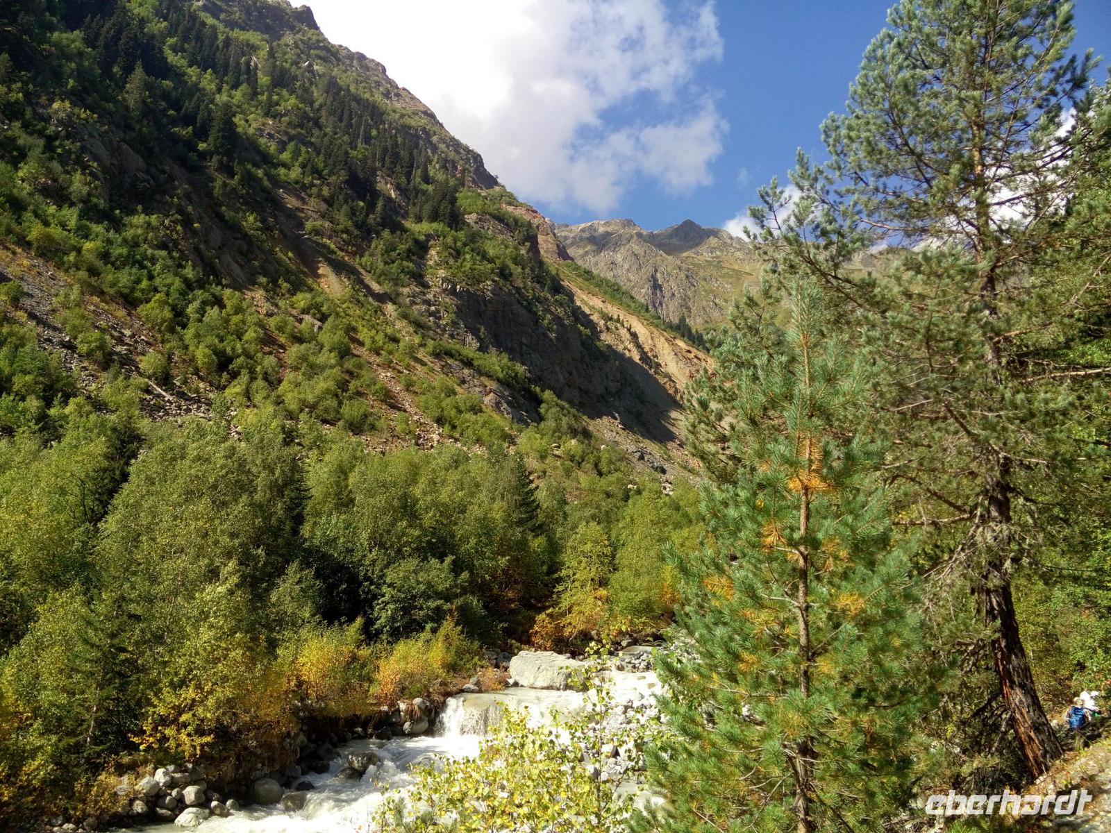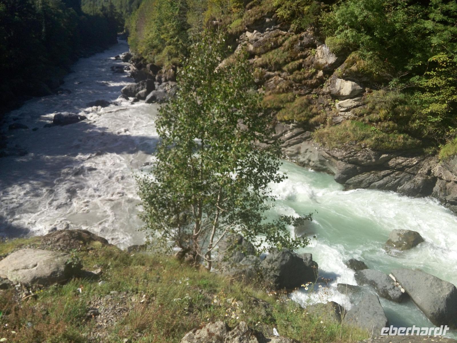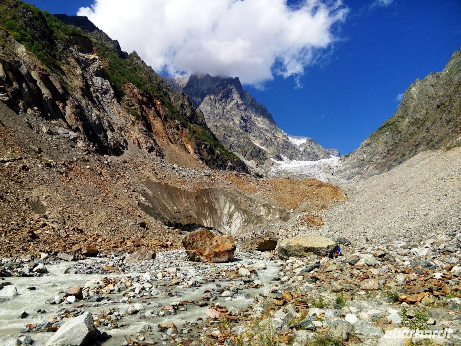 Heute früh waren Natja und ich einkaufen. Es wurde eine Wanderung zu dem Gletscher angesagt und wir haben ein Picknick vorbereitet. Pünktlich um 10:07 haben wir angefangen. Nach ca. 30 minütigen Fahrt mit unseren Jeeps sind wir ausgestiegen, haben eine kleine Brücke überquert und unsere Wanderung angefangen. Der Weg lief im Wald, war sehr angenehm. Der erste Teil war nicht so anstrengend, aber nach ca. 1,5 km wurde es komplizierter. Überall lagen große Steine. Bei dem Gletscher war viel los. Es war eine Gruppe von 30 Russen dabei. Wir haben nur den ersten Teil von dem Gletscher gesehen. Die Blicke waren herrlich, das Wetter war fantastisch. Sogar auf dieser Höhe war es warm. Ein Teil von den Russen ist mit ihrem Guide noch höher gegangen. Aber da brauchte man viel mehr Erfahrung, bessere Schuhe und so weiter. Wir entgegen sind nach einer Pause zurückgekehrt. Auf der Hälfte der Strecke haben wir ein Lagerfeuer gemacht und ein kleines Picknick vorbereitet. Aus den Ästen die überall lagen, haben wir paar Spieße gebastelt und Brot und Wurst auf dem Feuer gebraten. Mmmm, war das lecker. In Georgien, wie in Russland, kann man Feuer überall machen, es ist nicht verboten. Der Fluss mit dem kalten Wasser war daneben, da haben wir Bier und Wein kaltgestellt. Später haben wir das Wasser benutzt um das Feuer gründlich zu löschen.