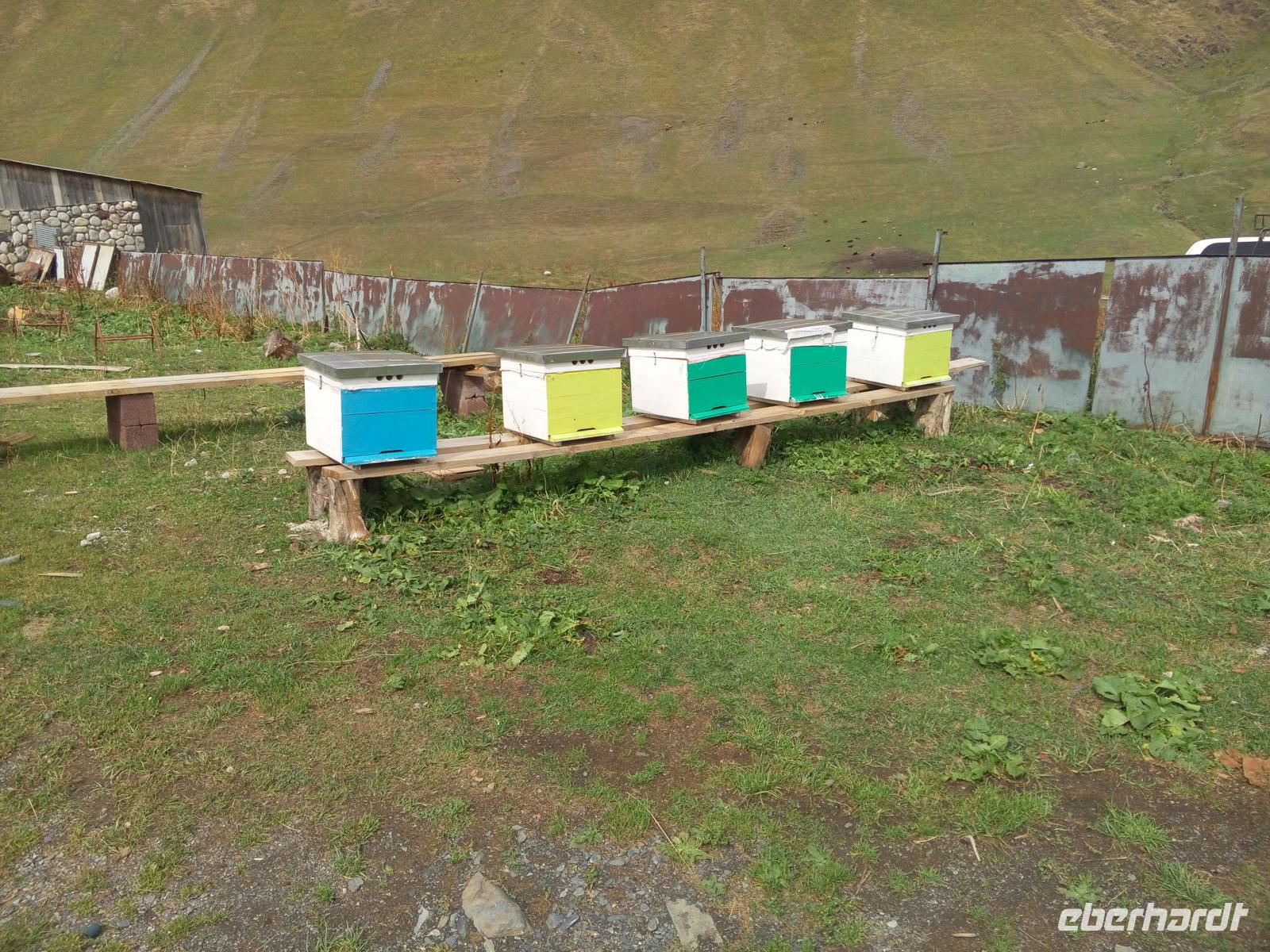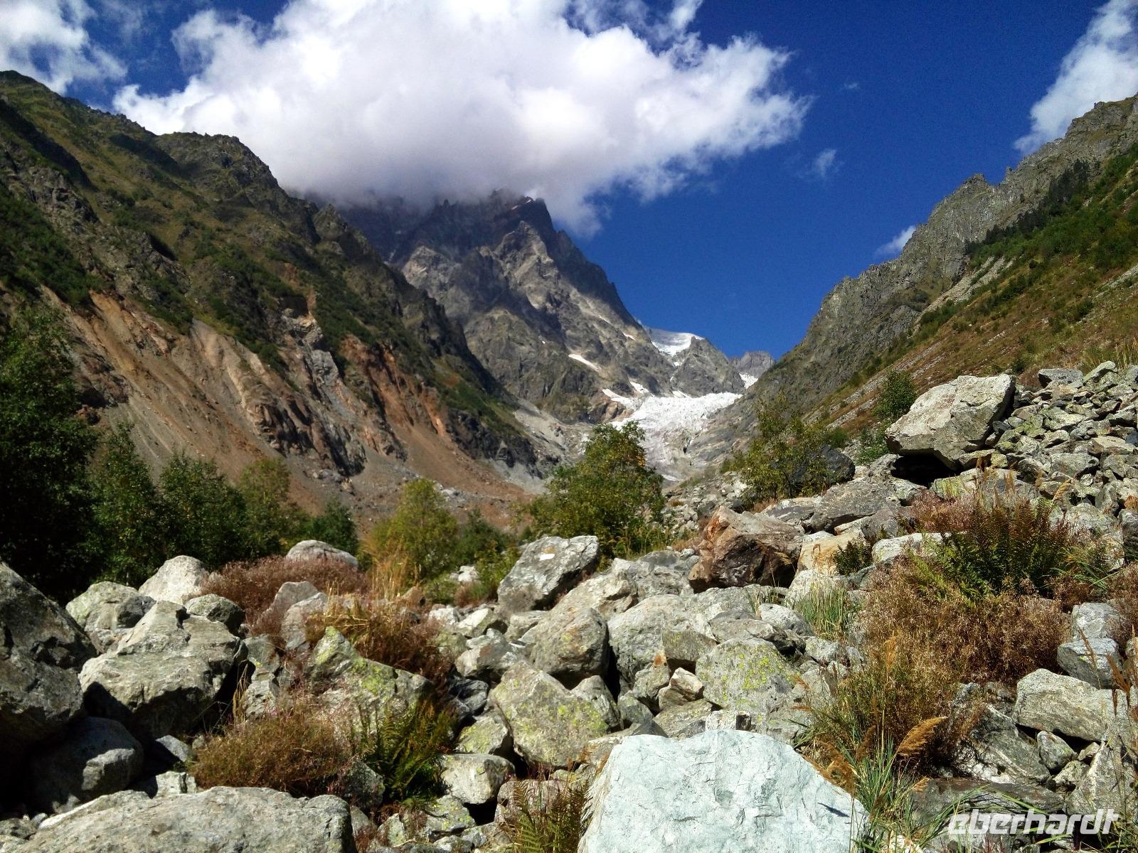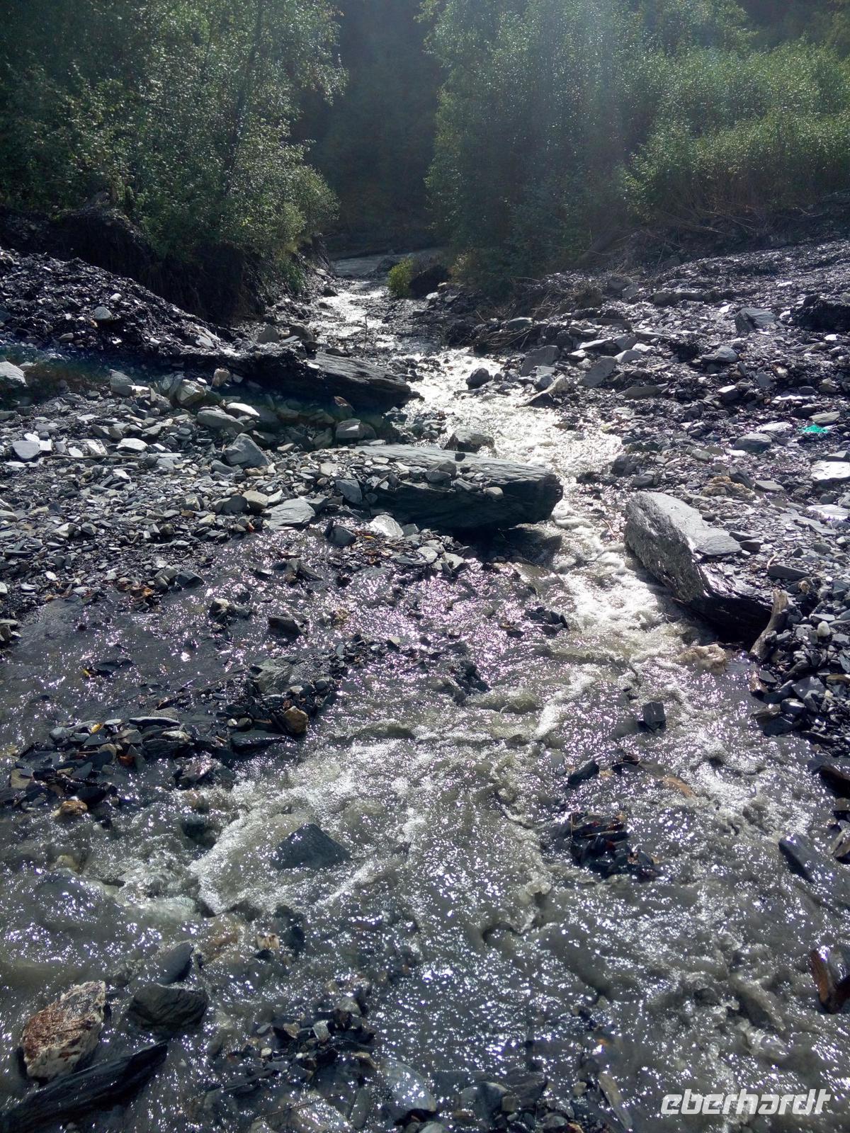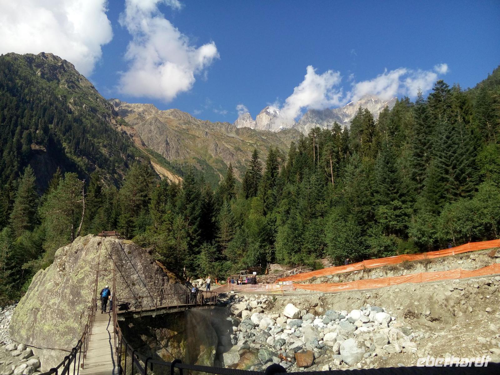 Heute früh waren Natja und ich einkaufen. Es wurde eine Wanderung zu dem Gletscher angesagt und wir haben ein Picknick vorbereitet. Pünktlich um 10:07 haben wir angefangen. Nach ca. 30 minütigen Fahrt mit unseren Jeeps sind wir ausgestiegen, haben eine kleine Brücke überquert und unsere Wanderung angefangen. Der Weg lief im Wald, war sehr angenehm. Der erste Teil war nicht so anstrengend, aber nach ca. 1,5 km wurde es komplizierter. Überall lagen große Steine. Bei dem Gletscher war viel los. Es war eine Gruppe von 30 Russen dabei. Wir haben nur den ersten Teil von dem Gletscher gesehen. Die Blicke waren herrlich, das Wetter war fantastisch. Sogar auf dieser Höhe war es warm. Ein Teil von den Russen ist mit ihrem Guide noch höher gegangen. Aber da brauchte man viel mehr Erfahrung, bessere Schuhe und so weiter. Wir entgegen sind nach einer Pause zurückgekehrt. Auf der Hälfte der Strecke haben wir ein Lagerfeuer gemacht und ein kleines Picknick vorbereitet. Aus den Ästen die überall lagen, haben wir paar Spieße gebastelt und Brot und Wurst auf dem Feuer gebraten. Mmmm, war das lecker. In Georgien, wie in Russland, kann man Feuer überall machen, es ist nicht verboten. Der Fluss mit dem kalten Wasser war daneben, da haben wir Bier und Wein kaltgestellt. Später haben wir das Wasser benutzt um das Feuer gründlich zu löschen.