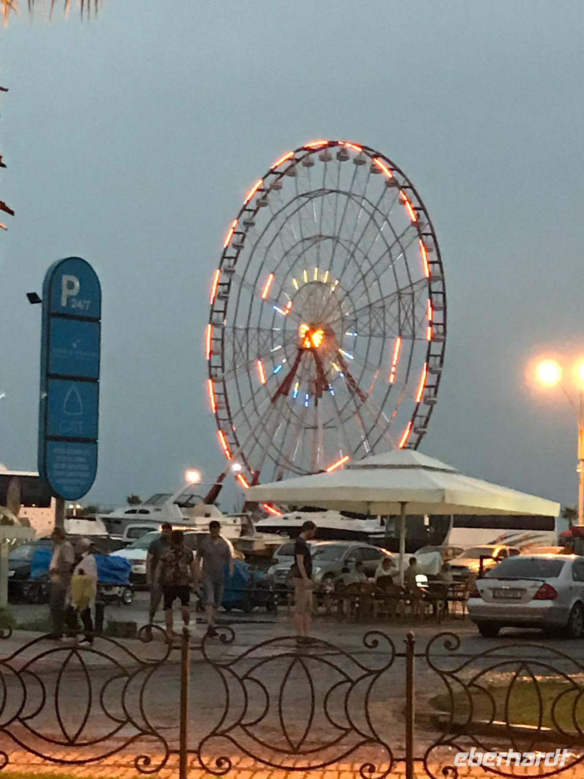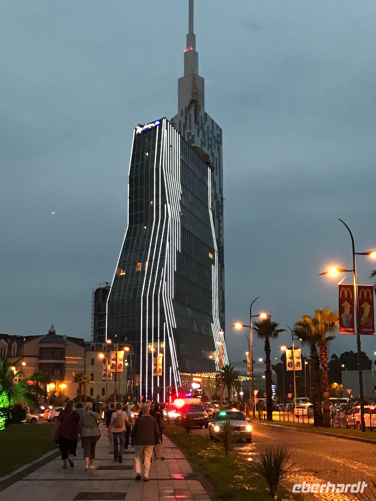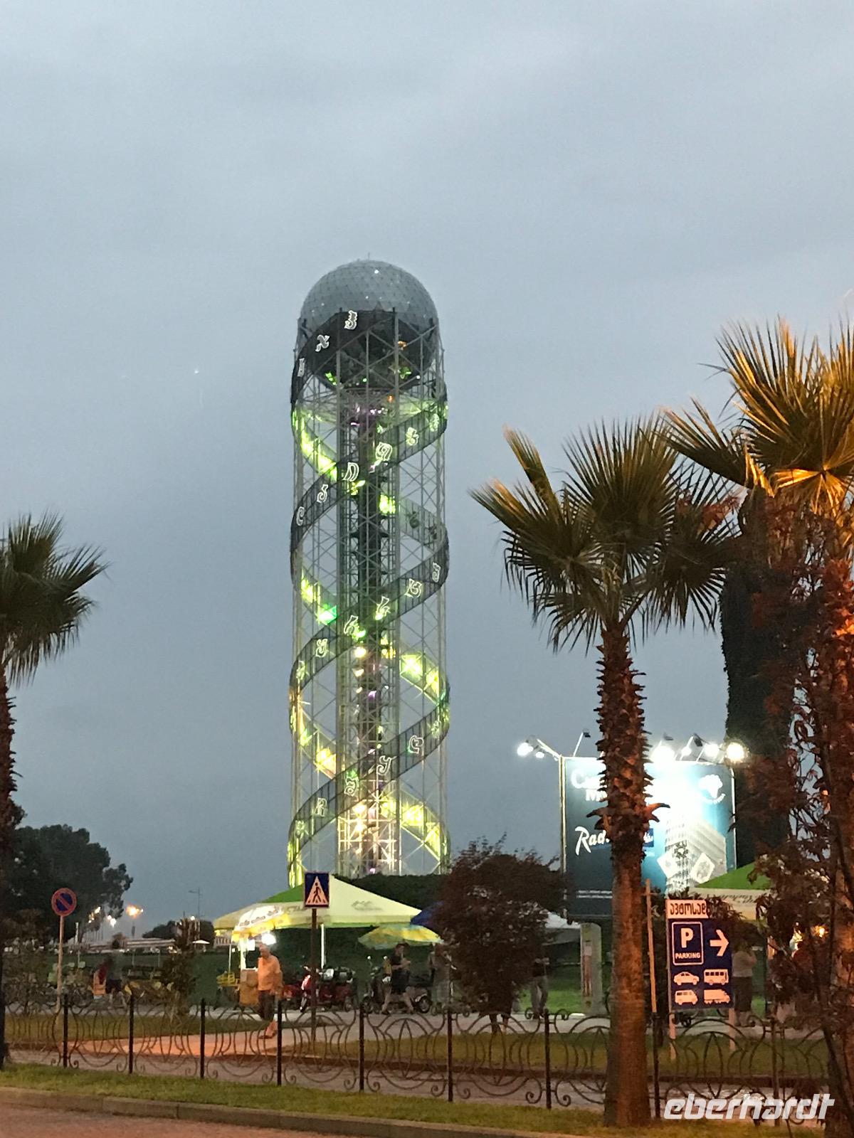Unsere freundliche örtliche Reiseleiterin Eka erwartete uns bereits in der Ankunftshalle. Sie beherrscht die deutsche Sprache perfekt. Zuerst galt es Geld tauschen oder am Bankomat abheben, das haben wir gleich noch am Flughafen erledigt. Dann bestiegen wir den Bus und fuhren zum Hotel Batumi World Palace. Kurzer Aufenthalt im Hotel, die Zimmer waren sehr großzügig vom Platz her und gefielen uns gut, dann ging es zum Abendessen. Da wir recht zentral untergebracht waren, hatten wir einen kurzen Weg über die Strandpromenade zum Alphabet-Tower. Wir fuhren mit dem Fahrstuhl hinauf, im Restaurant in der Kugel waren für uns Plätze reserviert. Der Ausblick von oben war spektakulär und machte den Eindruck, als ob unten auf der Strandpromenade ein Volksfest stattfinden würde mit einem Riesenrad, verschiedensten Verkaufsständen und vielen Menschen. Die Strandpromenade und die vor Anker liegenden Schiffe machten uns bewusst - wir sind am Schwarzen Meer. Es folgte ein erstes Kennenlernen der Gäste untereinander, der georgischen Speisen und des georgischen Lebensstils. Einige von uns blieben dem Bier treu, wenn es auch georgisches war, andere bevorzugten den Wein im Land des Weins, von trocken über halbtrocken und halbsüß bis süß. Der Abend wurde noch lang, das Leben hier lief auch langsamer, wir waren erst kurz vor Mitternacht wieder im Hotel.