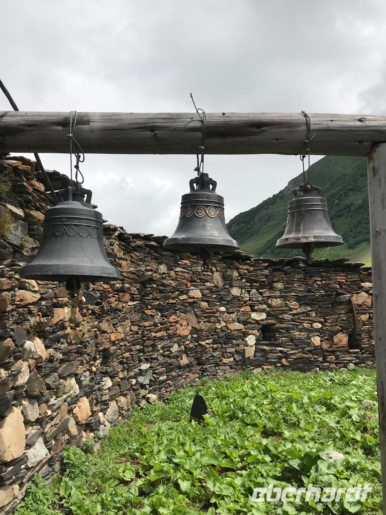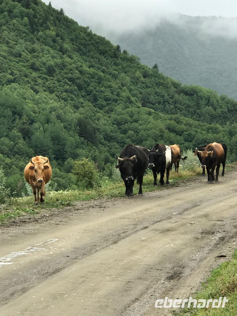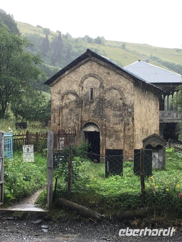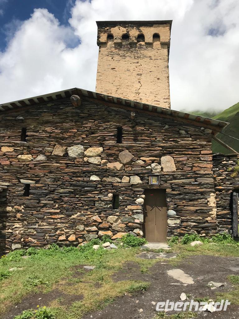 Unser Ziel an diesem Tag war das höchstgelegene, ganzjährig bewohnte Dorf in Europa - Ushguli auf 2.200 m Höhe. Wir nutzten erneut die Jeeps, es war ein beschwerlicher Weg. Unterwegs gab es eine ganze Reihe an Baustellen, wo man einfach hindurchfährt. Aber der Regen hatte die Wege auch aufgeweicht und das Wasser stürzte oft gerade über die Straße zum Tal. Am Wegesrand besuchten wir den Turm der Liebe und Eka erzählte uns die traurig endende Liebesgeschichte. Ein Stück weiter am Wege lag die kleine Kirche Santa Barbara, in der noch originale swanetische Wandmalereien und Ikonen bewundert werden können. In Ushguli hielten wir direkt oberhalb des Dorfes und staunten über die vielen Wehrtürme und Machubis, die zum Teil in einem erbärmlichen baulichen Zustand sind. Auf unserem Weg dann die Haustiere, unsere steten Begleiter, und mutige Wanderer aus aller Herren Ländern. Leider konnten wir die Gipfel des Shkhara mit 5.068 m nicht sehen. Die Wolken zogen noch immer nicht ab. Zu Fuß stiegen wir hinauf zur Lamaria-Kirche, wo wir auch einem Mönch begegneten. Das Mittagessen hatten wir dann ganz rustikal und wandermäßig im Café Koshki, bevor wir uns auf den Rückweg begaben. Am Abend waren wir bei einer anderen Familie in Mestia eingeladen. Auch hier erwartete uns eine großartige swanische Tafel mit den Kostbarkeiten des Landes, liebevoll zubereitet durch die Herrin des Hauses. Manch einer durfte auch einen Blick in eine traditionelle und doch so moderne Küche werfen. Wir waren dankbar für so viel Gastfreundschaft.