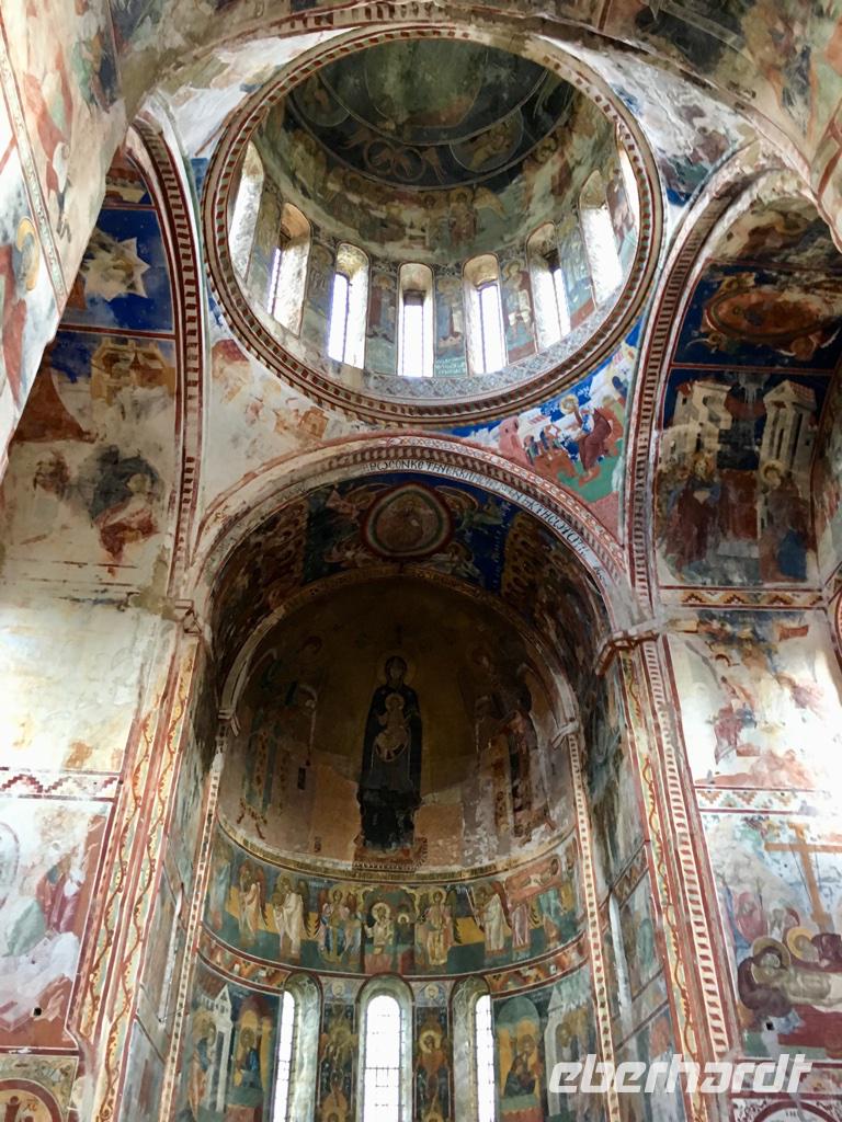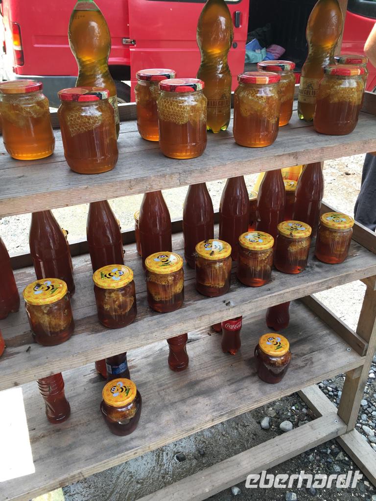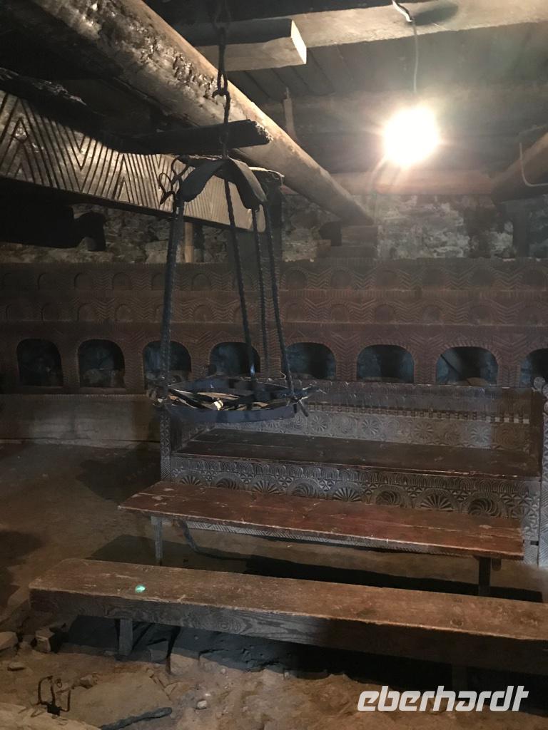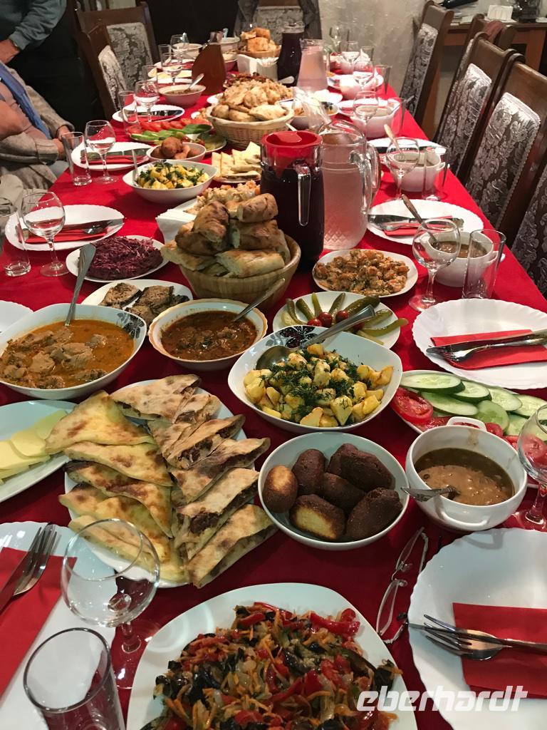 Unser Ziel an diesem Tag war das höchstgelegene, ganzjährig bewohnte Dorf in Europa - Ushguli auf 2.200 m Höhe. Wir nutzten erneut die Jeeps, es war ein beschwerlicher Weg. Unterwegs gab es eine ganze Reihe an Baustellen, wo man einfach hindurchfährt. Aber der Regen hatte die Wege auch aufgeweicht und das Wasser stürzte oft gerade über die Straße zum Tal. Am Wegesrand besuchten wir den Turm der Liebe und Eka erzählte uns die traurig endende Liebesgeschichte. Ein Stück weiter am Wege lag die kleine Kirche Santa Barbara, in der noch originale swanetische Wandmalereien und Ikonen bewundert werden können. In Ushguli hielten wir direkt oberhalb des Dorfes und staunten über die vielen Wehrtürme und Machubis, die zum Teil in einem erbärmlichen baulichen Zustand sind. Auf unserem Weg dann die Haustiere, unsere steten Begleiter, und mutige Wanderer aus aller Herren Ländern. Leider konnten wir die Gipfel des Shkhara mit 5.068 m nicht sehen. Die Wolken zogen noch immer nicht ab. Zu Fuß stiegen wir hinauf zur Lamaria-Kirche, wo wir auch einem Mönch begegneten. Das Mittagessen hatten wir dann ganz rustikal und wandermäßig im Café Koshki, bevor wir uns auf den Rückweg begaben. Am Abend waren wir bei einer anderen Familie in Mestia eingeladen. Auch hier erwartete uns eine großartige swanische Tafel mit den Kostbarkeiten des Landes, liebevoll zubereitet durch die Herrin des Hauses. Manch einer durfte auch einen Blick in eine traditionelle und doch so moderne Küche werfen. Wir waren dankbar für so viel Gastfreundschaft.