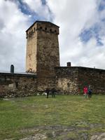 Schon am nächsten Tag wollten wir uns den Traditionen dieses Bergvolkes nähern. Leider spielte das Wetter nicht so mit, wie wir es uns gewünscht hätten, und es regnete. Den Bus konnten wir in den engen Gassen der Stadt nicht benutzen und so hatten wir an diesem Tag Jeeps zur Verfügung, die uns den Weg auf den steilen Straßen erleichterten. Zuerst besichtigten wir den Wehrturm und das Machubi (Wohnhaus am Fuße des Wehrturms), welches der Magrani-Clan für Touristen als ethnographisches Museum zur Verfügung gestellt hat. Die Wehrtürme waren eine kleine Burg, in die sich die Großfamilie mit den Tieren zurückziehen konnte, wenn die Feinde aus dem Norden nahten oder Bedrohung durch auf Blutrache sinnende Nachbarclans drohte. Einige von uns wollten einen solchen Turm besteigen und wir waren froh, dass alle aus dem engen, schmalen Turm, wo man von Etage zu Etage nur auf wackeligen Leitern gelangen konnte, zurückkehrten. Die Museumsführerin Larissa führt uns dann in das benachbarte Wohnhaus und war wegen der vielen Touristengruppen völlig überlastet. Einem Wasserfall ähnlich sprangen die Worte aus ihrem Mund und in Windeseile erzählt sie, wie die Swanen wohnten und lebten mit den Tieren in einem Haus. Es war so aufregend und uns blieb vor Staunen der Mund offenstehen. Ein solches einfaches, gut organisiertes und doch beglückendes Leben in einer Gemeinschaft, soweit entfernt von unserem hochzivilisierten Dasein. Anschließend besichtigen wir das Michail Khergiani -Museum auf der anderen Seite von Mestia. Hier wohnte die Familie des berühmten Bergsteigers. Die Mittagspause legten wir im Zentrum von Mestia ein, im Café Leila. Am Abend dann das Highlight. Wir besuchen eine swanische Familie zu Hause und setzen uns an eine georgische Tafel mit den vielen kleinen Tellern und den wunderbaren, selbst zubereiteten, einfachen, gesunden und so gut schmeckenden Speisen, mit vielen Kräutern der swanischen Küche, Salguni-Käse und Fleisch von den heimischen Tieren - Ökoprodukte würden wir sie benennen. Danke für so viel Gastfreundschaft.