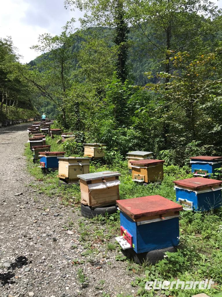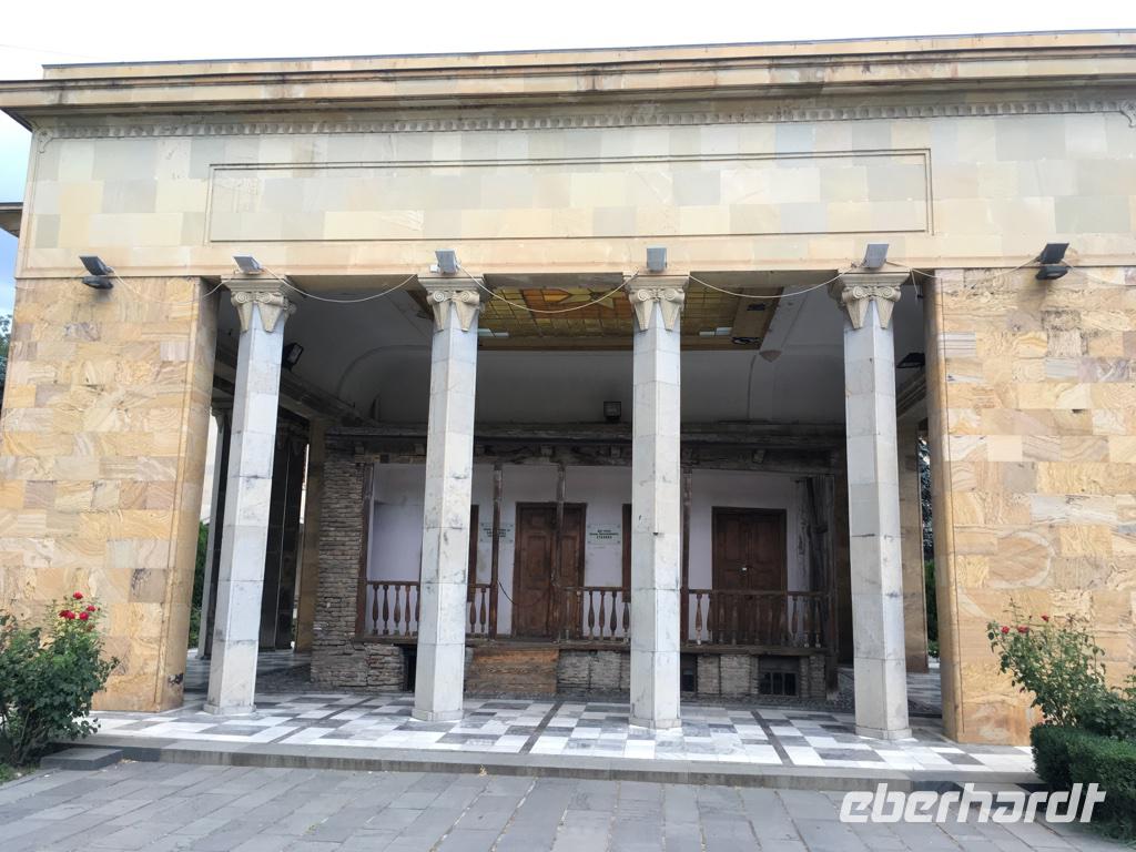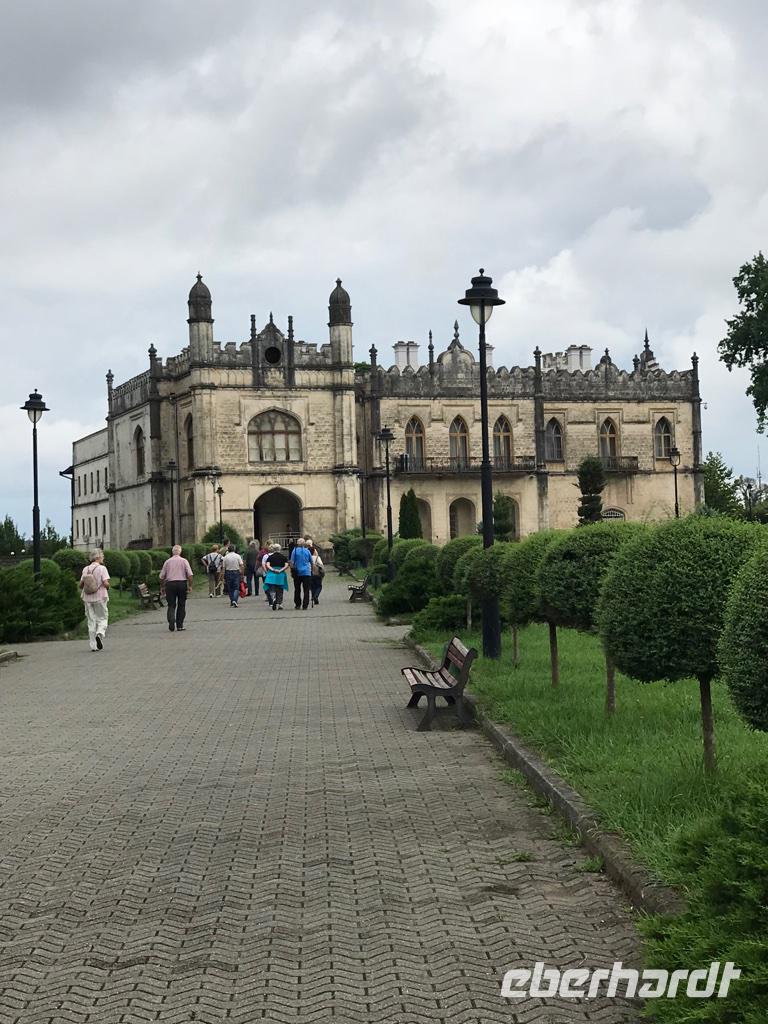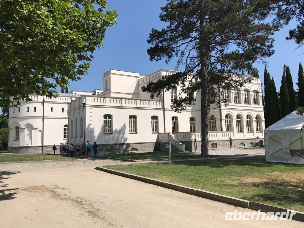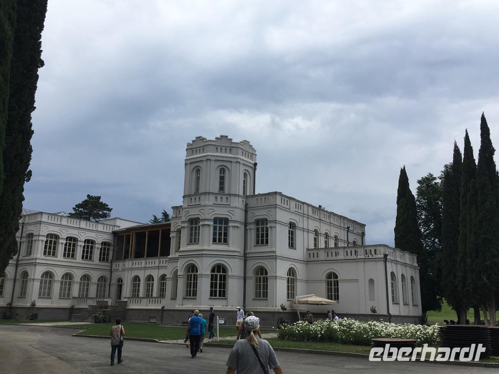 Das war ein besonders bewegender Tag unserer Reise. Es ging in Richtung Nordosten, hinauf in den Großen Kaukasus. Zunächst grüßten uns die Ausläufer des Kleinen Kaukasus. Die Fahrt ging durch Megrelien in der Kolchischen Tiefebene, das landwirtschaftliche Paradies mit Zitrus- und Feigenbäumen, mächtigen Walnussbäumen, Granatäpfel und vielen Kirschpflaumen, deren Früchte jetzt schon in allen Farben leuchteten, mit Maisfeldern, Weinhängen und Teeplantagen. Große Flächen wurden für den Anbau von Haselnüssen genutzt. Wenn wir Ferrero-Küsschen essen, haben wir wohl immer auch etwas von Georgien dabei. Bald schon begegneten uns zum ersten Mal in den kleinen Dörfern die flanierenden Schweine, Rinder und Hühner, die am Abend stets allein den Weg in den heimatlichen Stall finden. Sie sollten uns auf unserer Reise überall wieder begegnen. Eine Mittagspause legten wir in Zugdidi ein, der Residenzstadt der megrelischen Fürsten. Die Familie der Dadianis ließ hier einen Palast bauen und einen Garten anlegen. Der Palst dient heute als Geschichts- und Volkskundemuseum, wo als besondere Kuriosität eine der drei Kopien von der Totenmaske Napoleon Bonapartes sowie Möbel und Kostbarkeiten aus dem Privateigentum von Napoleon aufbewahrt werden. Die Verknüpfungen der Familie Dadiani nach Deutschland und Frankreich waren sehr eng. Achille Murat, der Enkel von Napoleons Marschall, war mit einer Tochter aus der Dadiani Familie verheiratet.