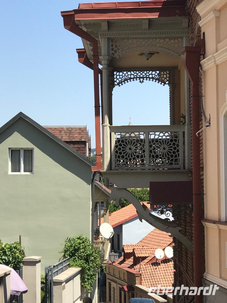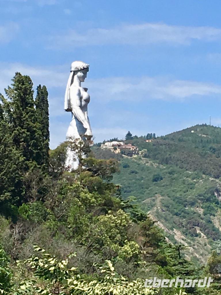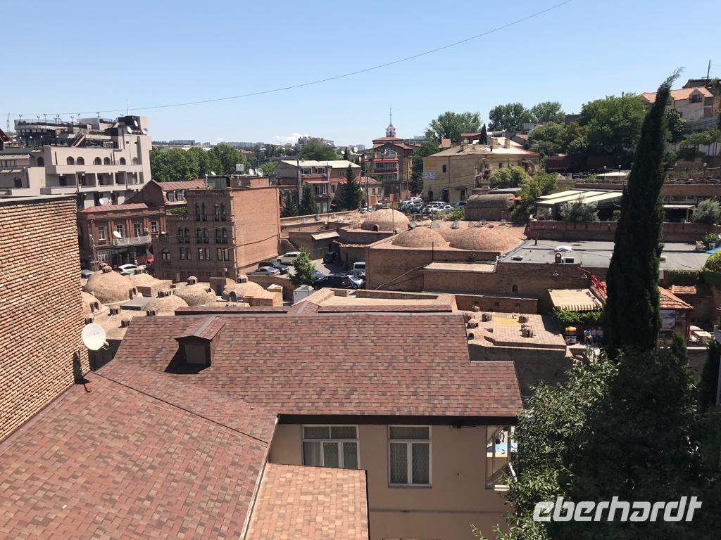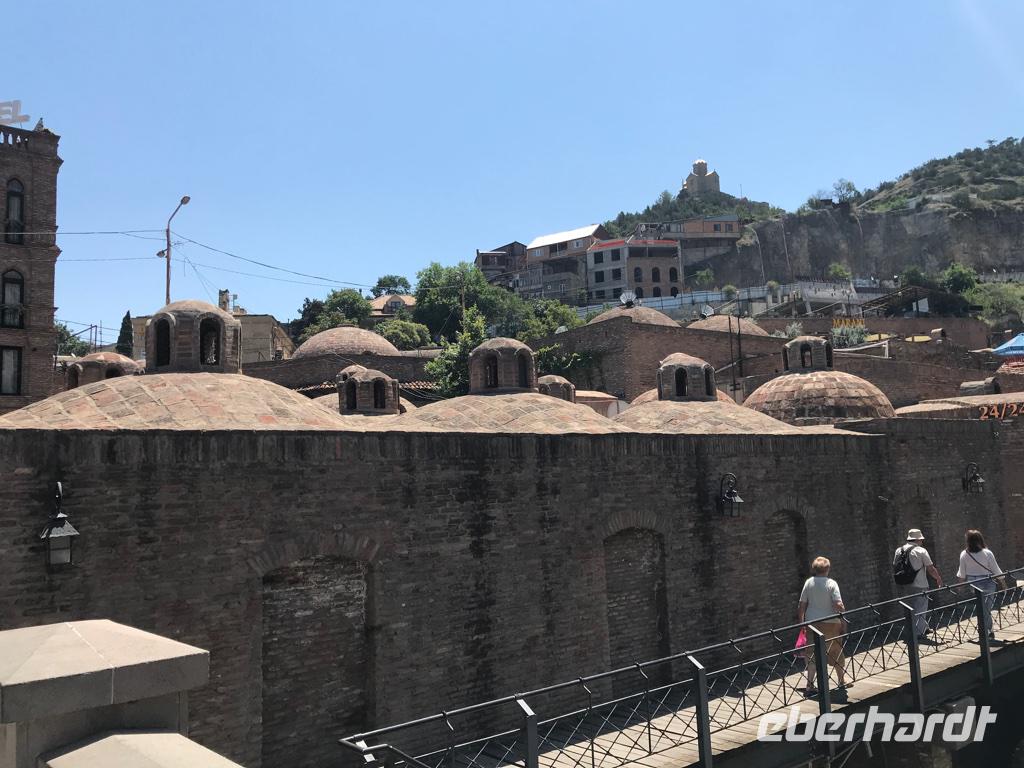Unser letzter Tag. Wir hatten die Besichtigung der Hauptstadt auf dem Plan. Die Altstadt erkundeten wir zu Fuß, es gab so viel zu sehen und es war so heiß, 36°C, da waren wir stets auf der Suche nach Schatten. Was haben wir gesehen und erlebt - den Rike-Park und den neu gestalteten Europa-Platz mit der unteren Station der Seilbahn, die auf den Sololaki-Bergrücken am gegenüberliegenden Ufer des Mtkvari-Flusses führt, die stählernen Röhren der Konzert- und Ausstellungshalle, den Präsidentenpalast, die Metekhi-Kirche auf dem Steilufer des Flusses und das Wachtang Gorgassali-Denkmal, die Narikala-Festung und die Skulptur Mutter Georgiens, die Schwefelbäder und vieles mehr, alte Gotteshäuser verschiedener Religionen, wunderschön restaurierte Balkone und Häuser in der Altstadt, das Flair einer 1.500 Jahre alten Stadt zwischen Orient und Okzident. Das Mittagessen nahmen wir bei einem traditionellen georgischen Bäcker und genossen die Kühle in einem kleinen Park. Das Gebäck, süß oder deftig, schmeckt köstlich. Die Zeit nach dem Mittagessen nutzten wir ganz individuell, um die Stadt zu erkunden, dies und jenes für die Lieben zu erstehen oder einfach nur im Café zu relaxen. Am frühen Abend erwartete uns eine Bootsfahrt auf dem Mtkvari-Fluss. Ein letztes Mal georgische Köstlichkeiten und die Vielfalt einer georgischen Tafel. Wir erfreuten uns an den Aussichten vom Wasser aus auf das Steilufer mit seinen „hängenden Häusern" und auf den langsam vorankommenden Autoverkehr. Und fanden diese Stadt lebenswert.