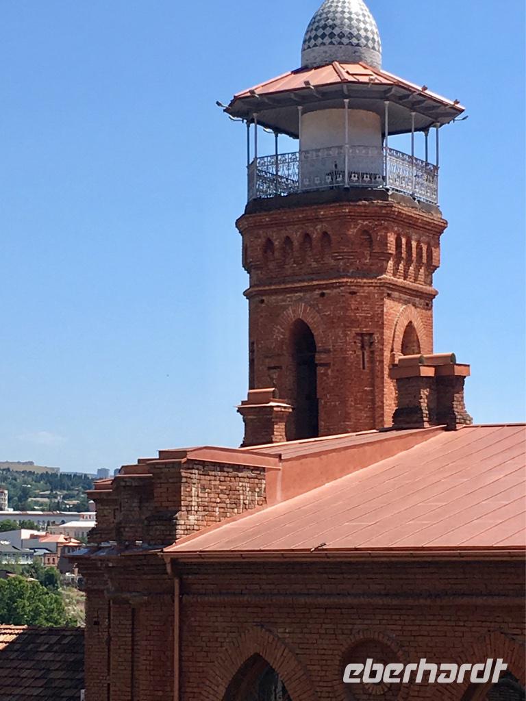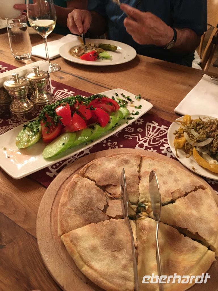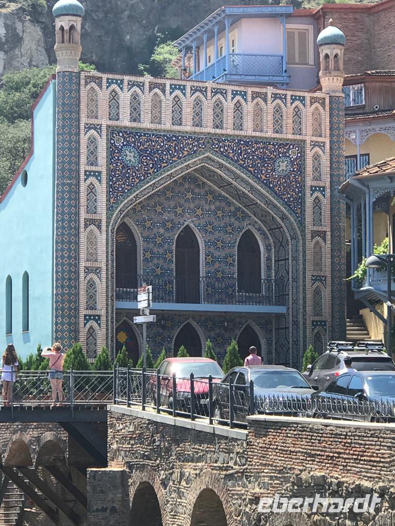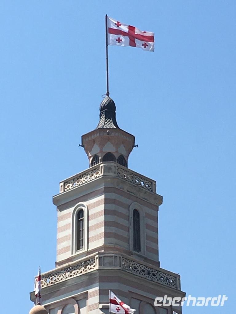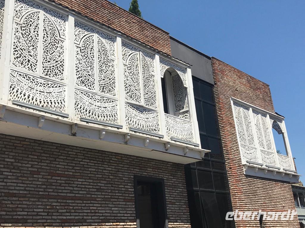 Unser letzter Tag. Wir hatten die Besichtigung der Hauptstadt auf dem Plan. Die Altstadt erkundeten wir zu Fuß, es gab so viel zu sehen und es war so heiß, 36°C, da waren wir stets auf der Suche nach Schatten. Was haben wir gesehen und erlebt - den Rike-Park und den neu gestalteten Europa-Platz mit der unteren Station der Seilbahn, die auf den Sololaki-Bergrücken am gegenüberliegenden Ufer des Mtkvari-Flusses führt, die stählernen Röhren der Konzert- und Ausstellungshalle, den Präsidentenpalast, die Metekhi-Kirche auf dem Steilufer des Flusses und das Wachtang Gorgassali-Denkmal, die Narikala-Festung und die Skulptur Mutter Georgiens, die Schwefelbäder und vieles mehr, alte Gotteshäuser verschiedener Religionen, wunderschön restaurierte Balkone und Häuser in der Altstadt, das Flair einer 1.500 Jahre alten Stadt zwischen Orient und Okzident. Das Mittagessen nahmen wir bei einem traditionellen georgischen Bäcker und genossen die Kühle in einem kleinen Park. Das Gebäck, süß oder deftig, schmeckt köstlich. Die Zeit nach dem Mittagessen nutzten wir ganz individuell, um die Stadt zu erkunden, dies und jenes für die Lieben zu erstehen oder einfach nur im Café zu relaxen. Am frühen Abend erwartete uns eine Bootsfahrt auf dem Mtkvari-Fluss. Ein letztes Mal georgische Köstlichkeiten und die Vielfalt einer georgischen Tafel. Wir erfreuten uns an den Aussichten vom Wasser aus auf das Steilufer mit seinen „hängenden Häusern" und auf den langsam vorankommenden Autoverkehr. Und fanden diese Stadt lebenswert.