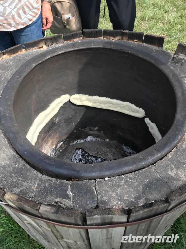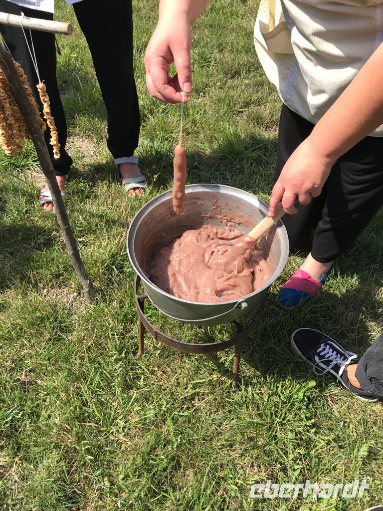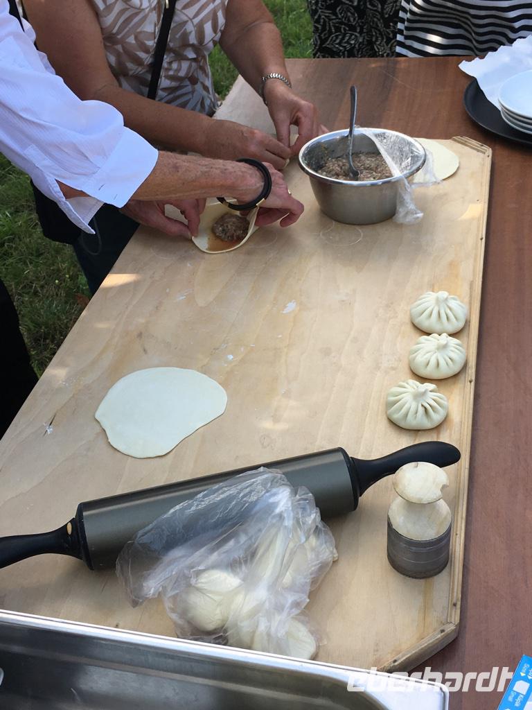 Nach dem Besuch in Mtskheta fuhren wir weiter zum Chateau Mukhrani. Welch ein prächtiges Schloss, welch großer gepflegter Garten mitten in Ostgeorgien. Zunächst nahmen wir an einer Master Class mitten im Garten teil - wir lernten Chinkali-Säckchen zu falten, Brot in den runden Backofen zu werfen und Tschurtschela aus Haselnüssen und Traubensaft herzustellen. Es hat Spaß gemacht und wir fühlten uns in ein georgisches Dorf versetzt. Dann wurden wir in den Gewölbekeller geführt, wo uns die georgische Tafel erwartete und etwas ganz Besonderes, nur für uns. Ein Tamada und noch drei weitere Sänger gestalteten den Abend und wir kamen den georgischen Traditionen näher. Es wurden Trinksprüche vorgebracht, wir erhoben die Gläser auf Gott, die Heimat, den Frieden, die Liebe, die Frauen, die Männer, unserer Ahnen und einfach auf das Leben. Und wir hören die polyphonen Gesänge des Landes; welch ein Männerchor, welche gewaltigen Stimmen. Da bekam man schon etwas Gänsehaut und wir bedankten uns überschwänglich, gefangen in unseren eigenen Gefühlen von damals und heute.