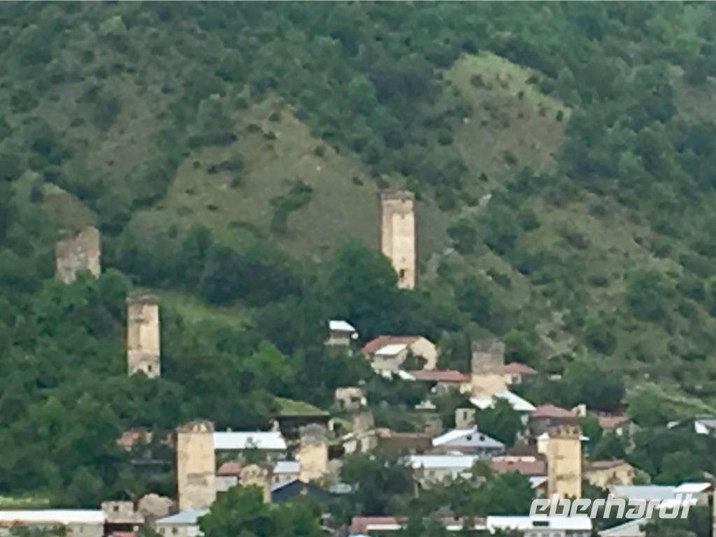 Von Zugdidi, dem Tor in das Obere Swanetien, ging dann die Fahrt stets bergauf. Wilde Flüsse und enge Schluchten, herabstürzende Wasserfälle begleiteten uns und manchmal sahen wir auch noch den Schnee in den Bergen glitzern. Die Straßen waren eng, jeder von uns hatte einen Fensterplatz in unseren Reisebus und sah ein manches Mal mit Bangen in die Tiefe. Gegen Abend erreichten wir Mestia, das Herz der Verwaltungsregion, und unser Hotel Banguriani, von dem man einen weiten Blick auf die vielen Wehrtürme des Ortes und der Umgebung hat. Im Dunklen dann sind die Türme erleuchtet und da wussten wir mit Bestimmtheit, es ist eine ganz andere Welt, in die wir gerade eintauchten. Die swanische Bergwelt ist wohl eine der majestätischsten in ganz Europa, noch unberührt vom Massentourismus, einsam und erhaben. Sie ist die Heimat eines stolzen Bergvolkes, das seine Traditionen seit Jahrhunderten erhalten hat. Kriegerische Auseinandersetzungen mit den nordkaukasischen Stämmen gab es genug, die Wohn- und Wehrtürme ermöglichte es den Swanen zu überleben. Erst 1937 wurde Mestia durch eine Straße erschlossen, bis vor wenigen Jahren war sie jedoch kaum befahrbar.