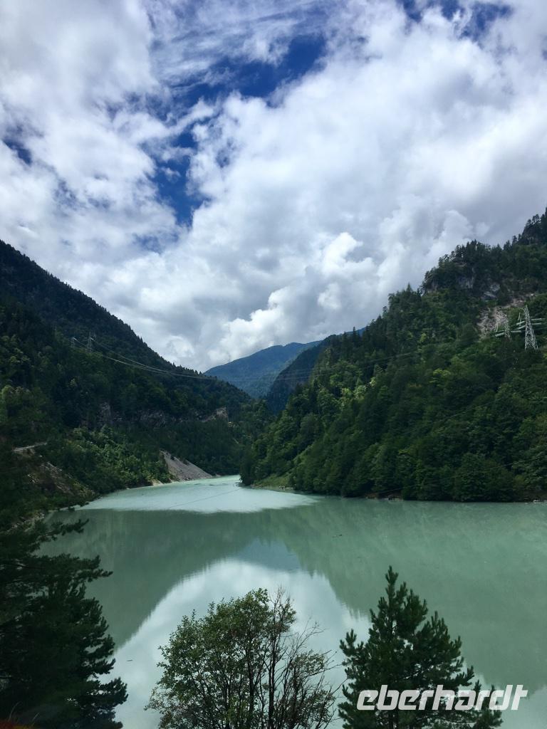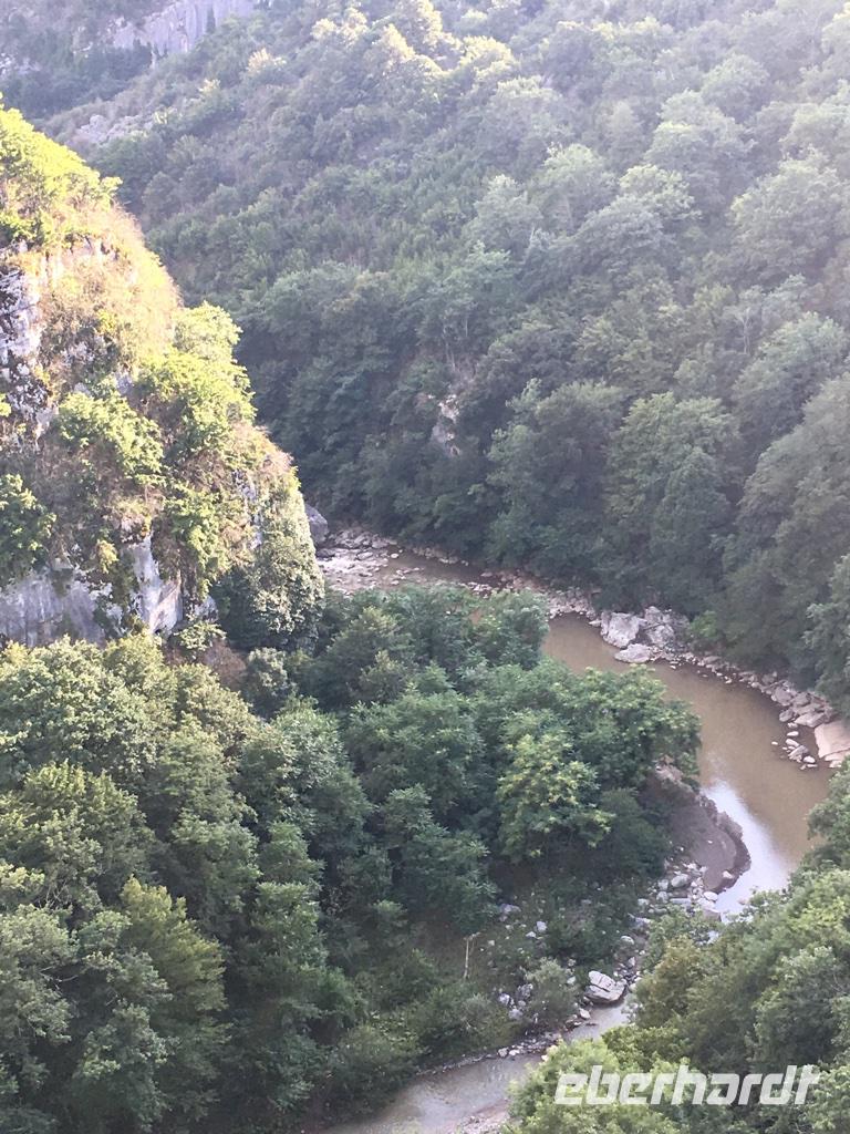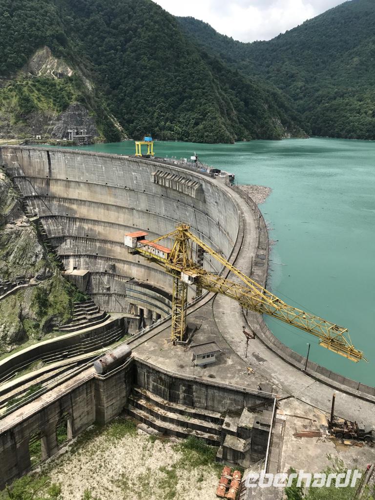 Und schon waren die erlebnisreichen Tage in Swanetien vorbei. Die Rückfahrt führte erneut über Zugdidi nach Kutaisi, der Hauptstadt Imeretiens. Auf der Karte sah es so aus, als ob man den Weg über den Tsagar-Pass durch Unterswanetien nehmen könnte, aber praktisch ging das in Anbetracht der kaum ausgebauten einzigen Straße mit einem Bus nicht. So nahmen wir den schon bekannten Weg immer entlang am Fluss Enguri ins Tal und hatten noch einen kurzen Abstecher zum Enguri-Stausee und seiner enormen Staumauer, die zu den höchsten der Welt gehört. Die Mittagspause hatten wir wieder in unserem kleinen Tea-House in Zugdidi, das wir schon von der Hinfahrt kannten. Diesmal nutzten wir die Pause um ein anderes georgisches Gericht kennenzulernen - Chinkali, die sorgfältig gefalteten Teigtaschen mit Stiel. Sieht schon interessant aus. Eka zeigte uns praktisch wie man so eine mit Fleisch gefüllte Teigtasche gekonnt essen muss, ohne dass die Brühe herausläuft. Bevor wir in Kutaisi ankamen, fuhren wir zunächst hinauf zum Gelati-Kloster. Die Akademie von Gelati war das geistige Zentrum des georgischen Staates im Mittelalter und wurde von Davit dem Erbauer, dessen Name uns auf dieser Reise des Öfteren begegnete, im Jahre 1106 gegründet. Wir besuchten die Gottesmutterkirche im Zentrum des Areals und einige andere Gebäude. Der Blick von der Anhöhe in die Weite des Tales, die Hügel und die kleinen Häuschen in Mitten von endlosem Grün nahm uns gefangen und die Ruhe, die dieser Ort ausstrahlte. Auf dem Hügel gab es eine Menge an laufenden Restaurationsarbeiten. Insbesondere die Dächer der Gebäude wurden wieder in den originalen Zustand mit in der Sonne glitzernden Dachziegeln versetzt und die Dachbleche der Sowjetzeit wurden gerade entfernt. Unsere Fahrt ging weiter nach Motsameta, wo uns ein steiler Weg hinab zu einer Kapelle führt. Es ist einer der berühmtesten Wallfahrtsorte in Georgien. Die kleine Kapelle ist den Brüder Davit und Konstantin geweiht, deren Märtyrertum uns Eka in einer kleinen Geschichte nahebrachte. Der Tag neigte sich dem Ende. Wir fuhren nach Kutaisi, wo wir im Hotel Best Western Hotel Kutaisi übernachteten. Es war ein tolles Hotel. Das Abendessen erwartet uns direkt neben dem Hotel im Café White Stone. Bei wunderbarem georgischen Essen, ans Herz gehender Live-Musik und einem Blick auf den Fluss und die Stadt ließen wir den Tag ausklingen. Die Weiße Brücke über den Fluss konnten wir leider nicht benutzen, denn sie wurde gerade restauriert.