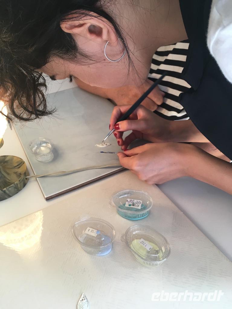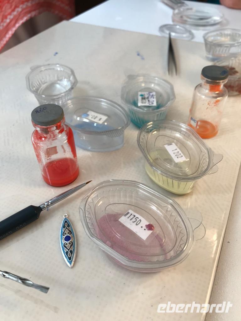 Am frühen Morgen schon gab es eine besondere Überraschung. Vom Hotel aus, ein paar Straßen weiter, führte uns Eka in einen kleinen Hinterhof, wo wir eine winzige Emailleschmuck-Werkstatt vorfanden. Die Besitzerin und die jungen Leute von der Kunstakademie empfingen uns ganz freundlich. Das Werkzeug lag bereit und die Farben. Wir lernten voller Begeisterung, wie man aus einem kleinen Stück Silber einen farbenfreudigen und glänzenden Anhänger oder gar Ohrringe herstellen kann. Jeder gab das Beste und wir alle waren zum Schluss so stolz, diese winzigen Arbeiten selbst hergestellt zu haben. Die Atmosphäre in dem kleinen Raum war voller Kreativität und Gastfreundschaft, dass so mancher zum Abschied die Tränen zurückhalten musste.