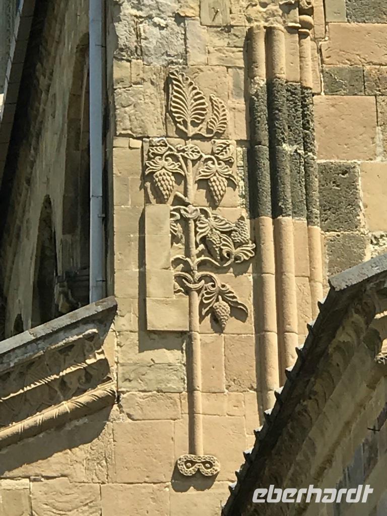 Anschließend reisten wir mit dem Bus nach Mtskheta, die altehrwürdigste der georgischen Städte. Auf dem Weg besuchten wir zunächst die Jvari-Kirche, die weit sichtbar auf einem Felsen thront, wo man eine wundervolle Aussicht auf die Tiefebene, die georgische Heerstraße, den Zusammenfluss der beiden ostgeorgischen Flüsse Mtkvari und Aragvi sowie auf Mtskheta selbst hat. In Mtskheta führte uns der Weg direkt zur Sveti Tskhoveli-Kirche, vorbei an liebevoll restaurierten georgischen Häusern, Weinlokalen, Cafés und Händlerständen. Die Sveti Tskhoveli-Kirche, Kirche des lebensspendenden Stamms, ist ein Meisterwerk georgischer Baukunst aus dem 11. Jahrhundert und das beliebteste Gotteshaus im Land. Eka erzählte uns die Legende von der Heiligen Sidonia und dem blutgetränkten Hemd von Jesus. Über viele Jahrhunderte war diese Kirche die Krönungs- und Begräbniskirche der georgischen Könige. An diesem Tag waren wir dem frühen Christentum, das im 4.Jahrhundert in Georgien zur Staatsreligion erhoben worden ist und der christlichen Missionarin Nino aus Syrien sehr nahe.