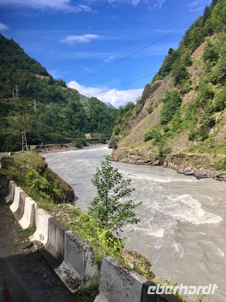 Unsere Reisegruppe traf sich in Leipzig am Flughafen. Einige von uns waren sehr gespannt, was uns in diesem für uns gedanklich fernen Land, in das wir aufbrachen, erwartet. Andere vollzogen eine Erinnerungstour, um die Erlebnisse der Jugendzeit noch einmal aufblühen zu lassen und zu vergleichen, was sich seit den 70-er Jahren so getan hat in Georgien. Unser Flug ging pünktlich nach Istanbul mit Turkish Airlines (Essen und Service immer wieder sehr gut) und wir stellten die Uhr vor. In Istanbul hatten wir wirklich sehr wenig Zeit für das Umsteigen in den Flug nach Batumi. Glücklicherweise erwartetet uns bereits am Eingang zum Flughafengebäude ein Mitarbeiter der Turkish Airlines, der uns im Eilschritt zum Abfluggate brauchte. Es war ein Rennen auf krummen Wegen und ich bin allen unseren Gästen sehr dankbar, dass sie den Eilschritt bei diesen hohen Sommertemperaturen so gut gemeistert haben. Als wir am Gate ankamen war Boarding schon abgeschlossen und hier half uns auch der nette Airline-Mitarbeiter. Unserer beiden Mitreisenden aus Süddeutschland fanden wir dann erst im Flieger, denn sie waren schon vorab eingestiegen. Ankunft in Batumi und wieder die Uhr eine Stunde vorstellen. Die Koffer waren auch alle da, was uns überraschte, offenbar waren sie genauso schnell transportiert worden wie wir gerannt sind. Es war heiß in Batumi und die Luftfeuchtigkeit hoch, wie auch an den folgenden Tagen. Da kam man den ganzen Tag ins Schwitzen.