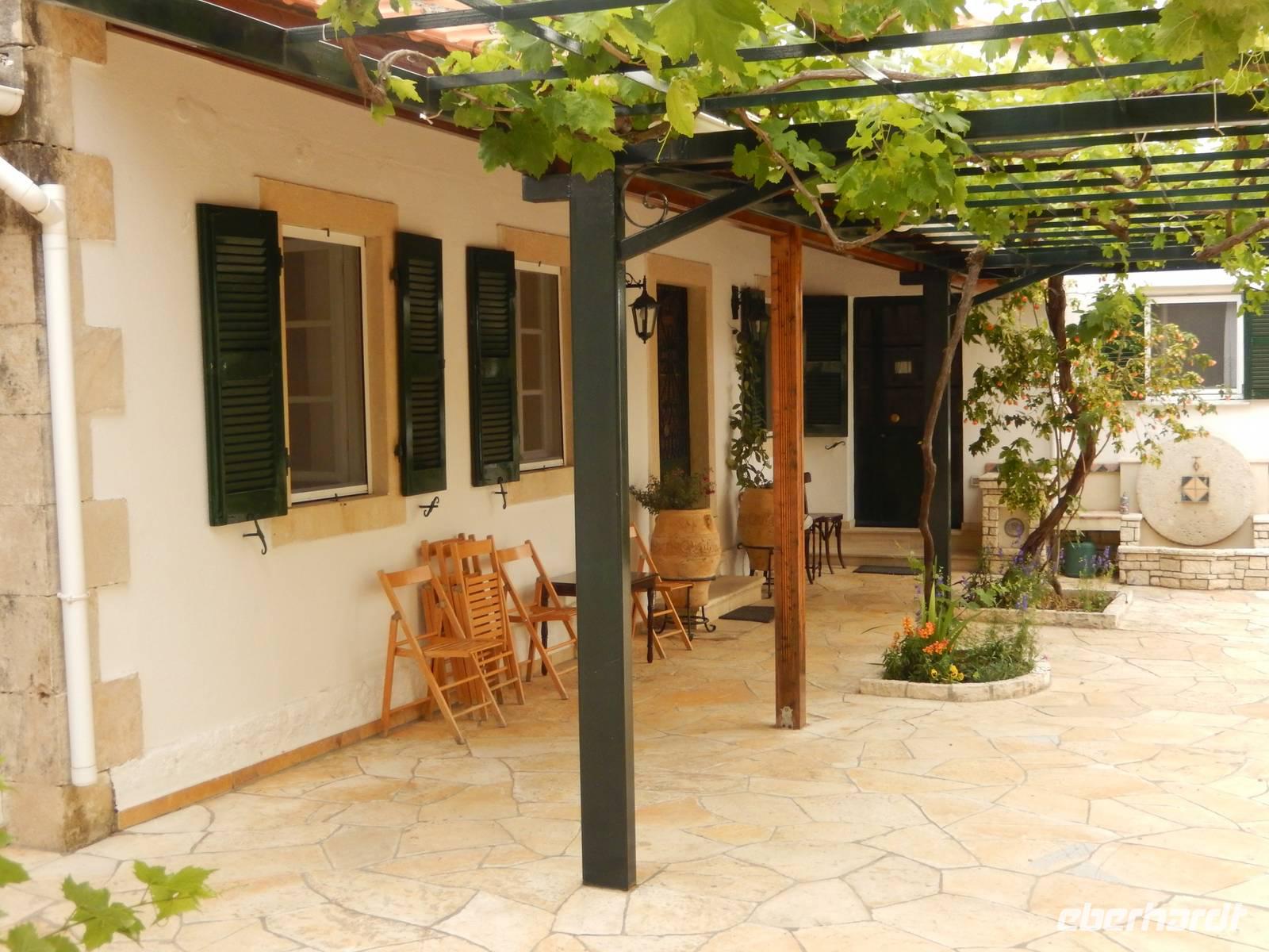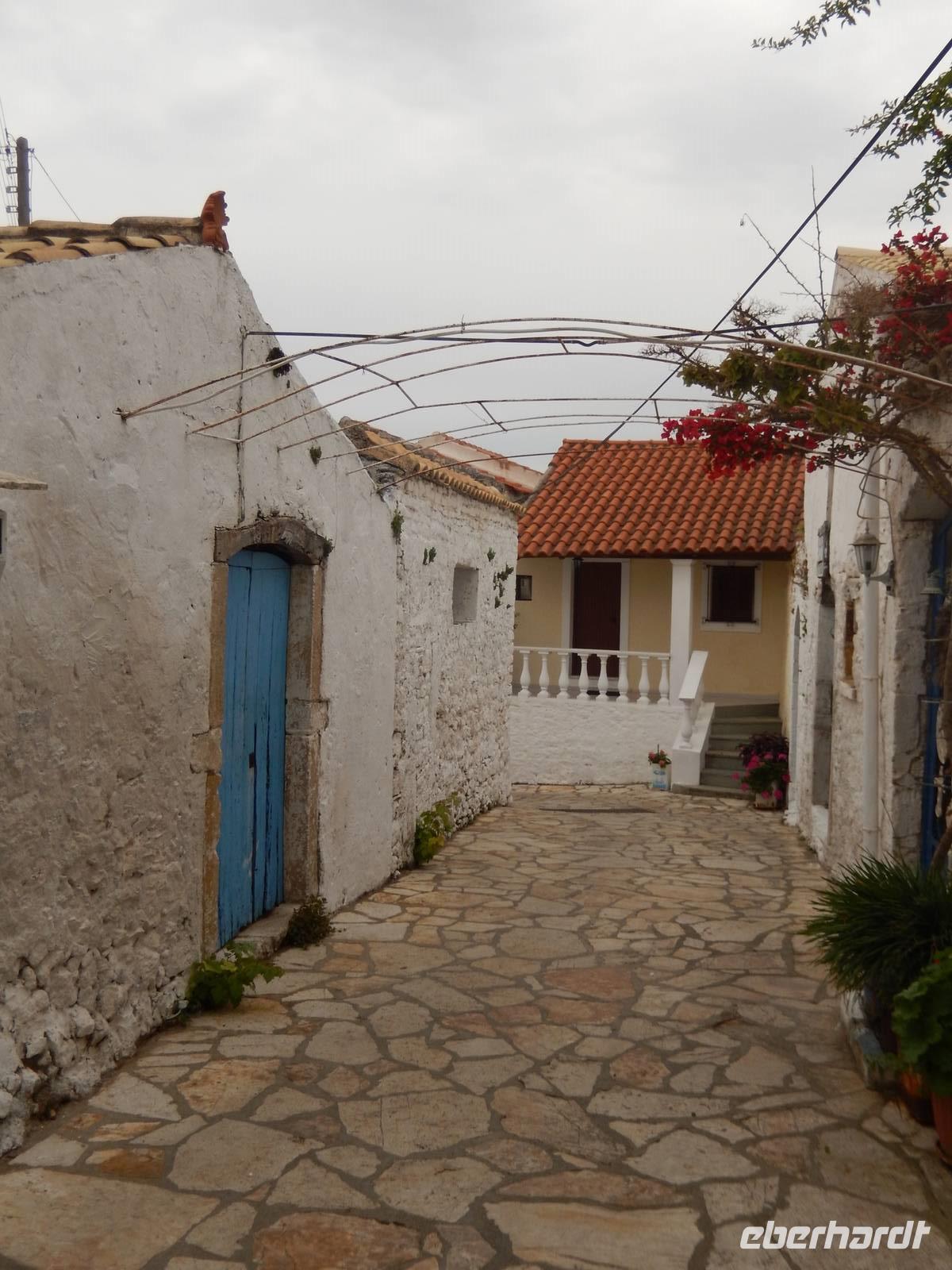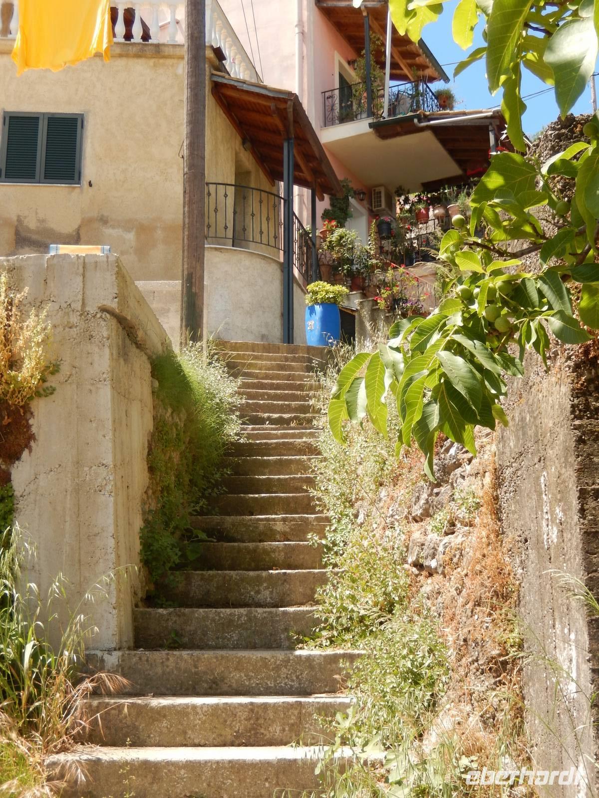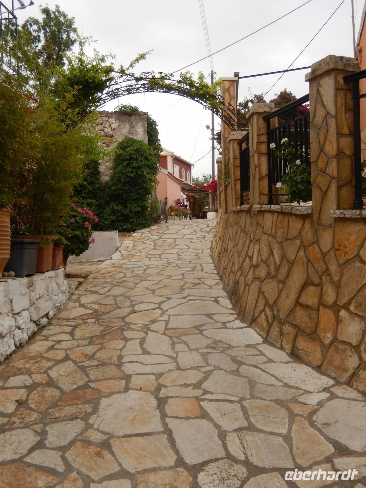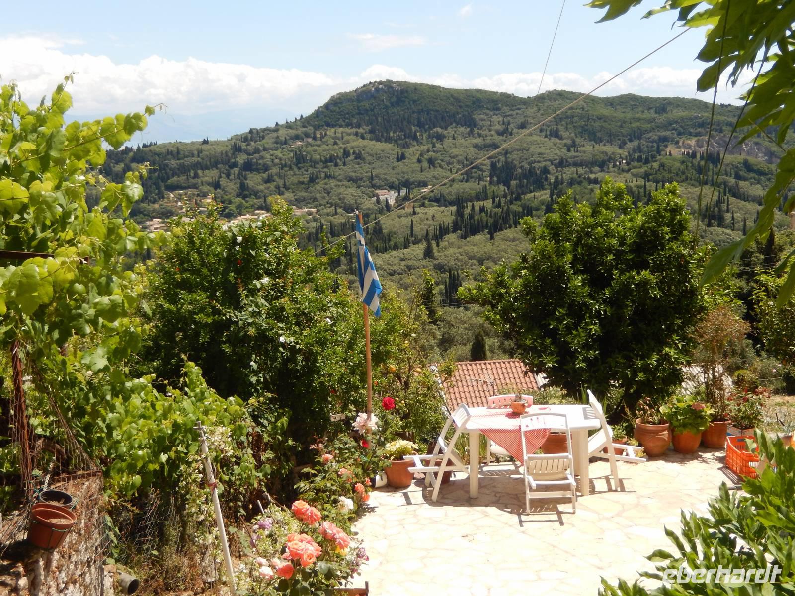 Unser letzter Tag. Wahnsinn, wie schnell diese Tage vergangen sind. Da jeder heute Abend noch die Sonne am Strand genießen wollte und auch noch seine Koffer packen musste, gingen wir den Tag heute gemütlich an. Marlies und unser Busfahrer holten uns um 9:45 Uhr vom Hotel ab. Auf ging es in Richtung Süden. Unser erster Stopp war das Weingut „Triklino". Nach einer kurzen Tee Stärkung erfahren wir in einem Film alles über die Wein- und Olivenölherstellung. In idyllischer Atmosphäre inmitten von blühendem Jasmin durften wir den Hauseigenen Wein und einen kleinen Snack probieren. Hier könnte man ewig sitzen und die Natur genießen, aber wir wollen doch heute noch mehr vom Süden entdecken! Also fuhren wir weiter mit dem Bus bis in das Dorf Agios Deka (Heilige Zehn). Hier schlenderten wir durch die engen Gassen und genossen den traumhaften Ausblick. Wir machten uns wieder auf den Weg und fuhren weiter nach Süden. Marlies erzählte uns auf der Fahrt alles Wissenswerte zum Schulsystem, der Arbeit, der Arbeitslosigkeit und dem Leben auf Korfu. Angekommen am Sandstrand von Marathias, nutzen viele die Möglichkeit zu einem korfiotischen Mittagessen und danach zu einem Spaziergang am wunderschönen Sandstrand.