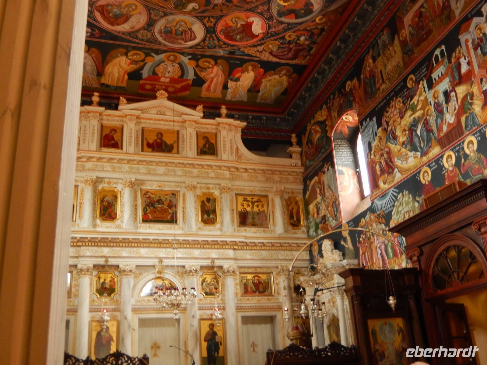 Unser Erster Stopp war das Frauenkloster in Agios Athanasiou. Auf der Fahrt erzählte uns Marlies einiges über die geografische Lage von Korfu, spannendes zum Ionischen Meer und deren Inseln, alles über Flora und Fauna sowie zu den Einwohnern Korfus den Korfioten. Wir waren allein im Kloster und Marlies nutzte die Zeit in der Kirche, um über die Malerei, die Nonnen, das Kloster und den orthodoxen Glauben zu erzählen. Es entstand eine lockere Fragerunde in angenehmer Atmosphäre.