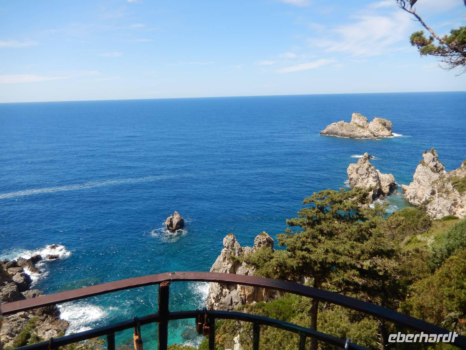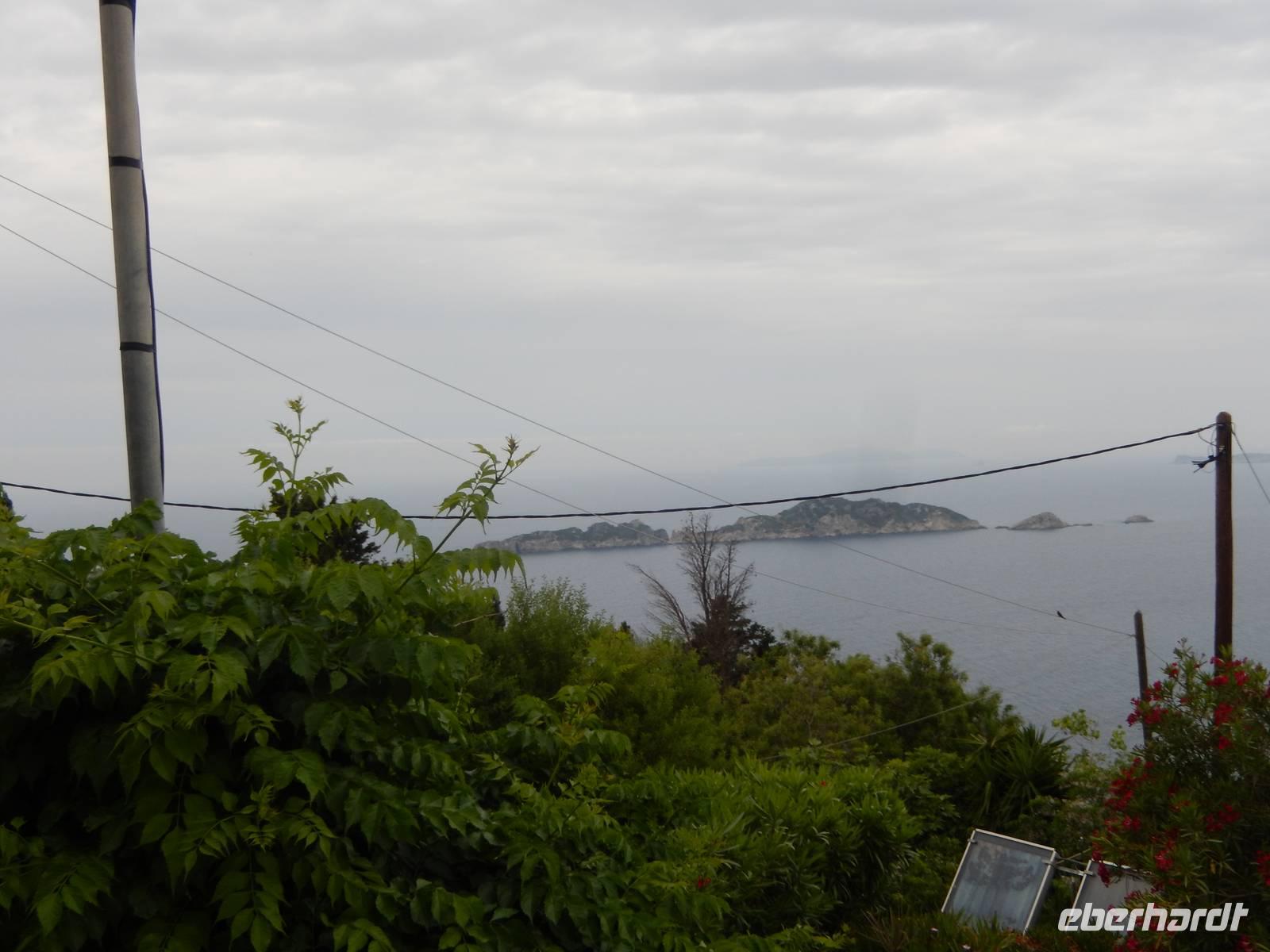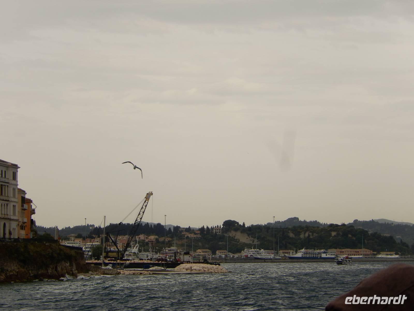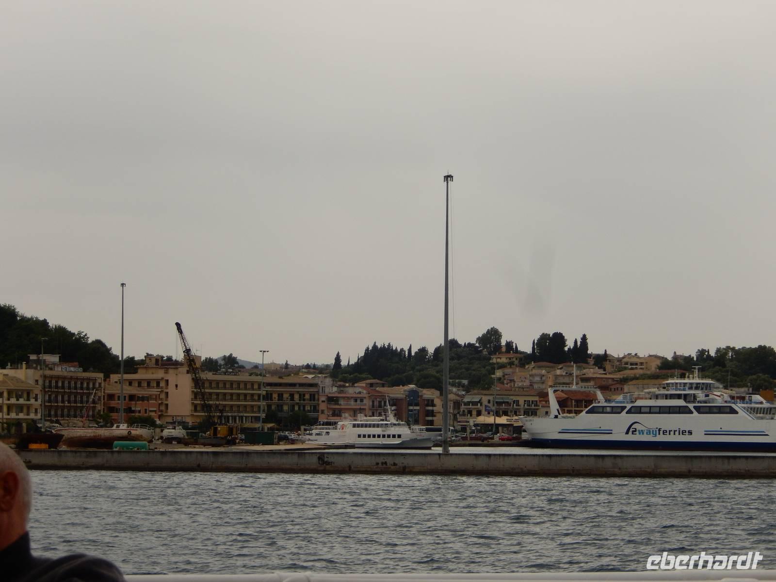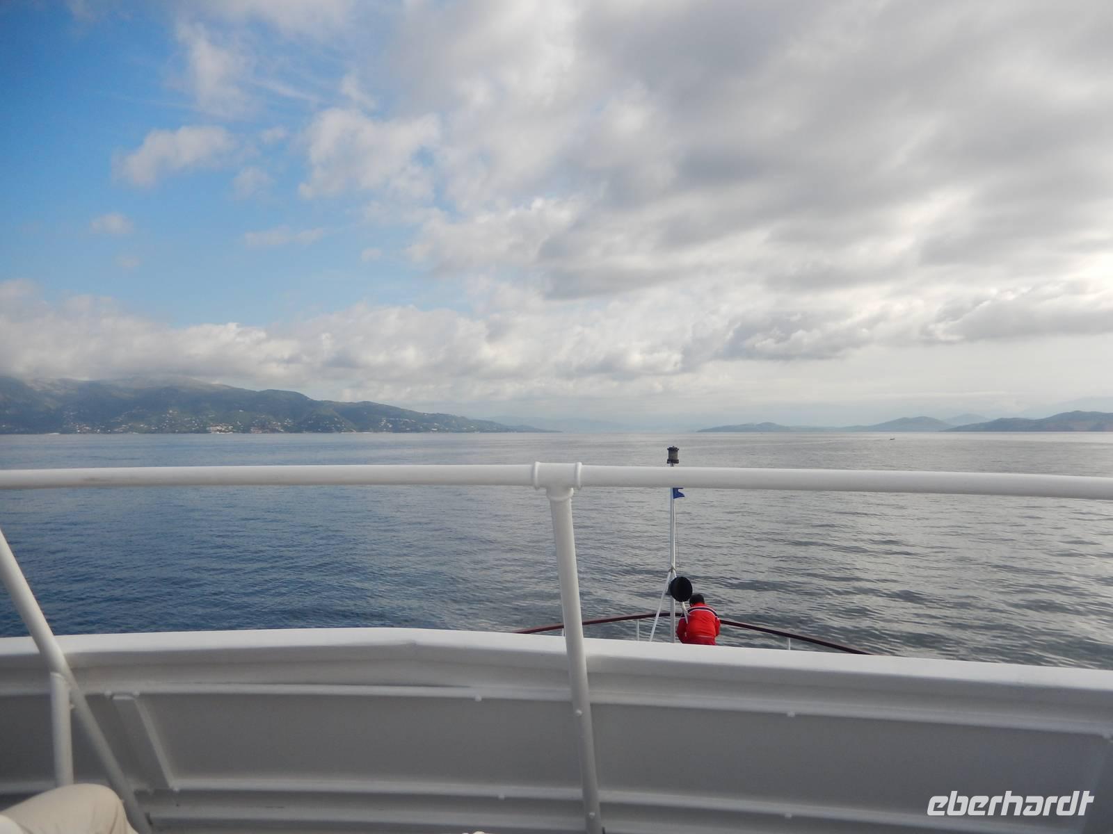 Für einige Reisegäste stand der Tag heute zur freien Verfügung. Für alle anderen hieß es: „Leinen los!". Nach einem sehr zeitigen Frühstück ging es mit dem Bus in Richtung Hafen. Das Wetter meinte es heute leider nicht ganz so gut mit und wir hofften, dass der Regen ausbleibt. Bepackt mit Wetterfester Kleidung machten wir es uns trotzdem auf dem Sonnendeck der „Ionian Sun" bequem. Wir verließen den Hafen vorbei an den großen Kreuzfahrtschiffen, vorbei an Korfu Stadt und hinaus auf das Ionische Meer. Wir fuhren entlang der Ostküste nach Süden und genossen die Aussicht trotz des Wetters.