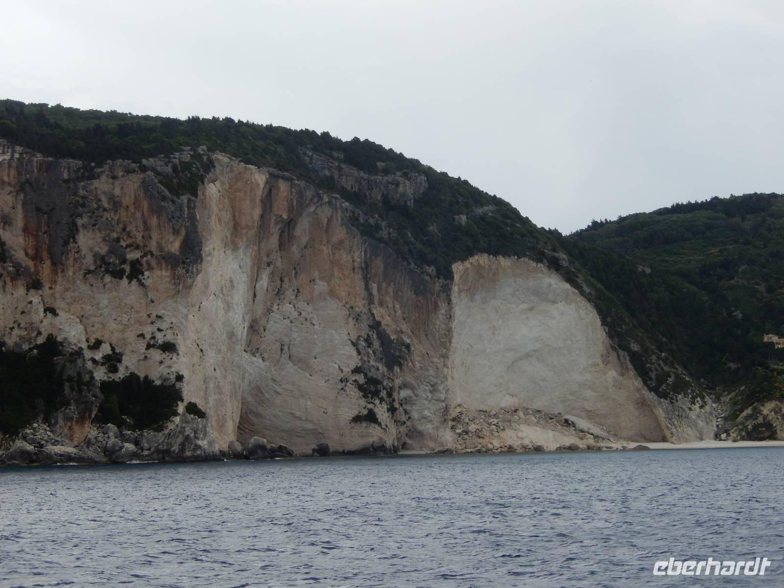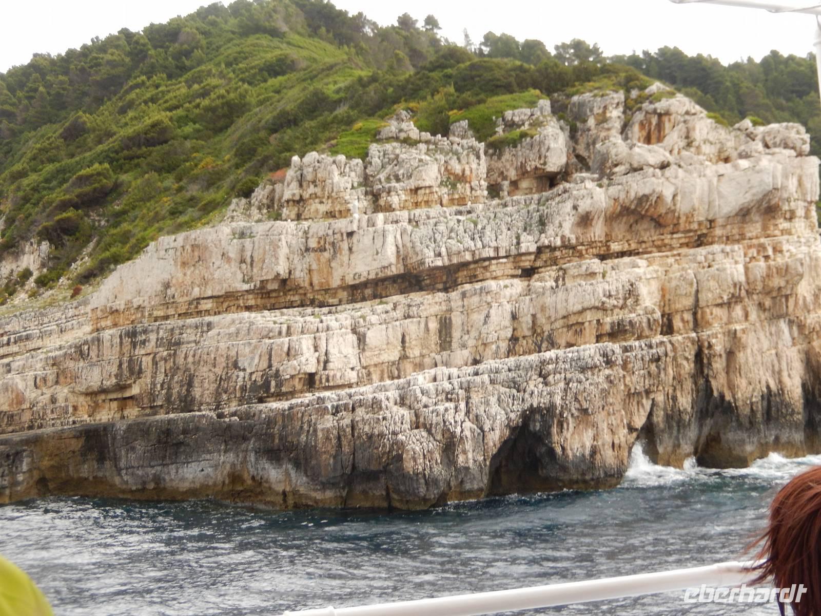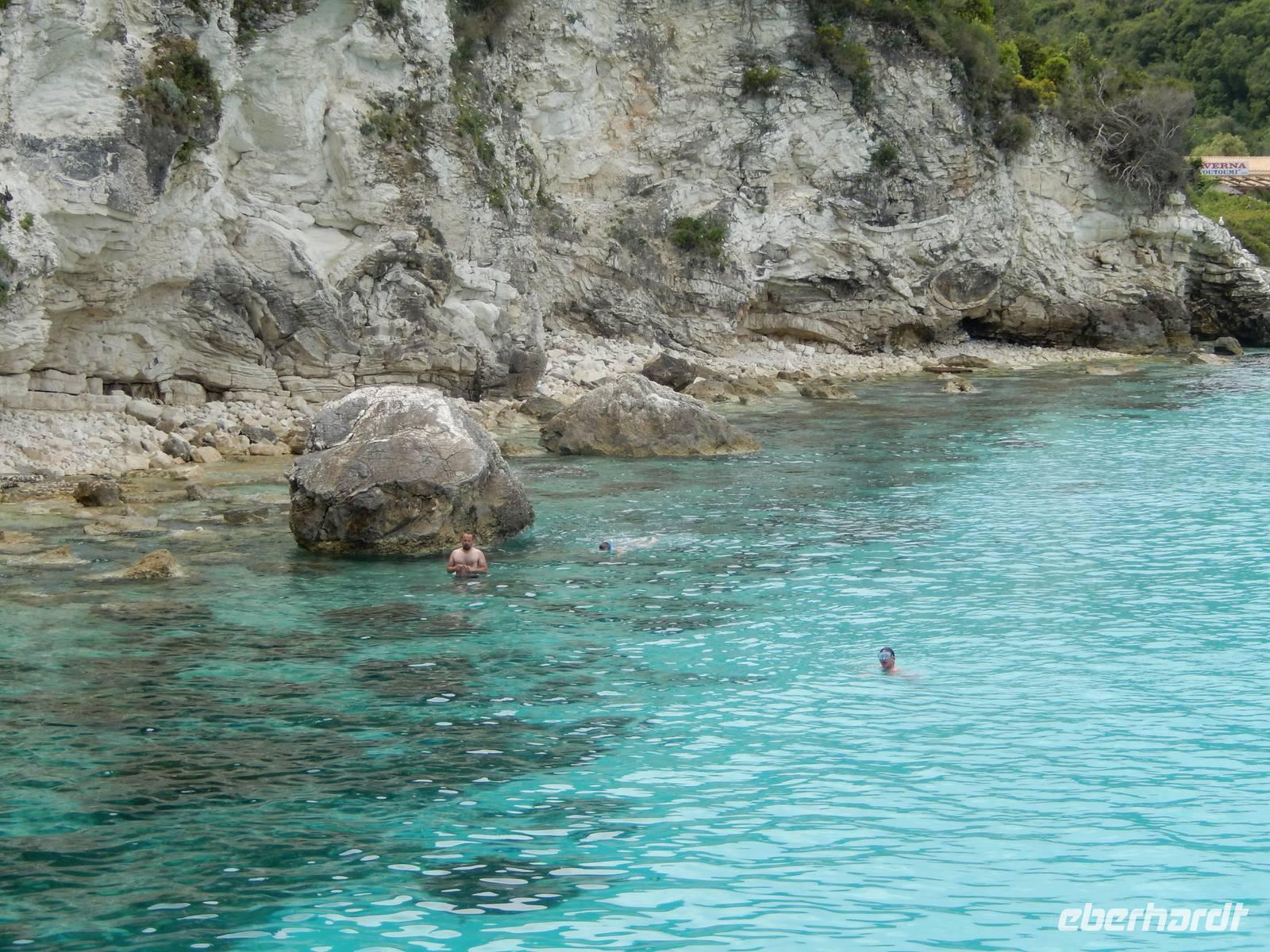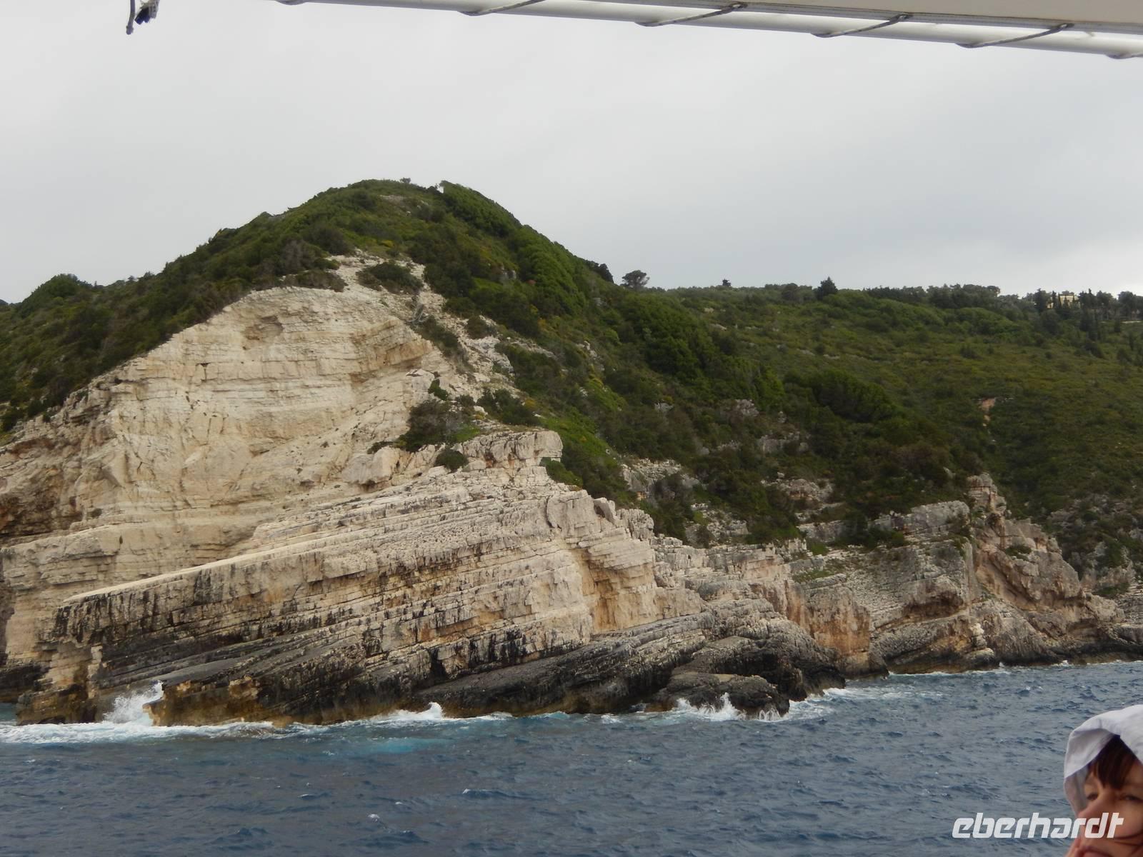 Unser erster Stopp waren nun die Grotten von Paxos. Wir waren beeindruckt von den meterhohen Felswänden und Gebilden, die von der Natur geformt wurden - und noch mehr über die Kunst des Kapitäns das Boot dort hinein und auch wieder heil herauszuführen - trotz des windigen Wetters! Weiter ging die Fahrt zur Insel Antipaxos. Antipaxos ist eine kleine Insel von vier Kilometern Länge und nur zwei Kilometern Breite. Eine kleine Bucht lud zum Badestopp. Uns war es zu kalt, aber wie staunten wir über andere Gäste, die mutig in das kühle Nass sprangen.