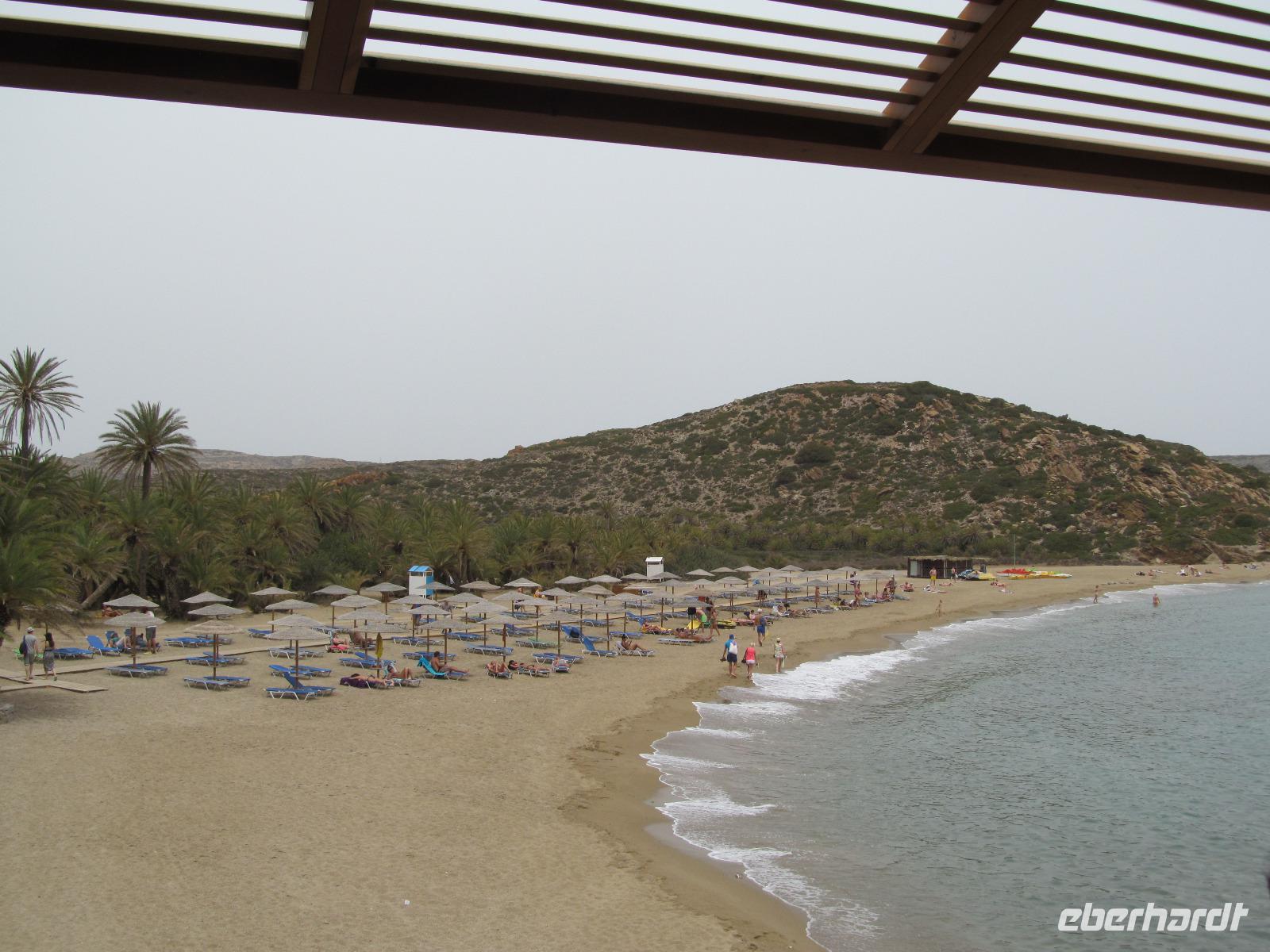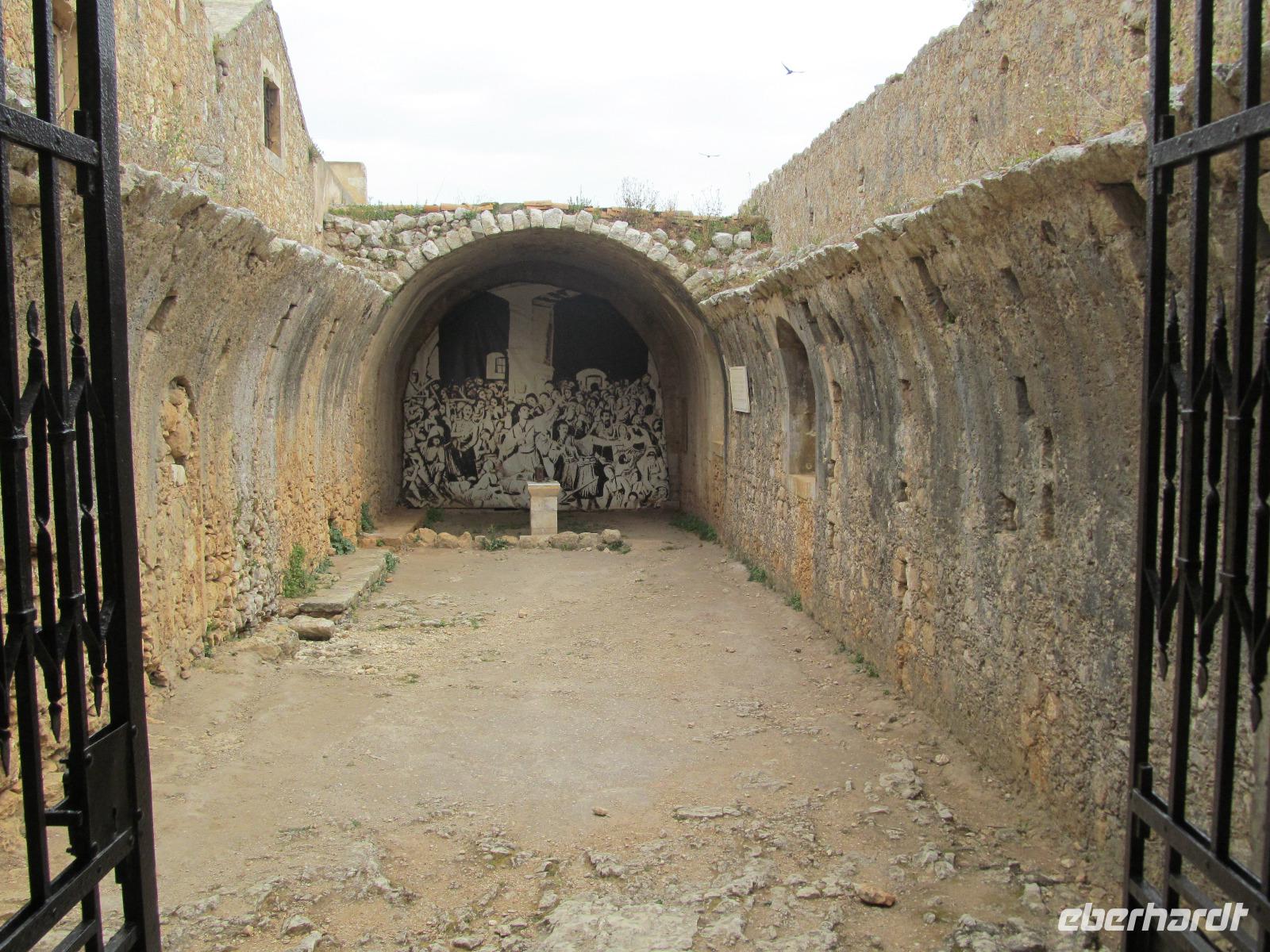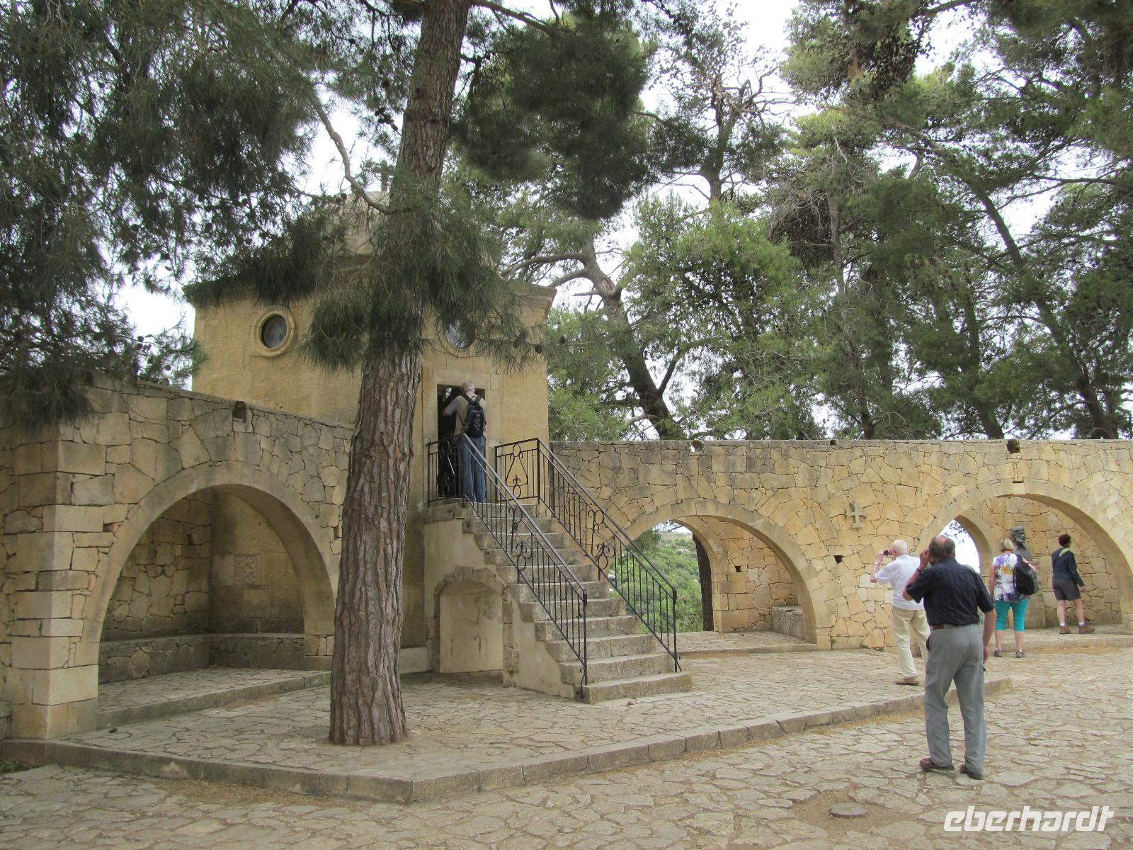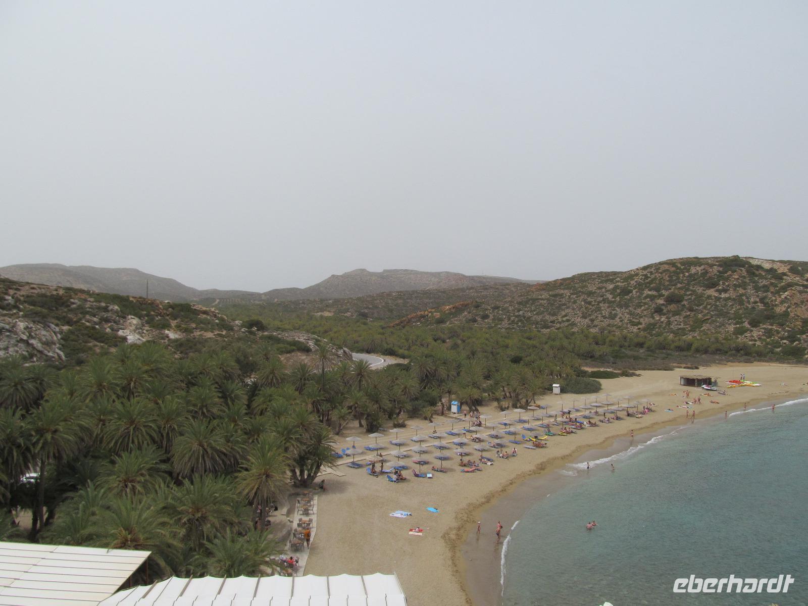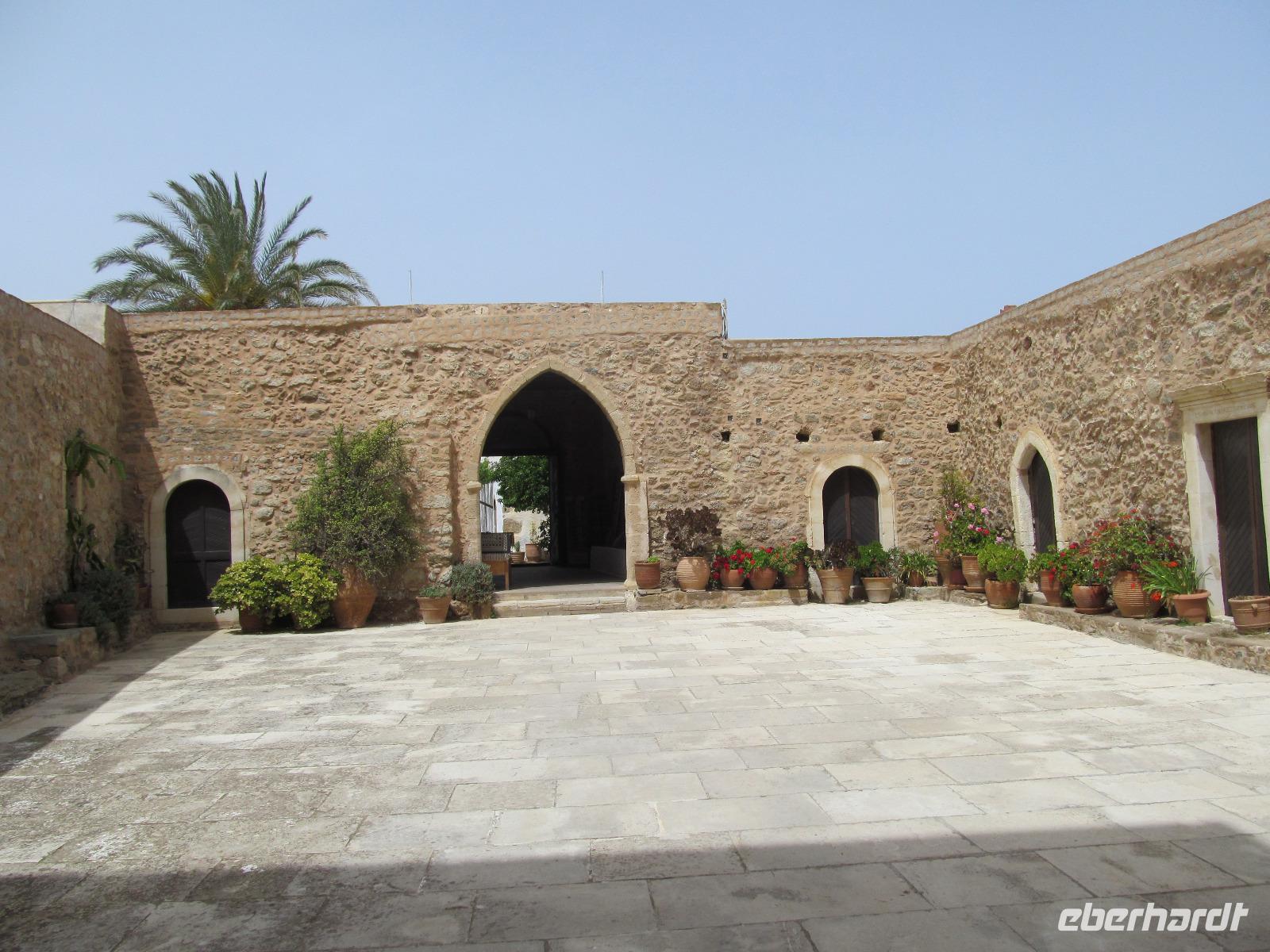 Wie jeden Morgen begrüßte uns Rena mit einem freundlichen „Kalimera", was auf Deutsch „Guten Morgen!" heißt. Wir starteten unseren langen Reisetag in den Osten mit der Fahrt entlang der Küste und legten einen kurzen Fotostopp an der Ruinenstadt Gournia ein, welche man schon von der Straße aus sehr genau erkennen konnte. Danach besichtigten wir, dass Mönchsklöster in Toplou, welches östlich von Sitia liegt. Das Kloster ist von außen sehr schmucklos und einfach, aber es besticht durch seine Geschichte. 1646 und 1821 wurde das Kloster von den Türken angegriffen und ausgeraubt. Im Zweiten Weltkrieg wurde Abt Silingakis von dem deutschen Trupp hingerichtet, da er kretische Widerstandskämpfer aufgenommen hat und ihnen erlaubte im Kloster eine Funkstation zu betreiben. Der mit kleinen Kieselsteinen bepflasterte Innenhof und dreistöckigen Arkaden hat ein romantisches Flair. Im Anschluss fuhren wir noch eine ganze Strecke bis an den östlichen Punkt unserer Rundreise, an den einzigen Palmenwald in Europa- nach Vai. Dort genossen wir ein leckeres Mittagessen und den herrlich Nachmittag am Strand. Auf dem Heimweg hielten wir noch an einem Bananenstand, da uns Rena schon auf dem Hinweg erzählte, dass sie da unbedingt Bananen für Ihre Familie holen müsse, da es die aromatischsten sein. Also ließen wir uns das nicht zweimal sagen und überzeugten uns selbst von dem Geschmack der kleinen gelben Früchte. Um noch mehr von dem Osten kennen zu lernen, führte uns Rena noch zu unserer letzten Station für den heutigen Tag, nach Ireapetra, der südlichsten Stadt Europas. An der Festung unternahmen wir noch eine Toilettenpause und kauften und frisches Wasser, bevor die lange Rückfahrt in das Hotel anstand.