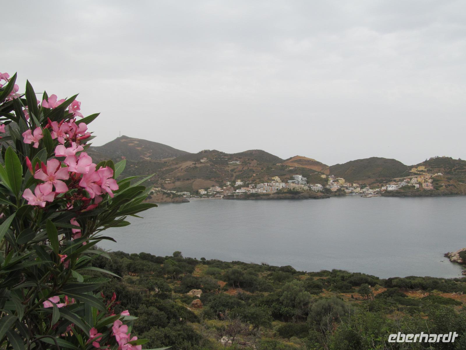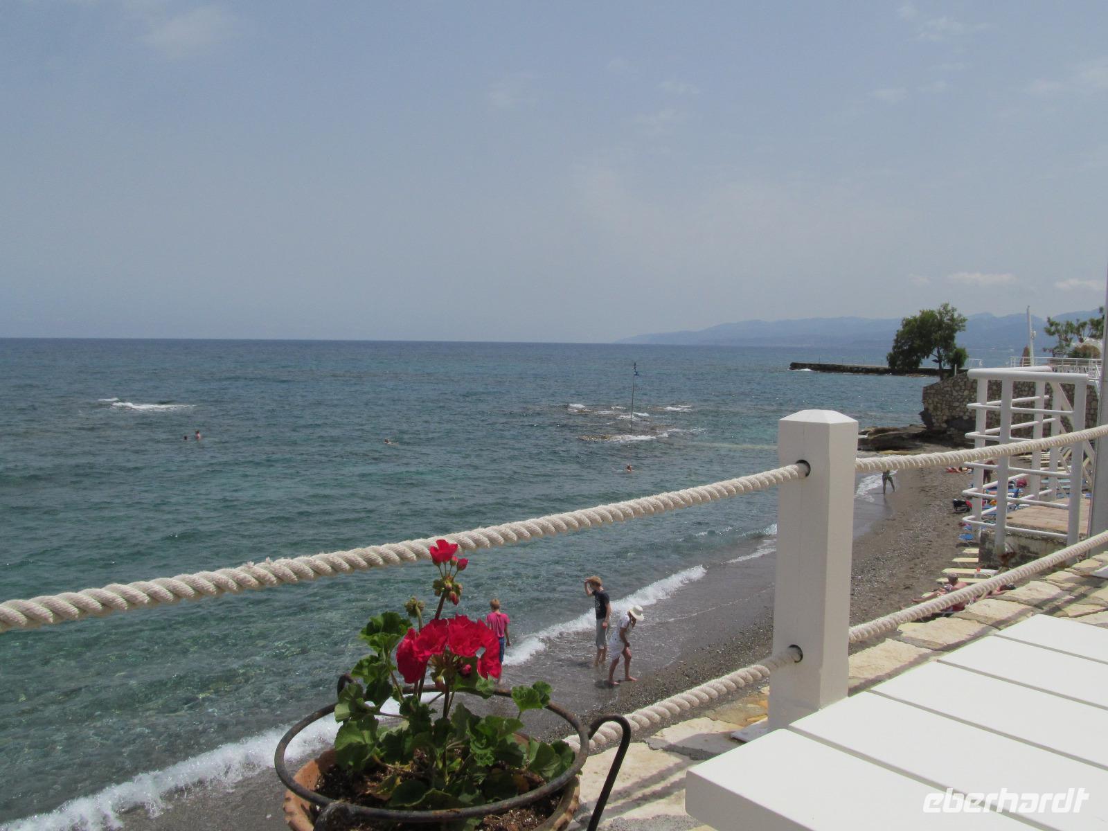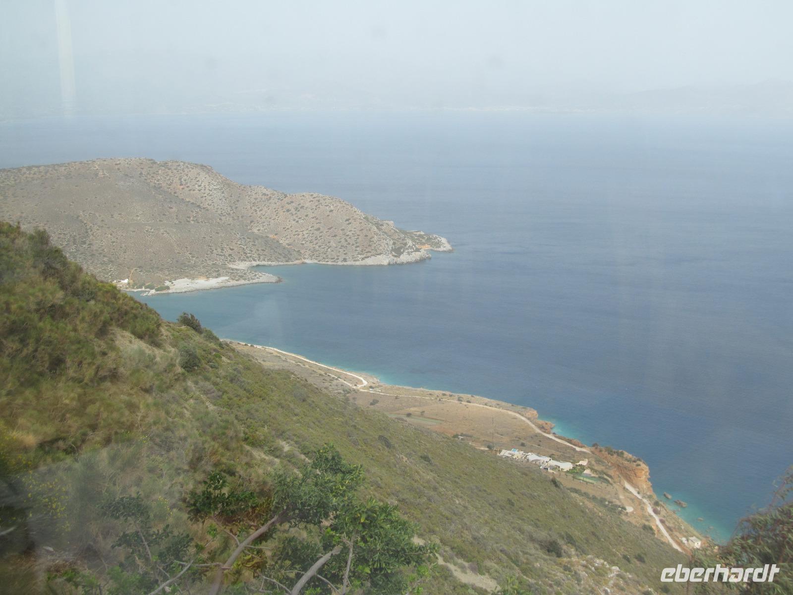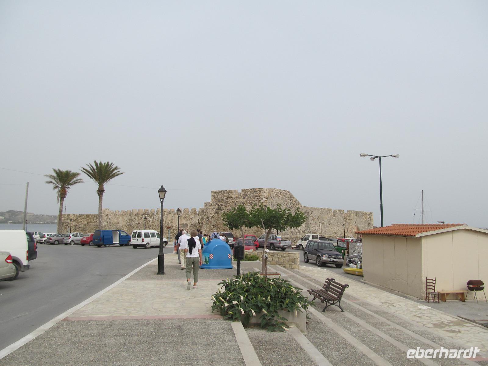 Wie jeden Morgen begrüßte uns Rena mit einem freundlichen „Kalimera", was auf Deutsch „Guten Morgen!" heißt. Wir starteten unseren langen Reisetag in den Osten mit der Fahrt entlang der Küste und legten einen kurzen Fotostopp an der Ruinenstadt Gournia ein, welche man schon von der Straße aus sehr genau erkennen konnte. Danach besichtigten wir, dass Mönchsklöster in Toplou, welches östlich von Sitia liegt. Das Kloster ist von außen sehr schmucklos und einfach, aber es besticht durch seine Geschichte. 1646 und 1821 wurde das Kloster von den Türken angegriffen und ausgeraubt. Im Zweiten Weltkrieg wurde Abt Silingakis von dem deutschen Trupp hingerichtet, da er kretische Widerstandskämpfer aufgenommen hat und ihnen erlaubte im Kloster eine Funkstation zu betreiben. Der mit kleinen Kieselsteinen bepflasterte Innenhof und dreistöckigen Arkaden hat ein romantisches Flair. Im Anschluss fuhren wir noch eine ganze Strecke bis an den östlichen Punkt unserer Rundreise, an den einzigen Palmenwald in Europa- nach Vai. Dort genossen wir ein leckeres Mittagessen und den herrlich Nachmittag am Strand. Auf dem Heimweg hielten wir noch an einem Bananenstand, da uns Rena schon auf dem Hinweg erzählte, dass sie da unbedingt Bananen für Ihre Familie holen müsse, da es die aromatischsten sein. Also ließen wir uns das nicht zweimal sagen und überzeugten uns selbst von dem Geschmack der kleinen gelben Früchte. Um noch mehr von dem Osten kennen zu lernen, führte uns Rena noch zu unserer letzten Station für den heutigen Tag, nach Ireapetra, der südlichsten Stadt Europas. An der Festung unternahmen wir noch eine Toilettenpause und kauften und frisches Wasser, bevor die lange Rückfahrt in das Hotel anstand.