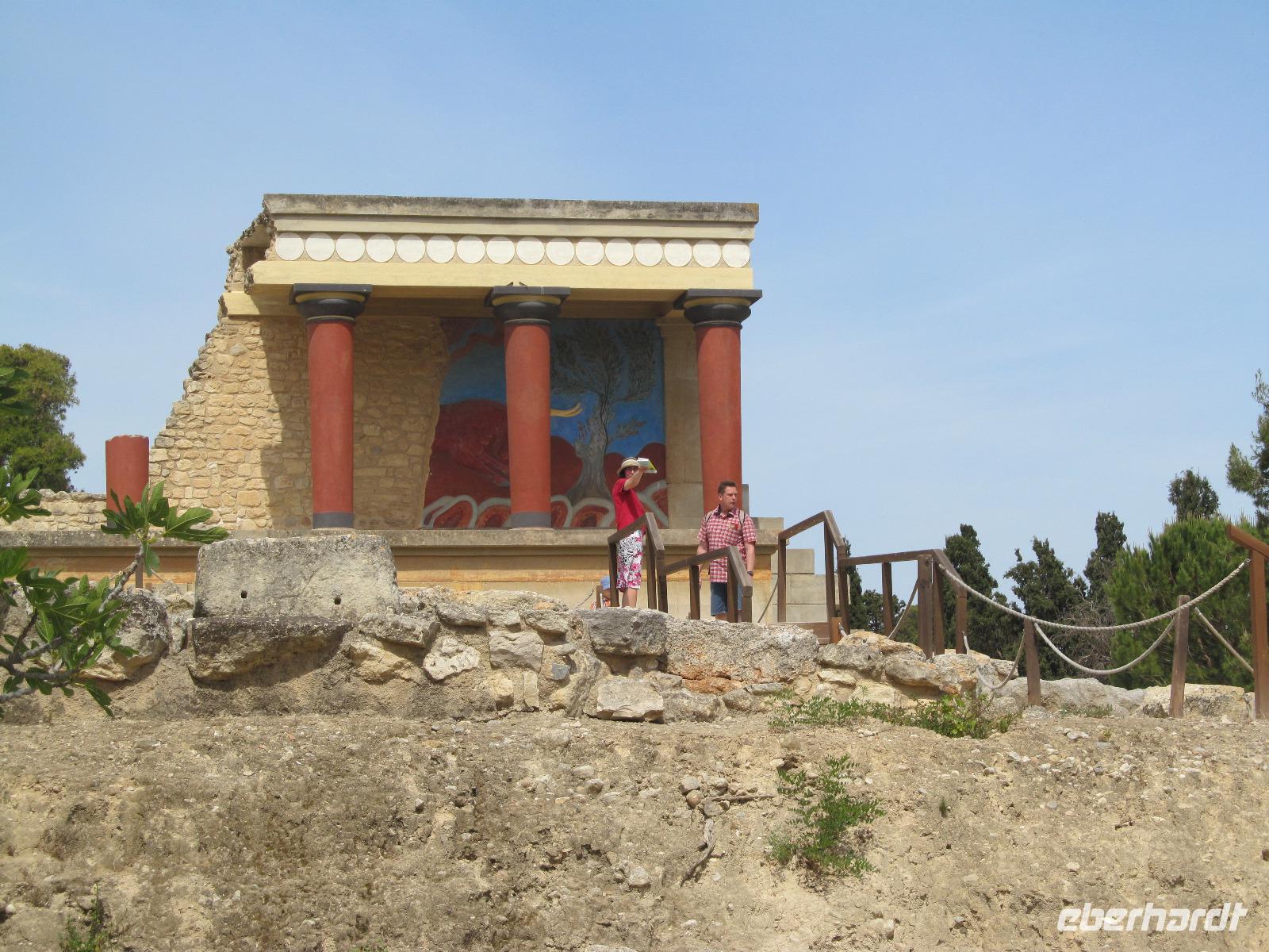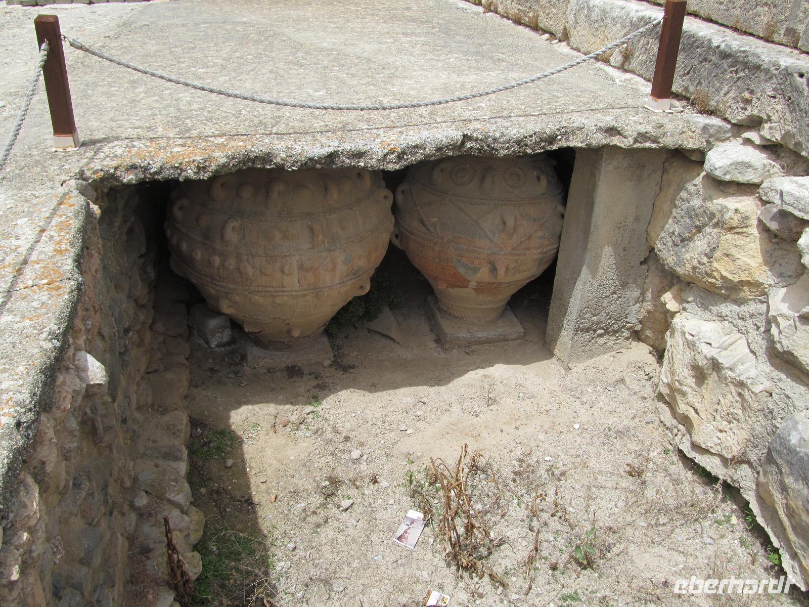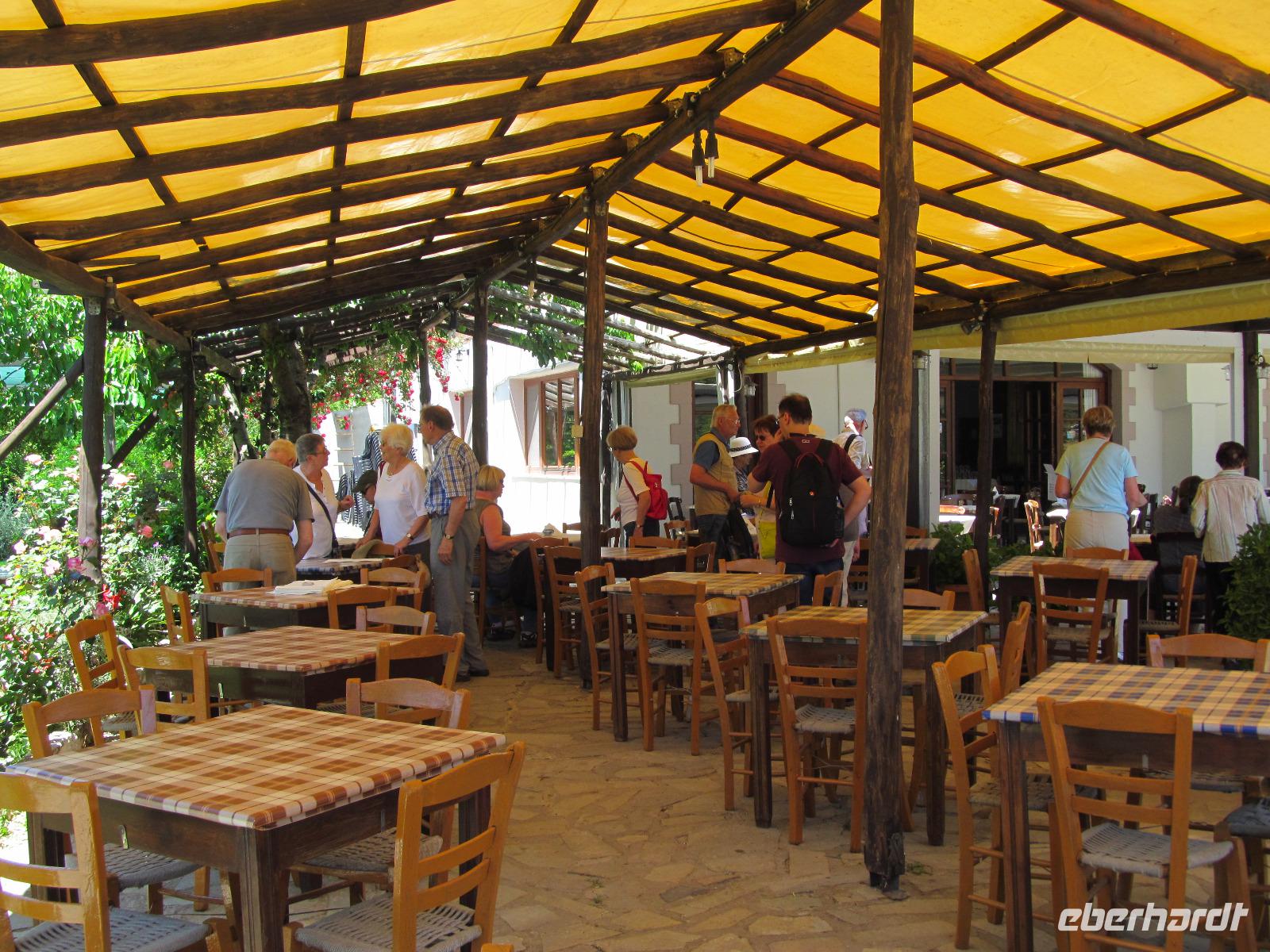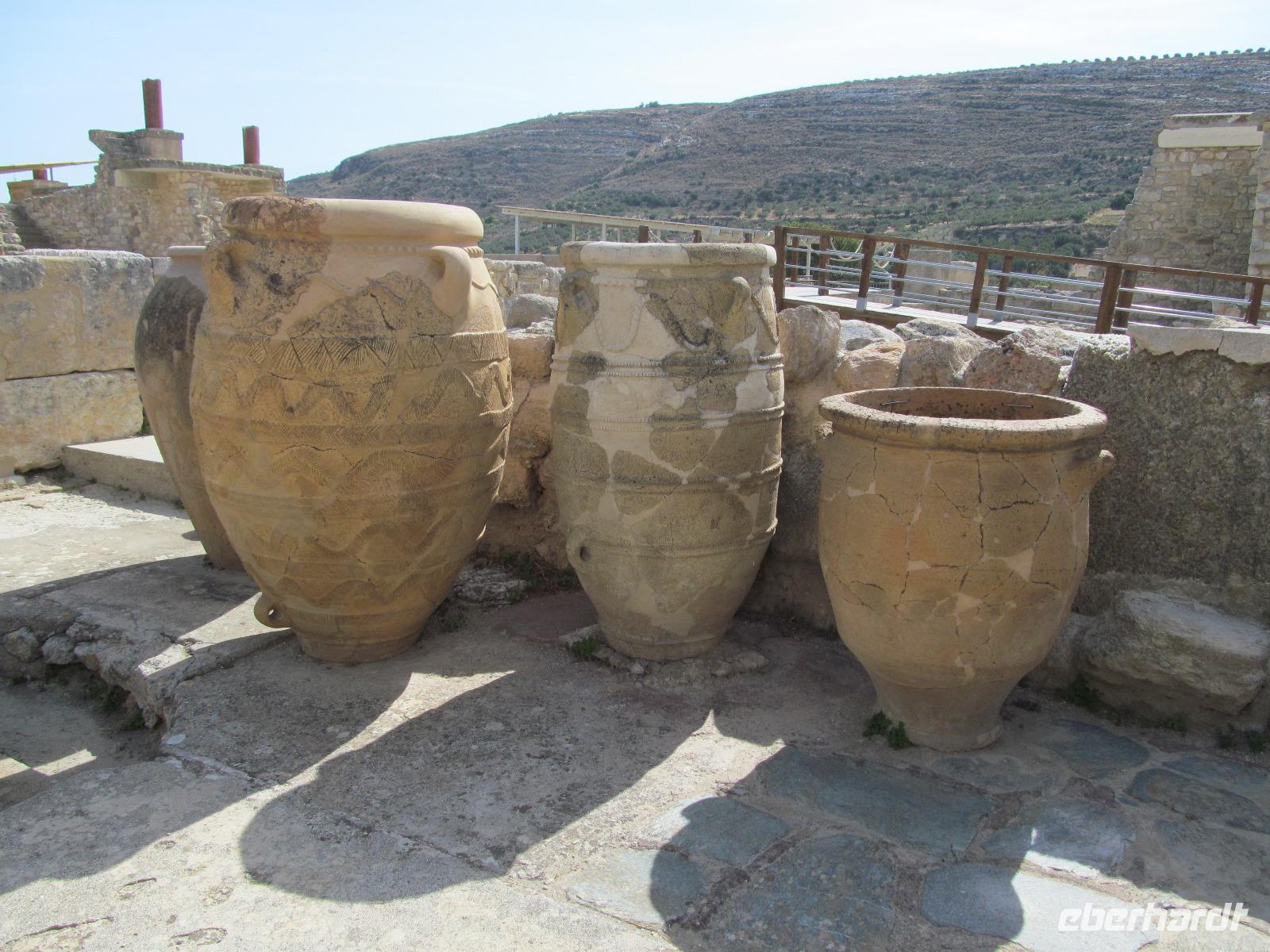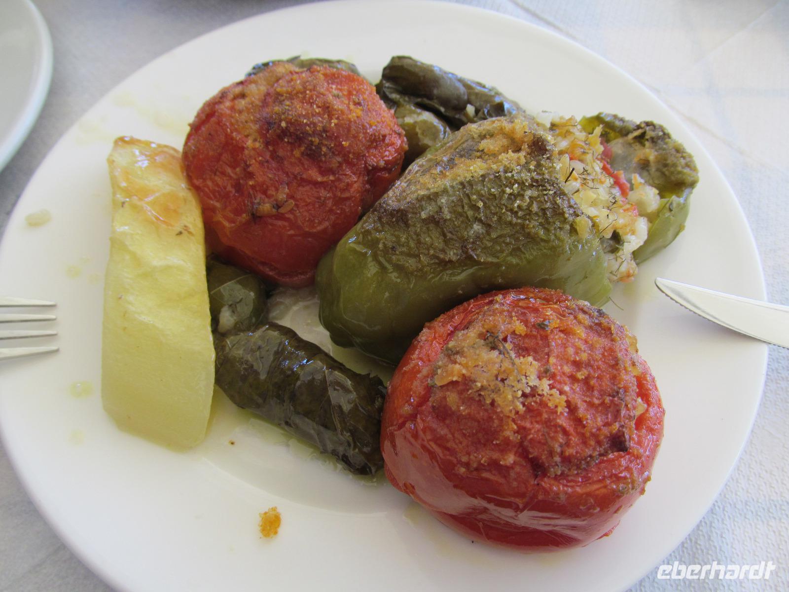 Schon früh wurden wir von den Sonnenstrahlen begrüßt und konnten uns auf einen sonnigen und warmen Tag freuen, der ganz im Zeichen der minoischen Zeit stand. Nach der Fahrt durch die Serpetimen erreichten wir den antiken Palast Knosses. Rena führte uns durch die Anlagen des 21.000 Quadratmeter großen Palastes, wo heute nur noch die Ruinen früherer Zeiten zu sehen sind. Erbaut wurde der Palast erstmals zwischen 2100 und 1800 v. Chr., doch bereits 1750 v. Chr. wurde der Palast von einem gewaltigen Erdbeben heimgesucht und zerstört. Knapp 200 Jahre später errichtete Knossos eine neue, noch gewaltigere Anlage, auf die Ruinen des zerstörten Palastes. Die Gebäude wurden bis zu fünf Stockwerke hoch erbaut und umfassten mehr als 1000 Wohn-, Repräsentations- und Schlafräume. Auch ein Theaterplatz stand für Kultur in dem Palast. Sir Arthur Evans war es, welcher im frühen 20. Jahrhundert mit den ersten Ausgrabungen anfing und zahlreiche Kunstschätze, sowie sagenhafte Malereien ans Licht brachte. Nach der Führung in der Mittagssonne, ging unsere Fahrt weiter nach Miliaraki, auf ein Weingut. Dort wurde uns mit einem kleinen Film im Kinosaal die Wein- und Ölherstellung näher gebracht. Nach dem informativen Teil, konnten wir nun auch selbst vier Weine probieren. Dazu wurden uns kleine Häppchen in Olivenöl serviert. Nach nur wenigen Fahrminuten verließen wir unseren Bus schon wieder und wir besuchten eine Töpferwerkstatt in Thrapsano. Wir bekamen einen Einblick in das Handwerk von dem Sohn, dessen Vater der Besitzer der Werkstatt war. Er demonstrierte uns kunstvoll die Herstellung eines Tonkruges, von der wir alle sehr beeindruckt waren. In dem kleinen Laden nebenan, konnten wir uns dann ein kleines Andenken an die Handwerkskunst mitnehmen. Zum Abschluss des Tages fuhren wir noch in die Hauptstadt Kretas- Heraklion. Dort führte uns Rena von dem Platz der Freiheit bis hin zum Dreh-und Angelpunkt der Stadt an einen Brunnen, nahe dem Hafen. An der Titos Basilika konnten wir individuell unsere 1 stündige Freizeit in der Stadt genießen. Einige begaben sich noch einmal auf die Spuren der Geschichte Kretas und besuchten das archäologische Museum der Hauptstadt. Andere unternahmen einen kleinen Spaziergang entlang des venezianischen Hafens oder tranken einen typisch griechischen Kaffee in einer der kleinen Lokalitäten am Hauptbrunnen. Am späten Nachmittag trafen wir wieder am Hotel ein um uns auf den anstehenden Tavernenabend vorzubereiten. Zusammen mit der Wandergruppe erreichten wir nach einer 30 minütigen fahrt eine typische kretische Taverne umgeben von einer Gebirgigen Landschaft. Auf dem Weg zur Taverne begrüßten uns schon die Folkloretänzer mit einem Raki und einem Glas Rotwein. Wir genossen den Abend bei einem tollen Buffet, mit musikalischer Untermalung und Tanzeinlagen kretischer Folkloretänzer.