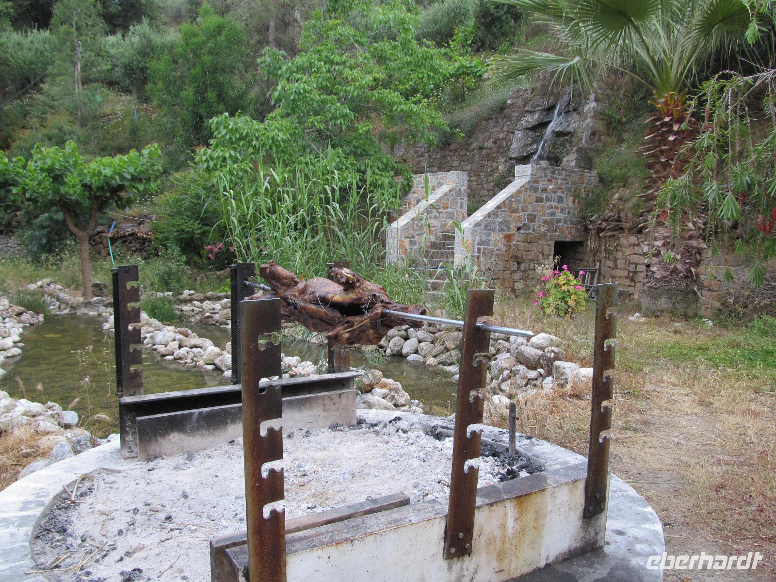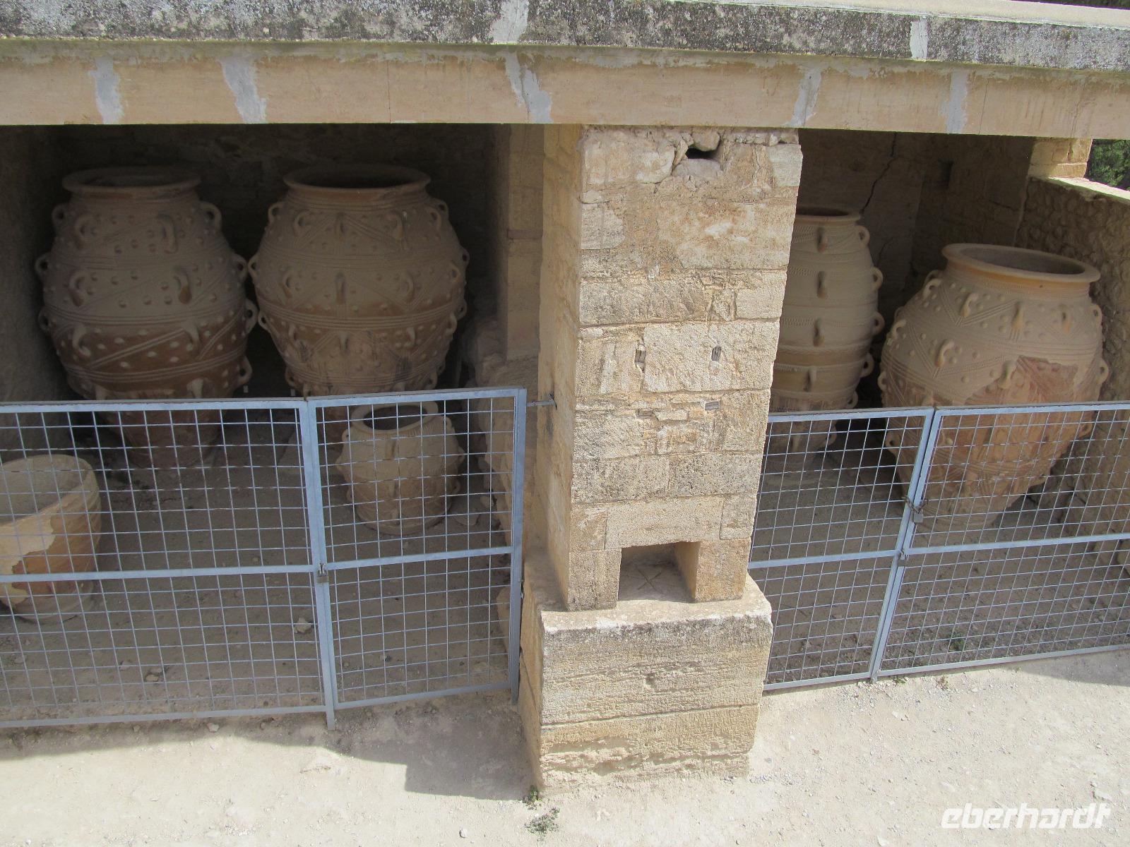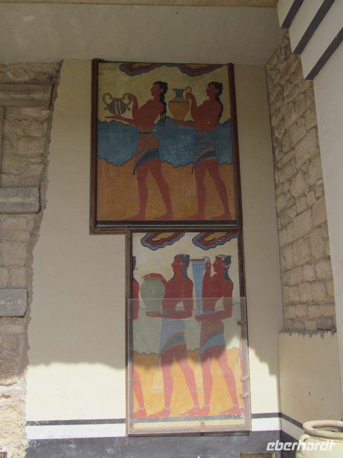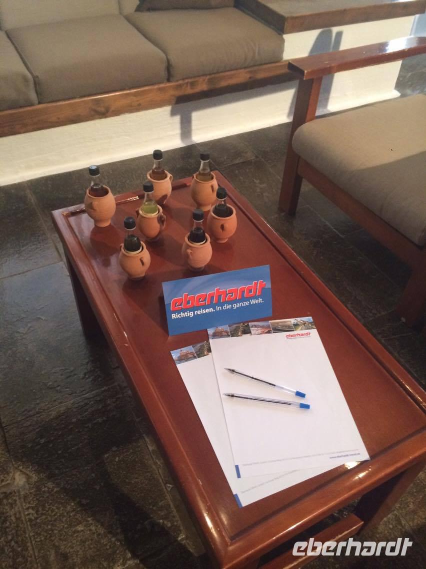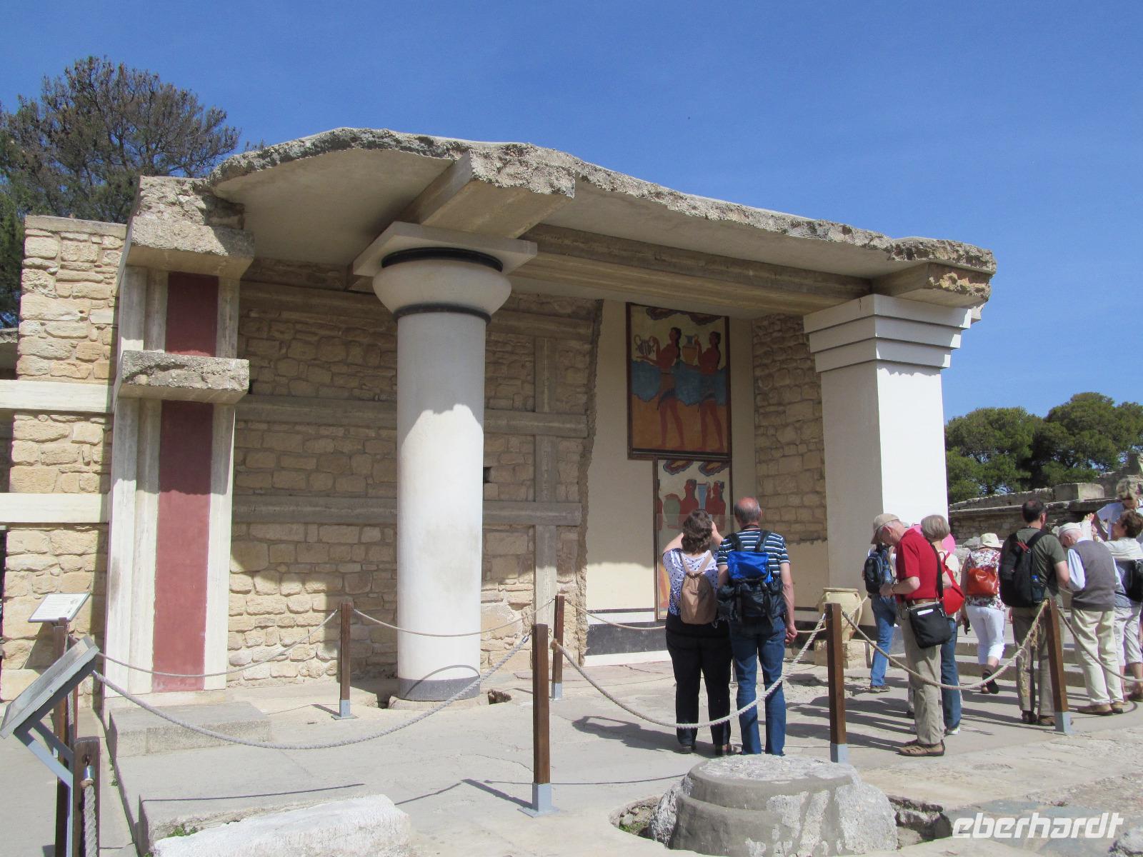 Schon früh wurden wir von den Sonnenstrahlen begrüßt und konnten uns auf einen sonnigen und warmen Tag freuen, der ganz im Zeichen der minoischen Zeit stand. Nach der Fahrt durch die Serpetimen erreichten wir den antiken Palast Knosses. Rena führte uns durch die Anlagen des 21.000 Quadratmeter großen Palastes, wo heute nur noch die Ruinen früherer Zeiten zu sehen sind. Erbaut wurde der Palast erstmals zwischen 2100 und 1800 v. Chr., doch bereits 1750 v. Chr. wurde der Palast von einem gewaltigen Erdbeben heimgesucht und zerstört. Knapp 200 Jahre später errichtete Knossos eine neue, noch gewaltigere Anlage, auf die Ruinen des zerstörten Palastes. Die Gebäude wurden bis zu fünf Stockwerke hoch erbaut und umfassten mehr als 1000 Wohn-, Repräsentations- und Schlafräume. Auch ein Theaterplatz stand für Kultur in dem Palast. Sir Arthur Evans war es, welcher im frühen 20. Jahrhundert mit den ersten Ausgrabungen anfing und zahlreiche Kunstschätze, sowie sagenhafte Malereien ans Licht brachte. Nach der Führung in der Mittagssonne, ging unsere Fahrt weiter nach Miliaraki, auf ein Weingut. Dort wurde uns mit einem kleinen Film im Kinosaal die Wein- und Ölherstellung näher gebracht. Nach dem informativen Teil, konnten wir nun auch selbst vier Weine probieren. Dazu wurden uns kleine Häppchen in Olivenöl serviert. Nach nur wenigen Fahrminuten verließen wir unseren Bus schon wieder und wir besuchten eine Töpferwerkstatt in Thrapsano. Wir bekamen einen Einblick in das Handwerk von dem Sohn, dessen Vater der Besitzer der Werkstatt war. Er demonstrierte uns kunstvoll die Herstellung eines Tonkruges, von der wir alle sehr beeindruckt waren. In dem kleinen Laden nebenan, konnten wir uns dann ein kleines Andenken an die Handwerkskunst mitnehmen. Zum Abschluss des Tages fuhren wir noch in die Hauptstadt Kretas- Heraklion. Dort führte uns Rena von dem Platz der Freiheit bis hin zum Dreh-und Angelpunkt der Stadt an einen Brunnen, nahe dem Hafen. An der Titos Basilika konnten wir individuell unsere 1 stündige Freizeit in der Stadt genießen. Einige begaben sich noch einmal auf die Spuren der Geschichte Kretas und besuchten das archäologische Museum der Hauptstadt. Andere unternahmen einen kleinen Spaziergang entlang des venezianischen Hafens oder tranken einen typisch griechischen Kaffee in einer der kleinen Lokalitäten am Hauptbrunnen. Am späten Nachmittag trafen wir wieder am Hotel ein um uns auf den anstehenden Tavernenabend vorzubereiten. Zusammen mit der Wandergruppe erreichten wir nach einer 30 minütigen fahrt eine typische kretische Taverne umgeben von einer Gebirgigen Landschaft. Auf dem Weg zur Taverne begrüßten uns schon die Folkloretänzer mit einem Raki und einem Glas Rotwein. Wir genossen den Abend bei einem tollen Buffet, mit musikalischer Untermalung und Tanzeinlagen kretischer Folkloretänzer.