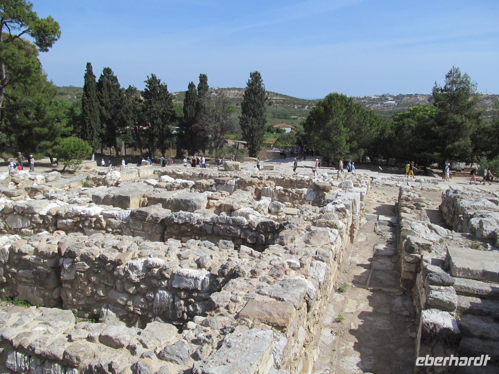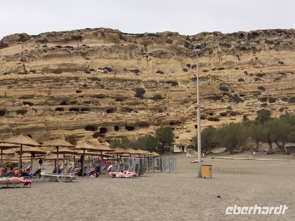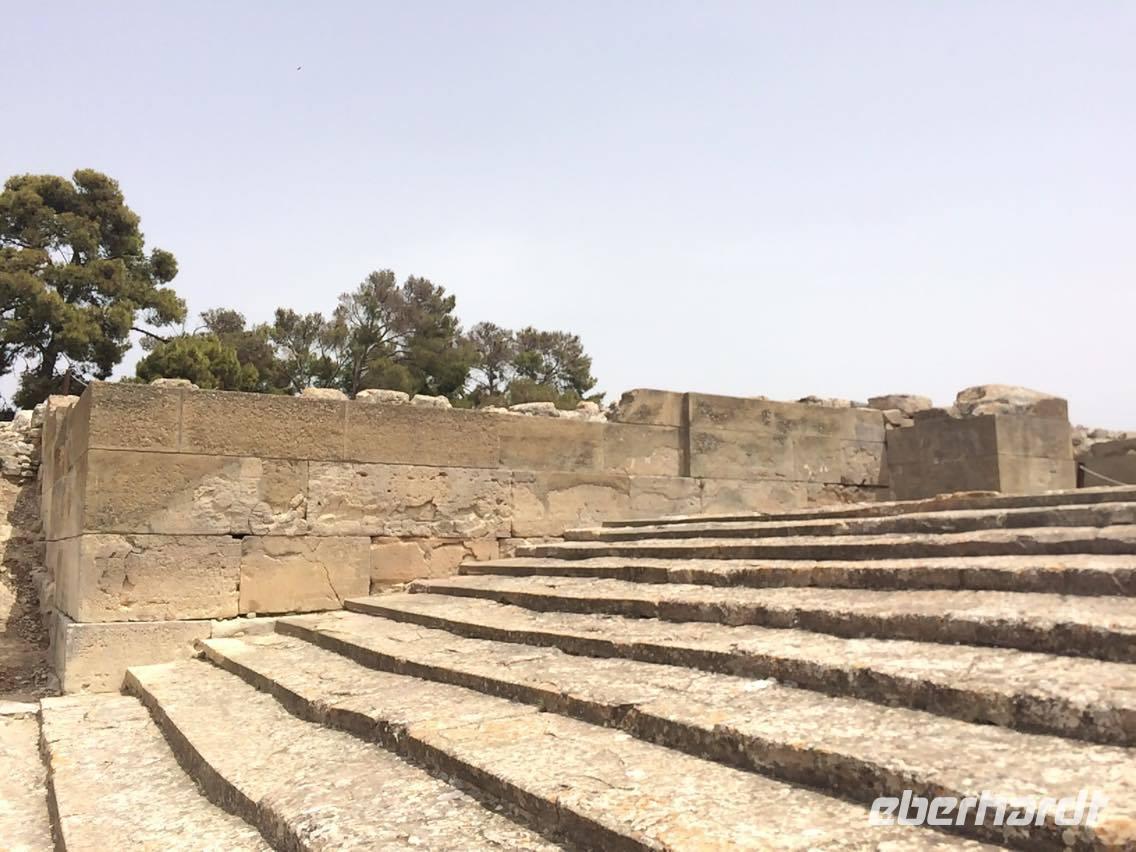 Nach einem langen Folkloreabend, begannen wir unser heutiges Tagesprogramm erst 9 Uhr. Unser Weg führte uns wieder durch die Messara-Ebene in Richtung Süden. Zunächst besuchten wir die Titus-Basilika und Odeions in Gortys. Rena führte uns durch die ehemalige Stadt, welche für ihre griechischen Gesetzestafeln aus dem 5. Jahrhundert bekannt war. Sie zeigte uns auch eine große alte Plantane, unter der laut Erzählungen Zeus mit Europa den jungen Sohn Minos gezeigt habe soll. Noch heute noch kommen junge Paare dort hin und pflücken drei Blätter von dem Baum, um drei gesunde Söhne zu bekommen. Nach einer kleinen Pause mit einem frisch gepressten Orangensaft und einem Kaffee, ging die Fahrt weiter, zur zweit größten Palastanlage nach Knossos-Festos. Die Anlage liegt hoch oben auf einem Berg in der Messara-Ebene, wo der 2. Sohn Zeus, Rhadamanthys lebte. Rena führte uns über das Theater, entlang der Vorratskammern in Richtung des Westhofes und zog immer wieder Parallelen zu der Palastanlage in Knossos. Die Anlage von Festos wurde zweimal erbaut, wodurch es immer wieder neue und alte Gesteins- und Bauarten zu sehen gab. Nach den vielen historischen Eindrücken, nahmen wir uns eine kleine Auszeit im Fischerdorf Matala, wo wir unser Mittagessen einnahmen. Anschließen stand die Zeit zu freien Verfügung, für einen Spaziergang durch die bunte Hippiestadt, mit einer Vielzahl an Geschäften oder einen Sprung in das kühle Nass am Strand von Matala. Auch eine Besichtigung der Hippie-Höhlen war möglich. Am späten Nachmittag trafen wir wieder im Hotel ein und wir nutzen die warmen Temperaturen für ein paar Stunden am Strand.