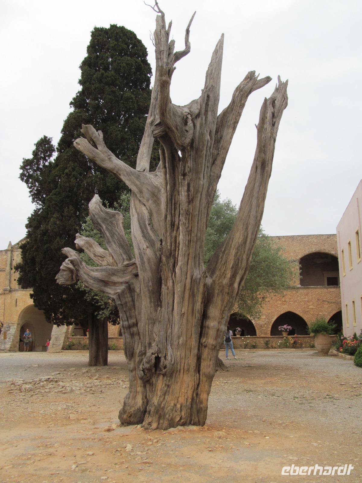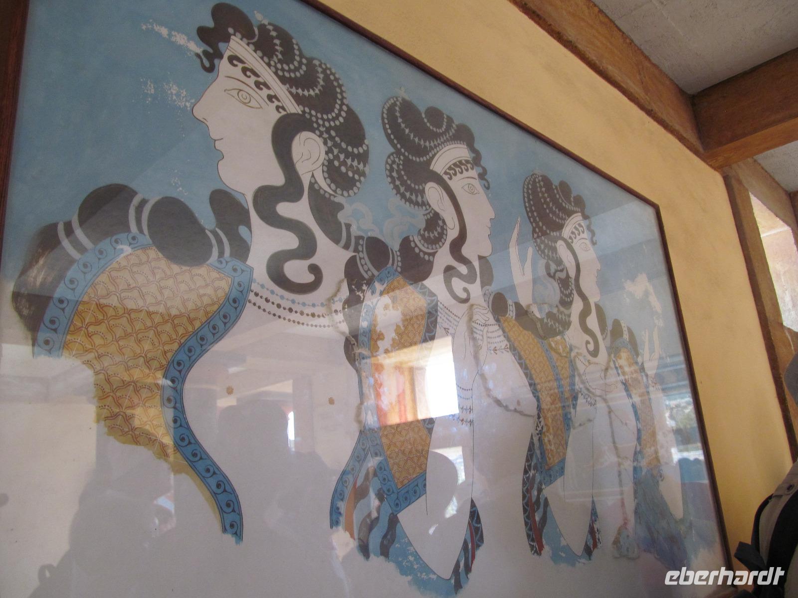 Am frühen Morgen, nach einem reichhaltigen Frühstück begrüßte uns Rena, unsere Reiseleiterin für die Rundreise auf Kreta. Unsere Fahrt führte uns durch die Messara-Ebene, mit einem kleinen Zwischenstopp an Getreidemühlen nach Thrapsano. Dort besichtigten wir die Kirche Panagia i Kardiotissa in Kera. Von dem Hof der Kirche aus hatte man einen wunderbaren Blick auf das Dikti-Gebirge und das weit entfernte Meer. Die Kirche war mit reichlich Gold und berühmten Ikonen ihrer Zeit geschmückt. Neben dem Altar befand sich ein Blumenbett, mit reichlicher Verzierung. Nach ein wenig Freizeit für unsere Fotografen, ging unsere Fahrt weiter, gen Osten zu der Geburtsstätte Zeus. Auf dem Weg dahin, erzählte uns Rena bereits viel von den Mythologien rund um Zeus und seine Familie. In Psichro angekommen unternahmen einige unserer Gäste eine kleine Wanderung hoch in die Höhle, andere benutzen ein bequemeres Fortbewegungsmittel -einen Esel, um sich Puste zu sparen. Die beeindruckende Tropfsteinhöhle mit seinen Stalaktiten und Stalagmiten führte bis tief in den Berg hinein. Nach dem alle wieder unten angekommen waren, ging unsere Fahrt weiter und führte uns in eine typisch griechische Taverne, welche familiär geführt war, wo wir unser Mittagessen einnahmen. Nach einem kleinen Spaziergang durch das Dorf, fuhren wir wieder zurück in das Hotel. Unterwegs legten wir noch einen kleinen Zwischenstopp in Krasi ein, wo wir uns den ältesten Platanenbaum Kreats anschauten, mit seinem gewältigen Stamm und den weitläufigen Ästen. Im Hotel angekommen aßen wir und verbrachten dann unseren Abend an der Poolbar des Hotels bei einem Folkloreabend.