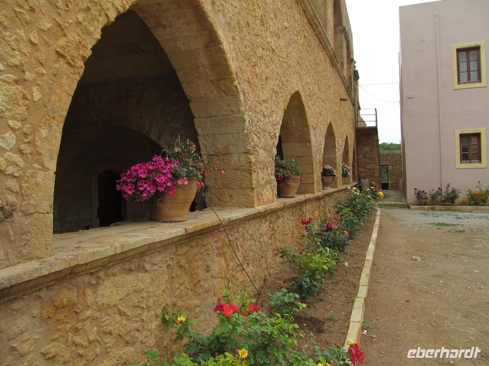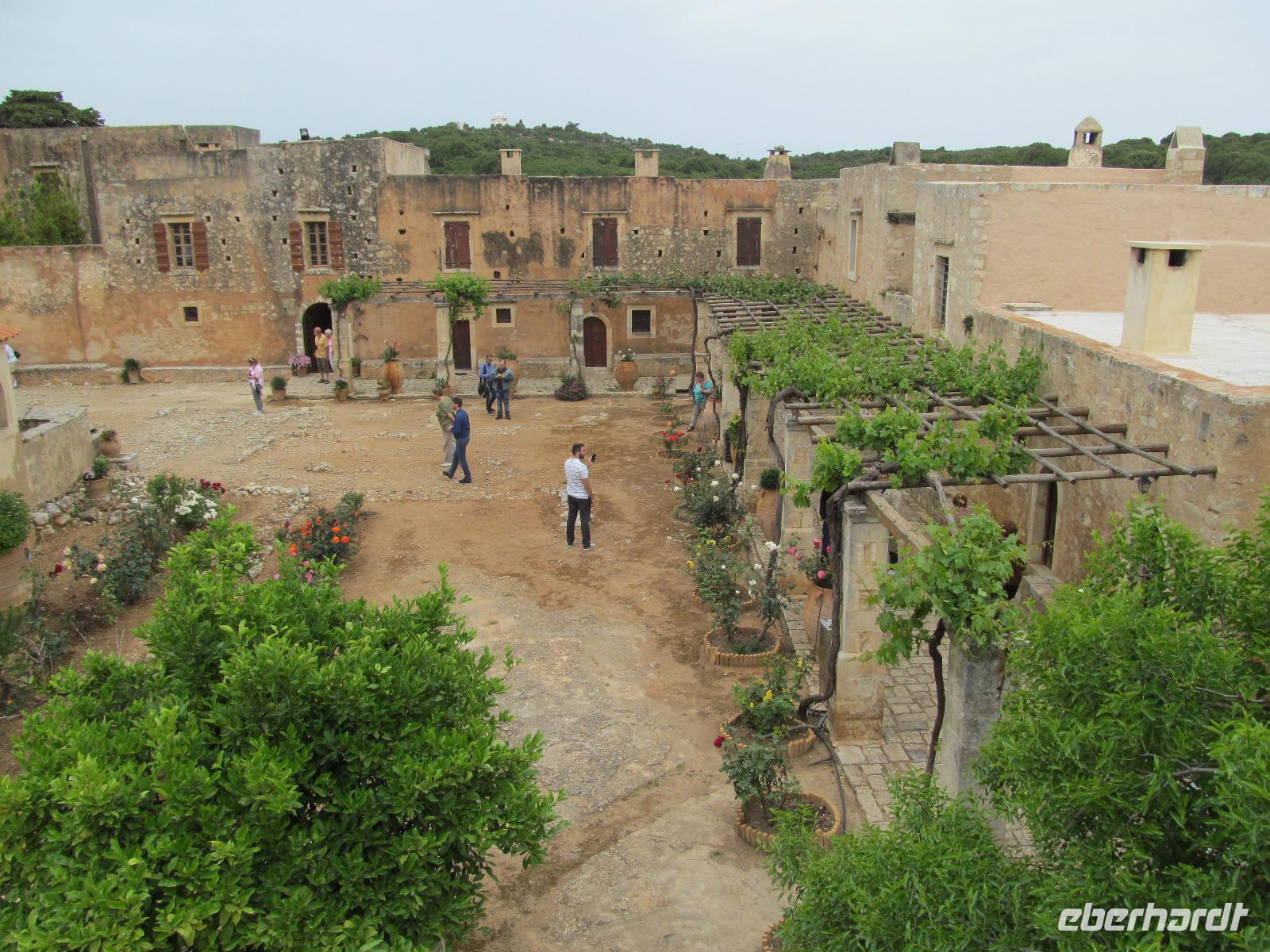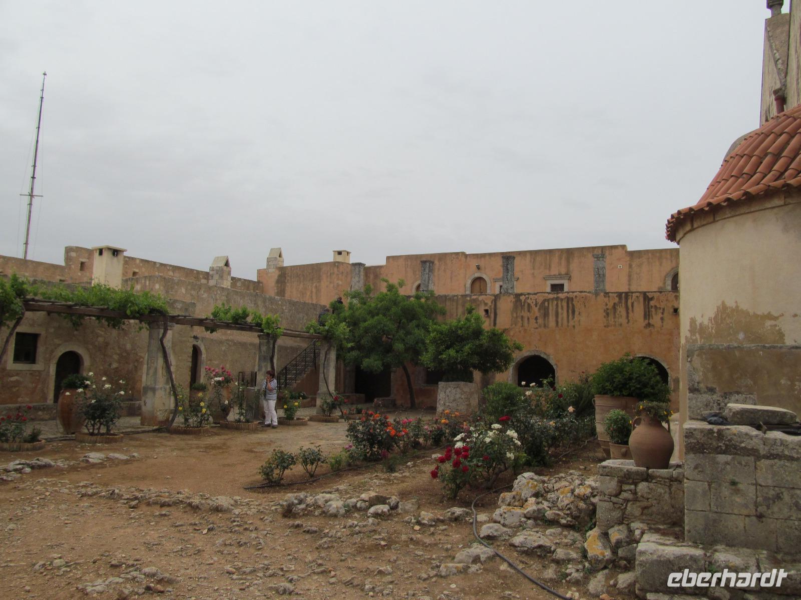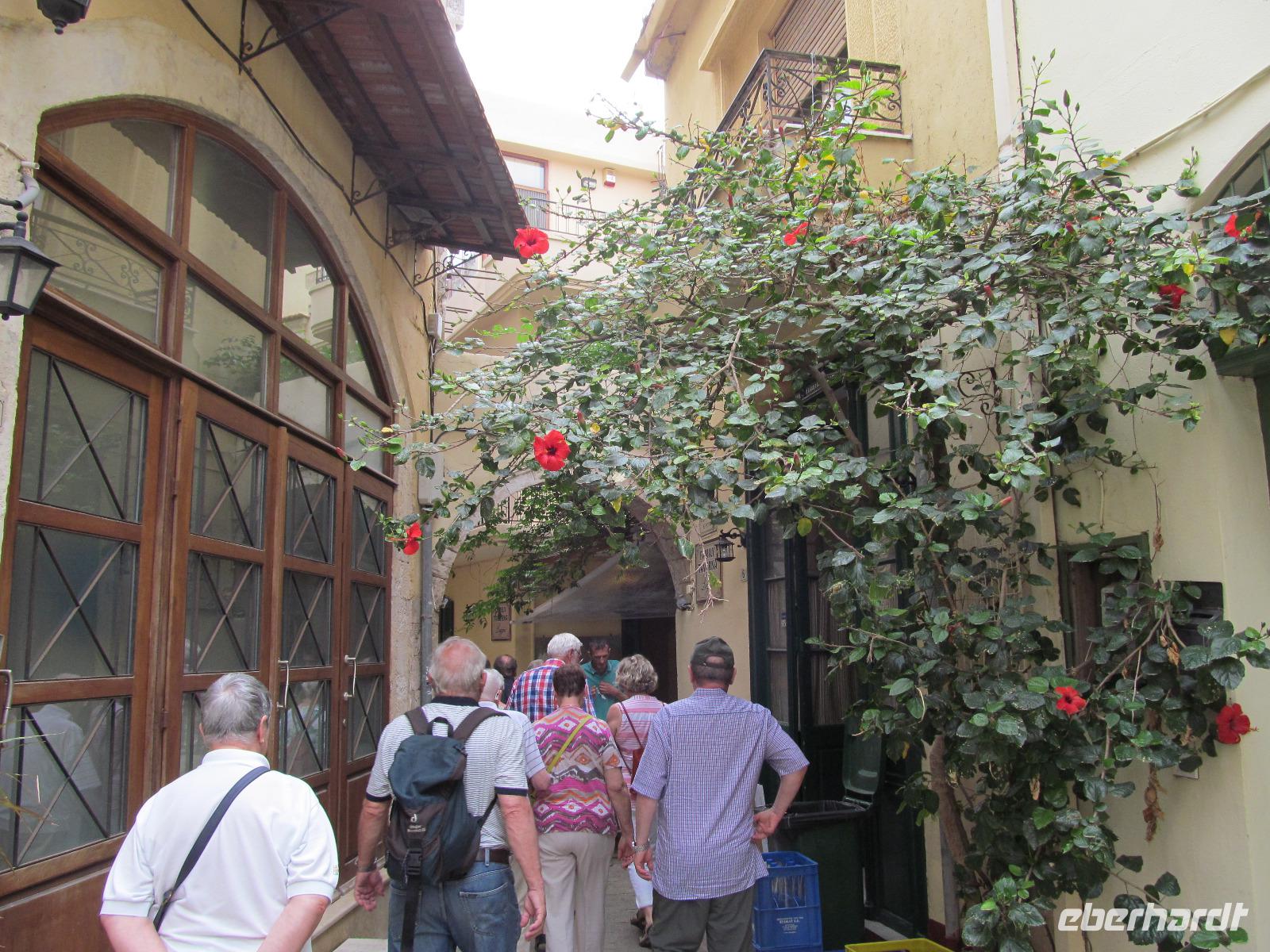Auch heute begrüßte uns Rena wieder, wie jeden Morgen mit dem fröhlichen Lied „Kalimera, ti kaneis, sagapao polis", was so viel heißt wie „Guten Morgen, wie geht es Dir". In diesem Sinne ging es für uns heute in den Westen der Insel, mit nicht so schönem Wetter wie die tage zu vor, da es sehr stürmisch und regnerisch war. Dennoch ließen wir uns nicht davon beeindrucken und machten unseren ersten Stopp des Tages an dem bedeutendsten Kloster Kretas...Arkadi. Das Kloster ist ein Zeichen für die Freiheit der Kretaner gegenüber der Türkenherrschaft und somit ein Nationalheiligtum der Insel. Noch heute erinnern die Schädel duzender Gefallener im Beinhaus an die vielen Opfer der Schlacht um Arkadi. Die Klostermauern im Stil der Renaissance sind mit zahlreichen Blumen geschmückt und bieten einen idyllischen Ausblick. Nach dem Einblick in die Geschichte des Kloster Arkadi begaben wir uns auf die Weiterreise in die 2. Größte Stadt der Insel, nämlich nach Chania. Dort wurden wir von unserem Busfahrer vor die zentrale Markthalle der Stadt gebracht, von wo aus wir unseren Spaziergang bis zu dem venezianischen Hafen unternommen. Danach konnte jeder auf eigene Faust, je nach Vorlieben, die Stadt erkunden. Die Meisten suchten sich ein nettes Restaurant an der Hafenpromenade oder gingen durch die vielen romanischen Gassen um Souvenir oder ähnliches zu erwerben. Nach unserem Aufenthalt in der Altstadt ging unsere Fahrt weiter nach Rethymno. Dort führte uns Rena durch die kleinen schmalen Einkaufsgassen, entlang an vielen Schuck- und Schuhgeschäften zu einer kleinen offenen Baklava-Bäckerei, wo uns der Werdegang des Teiges bis hin zu Fertigstellung der süßen Teigware demonstriert wurde. Durch das plötzliche Eintreten von einem Regenschauer verkürzte sich unser Aufenthalt in dem Ferienort Rethymno und wir fuhren nach einem langen Tag wieder zurück in das Hotel.