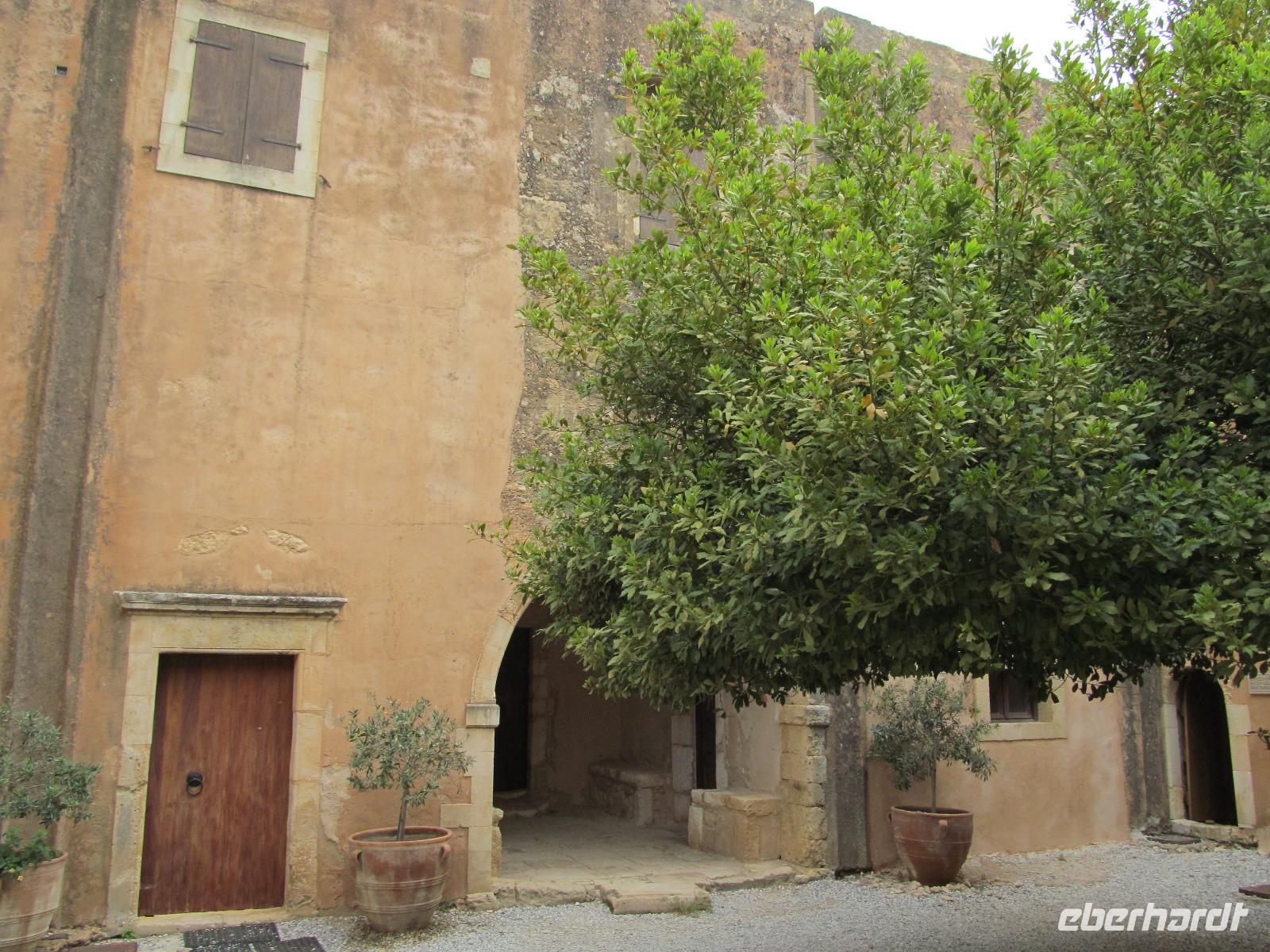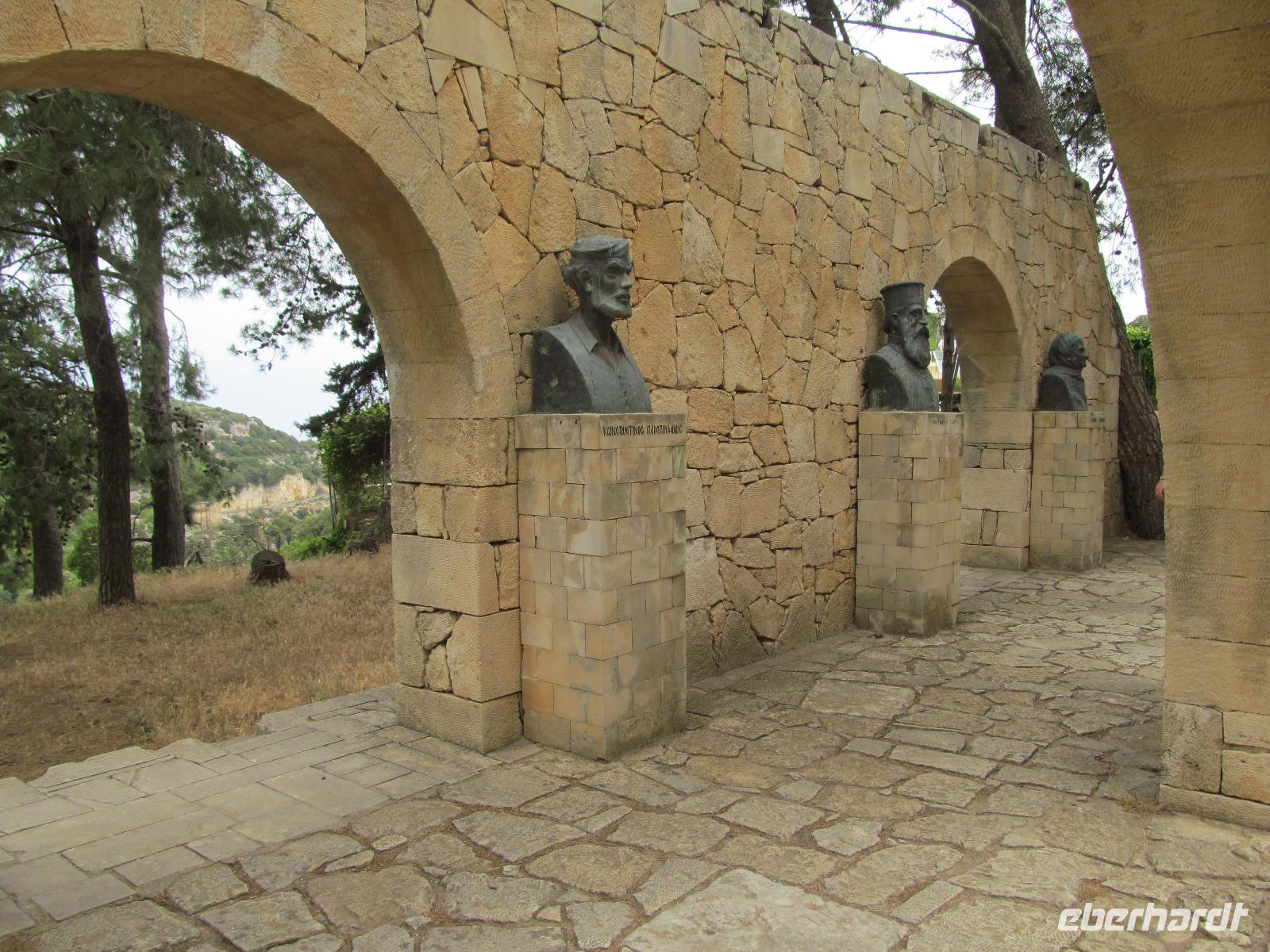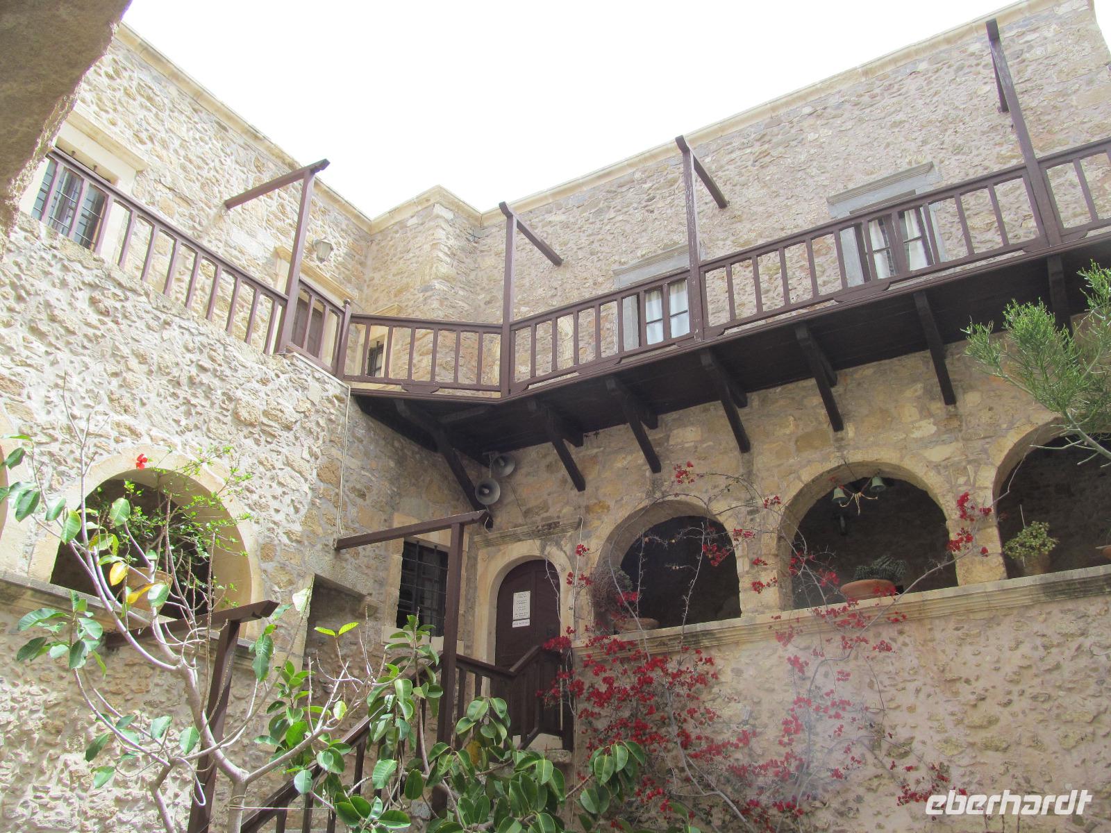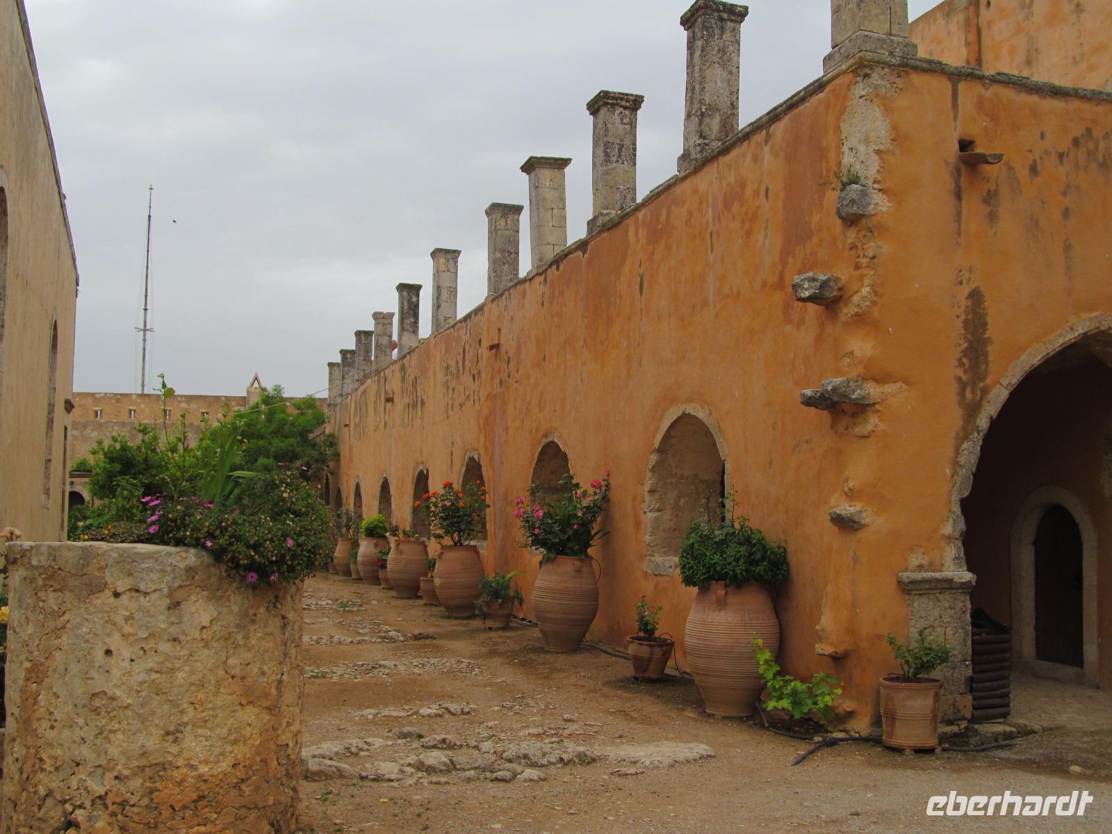 Auch heute begrüßte uns Rena wieder, wie jeden Morgen mit dem fröhlichen Lied „Kalimera, ti kaneis, sagapao polis", was so viel heißt wie „Guten Morgen, wie geht es Dir". In diesem Sinne ging es für uns heute in den Westen der Insel, mit nicht so schönem Wetter wie die tage zu vor, da es sehr stürmisch und regnerisch war. Dennoch ließen wir uns nicht davon beeindrucken und machten unseren ersten Stopp des Tages an dem bedeutendsten Kloster Kretas...Arkadi. Das Kloster ist ein Zeichen für die Freiheit der Kretaner gegenüber der Türkenherrschaft und somit ein Nationalheiligtum der Insel. Noch heute erinnern die Schädel duzender Gefallener im Beinhaus an die vielen Opfer der Schlacht um Arkadi. Die Klostermauern im Stil der Renaissance sind mit zahlreichen Blumen geschmückt und bieten einen idyllischen Ausblick. Nach dem Einblick in die Geschichte des Kloster Arkadi begaben wir uns auf die Weiterreise in die 2. Größte Stadt der Insel, nämlich nach Chania. Dort wurden wir von unserem Busfahrer vor die zentrale Markthalle der Stadt gebracht, von wo aus wir unseren Spaziergang bis zu dem venezianischen Hafen unternommen. Danach konnte jeder auf eigene Faust, je nach Vorlieben, die Stadt erkunden. Die Meisten suchten sich ein nettes Restaurant an der Hafenpromenade oder gingen durch die vielen romanischen Gassen um Souvenir oder ähnliches zu erwerben. Nach unserem Aufenthalt in der Altstadt ging unsere Fahrt weiter nach Rethymno. Dort führte uns Rena durch die kleinen schmalen Einkaufsgassen, entlang an vielen Schuck- und Schuhgeschäften zu einer kleinen offenen Baklava-Bäckerei, wo uns der Werdegang des Teiges bis hin zu Fertigstellung der süßen Teigware demonstriert wurde. Durch das plötzliche Eintreten von einem Regenschauer verkürzte sich unser Aufenthalt in dem Ferienort Rethymno und wir fuhren nach einem langen Tag wieder zurück in das Hotel.