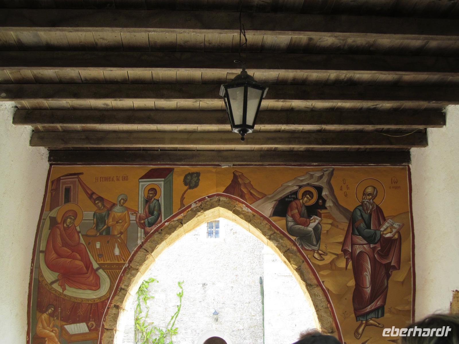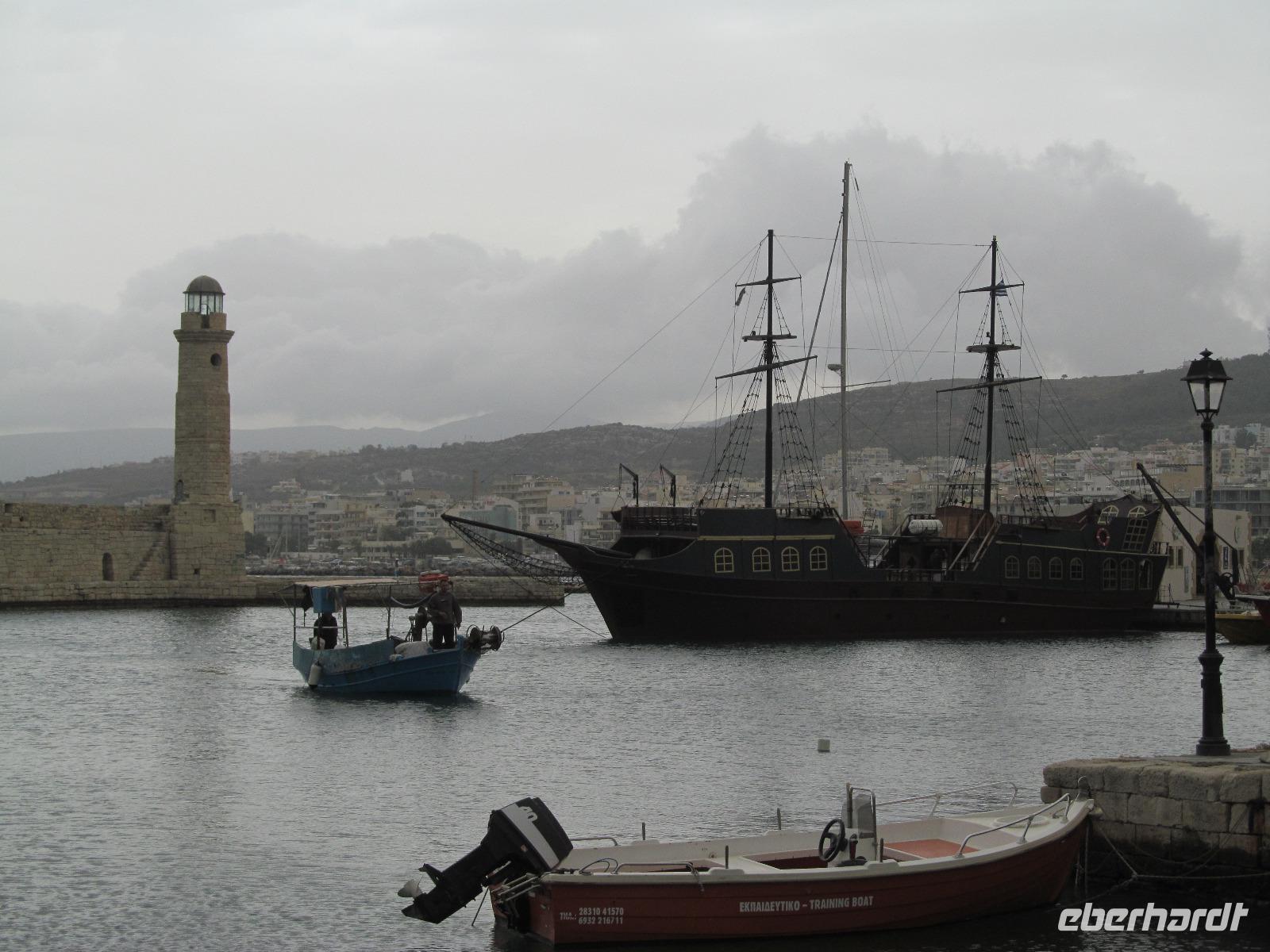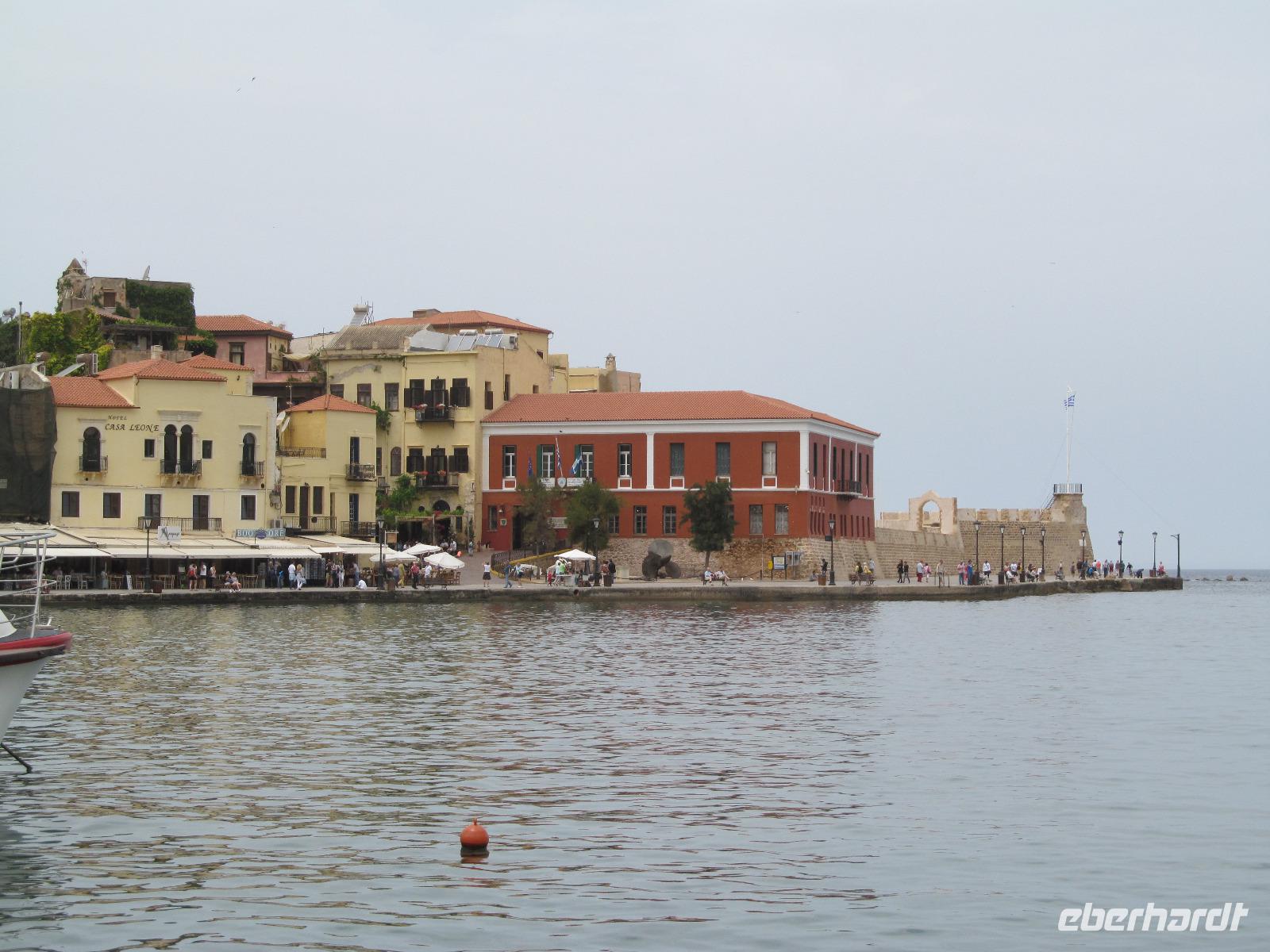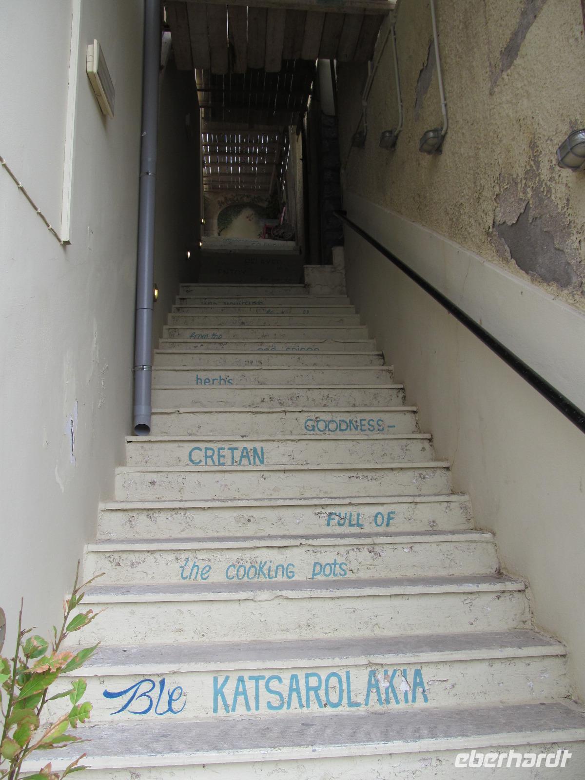 Auch heute begrüßte uns Rena wieder, wie jeden Morgen mit dem fröhlichen Lied „Kalimera, ti kaneis, sagapao polis", was so viel heißt wie „Guten Morgen, wie geht es Dir". In diesem Sinne ging es für uns heute in den Westen der Insel, mit nicht so schönem Wetter wie die tage zu vor, da es sehr stürmisch und regnerisch war. Dennoch ließen wir uns nicht davon beeindrucken und machten unseren ersten Stopp des Tages an dem bedeutendsten Kloster Kretas...Arkadi. Das Kloster ist ein Zeichen für die Freiheit der Kretaner gegenüber der Türkenherrschaft und somit ein Nationalheiligtum der Insel. Noch heute erinnern die Schädel duzender Gefallener im Beinhaus an die vielen Opfer der Schlacht um Arkadi. Die Klostermauern im Stil der Renaissance sind mit zahlreichen Blumen geschmückt und bieten einen idyllischen Ausblick. Nach dem Einblick in die Geschichte des Kloster Arkadi begaben wir uns auf die Weiterreise in die 2. Größte Stadt der Insel, nämlich nach Chania. Dort wurden wir von unserem Busfahrer vor die zentrale Markthalle der Stadt gebracht, von wo aus wir unseren Spaziergang bis zu dem venezianischen Hafen unternommen. Danach konnte jeder auf eigene Faust, je nach Vorlieben, die Stadt erkunden. Die Meisten suchten sich ein nettes Restaurant an der Hafenpromenade oder gingen durch die vielen romanischen Gassen um Souvenir oder ähnliches zu erwerben. Nach unserem Aufenthalt in der Altstadt ging unsere Fahrt weiter nach Rethymno. Dort führte uns Rena durch die kleinen schmalen Einkaufsgassen, entlang an vielen Schuck- und Schuhgeschäften zu einer kleinen offenen Baklava-Bäckerei, wo uns der Werdegang des Teiges bis hin zu Fertigstellung der süßen Teigware demonstriert wurde. Durch das plötzliche Eintreten von einem Regenschauer verkürzte sich unser Aufenthalt in dem Ferienort Rethymno und wir fuhren nach einem langen Tag wieder zurück in das Hotel.