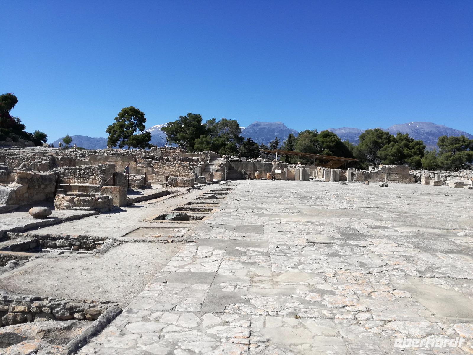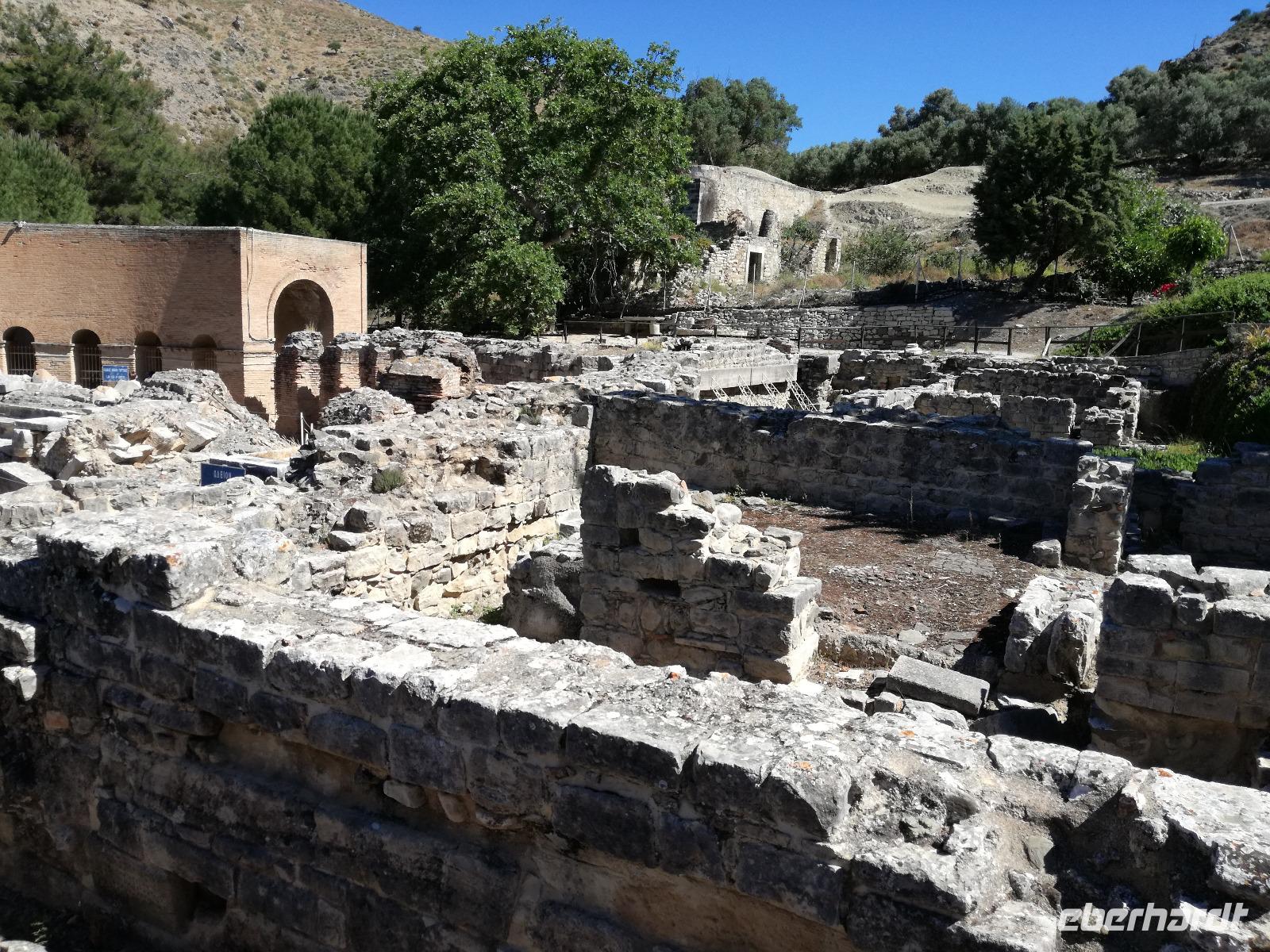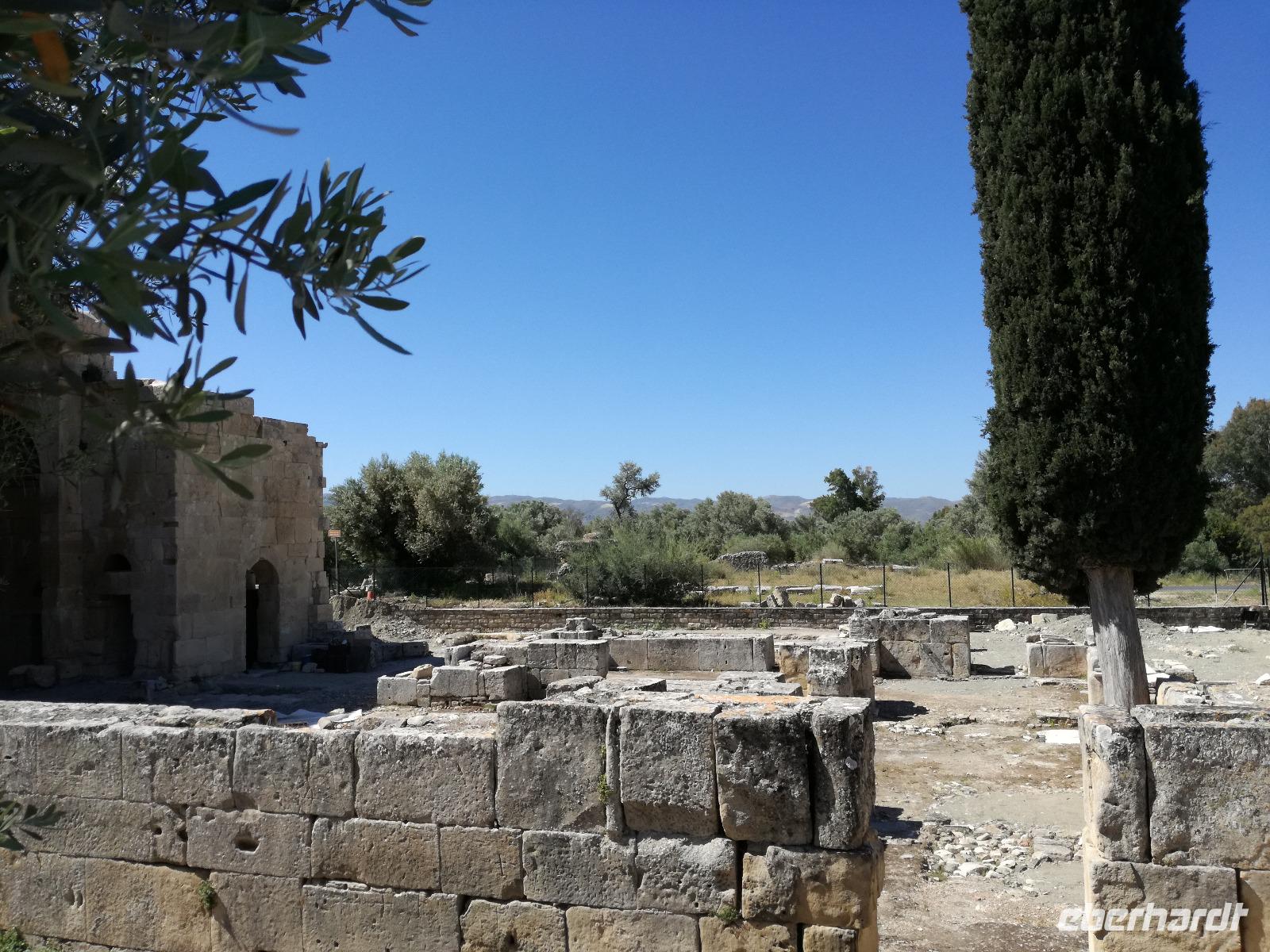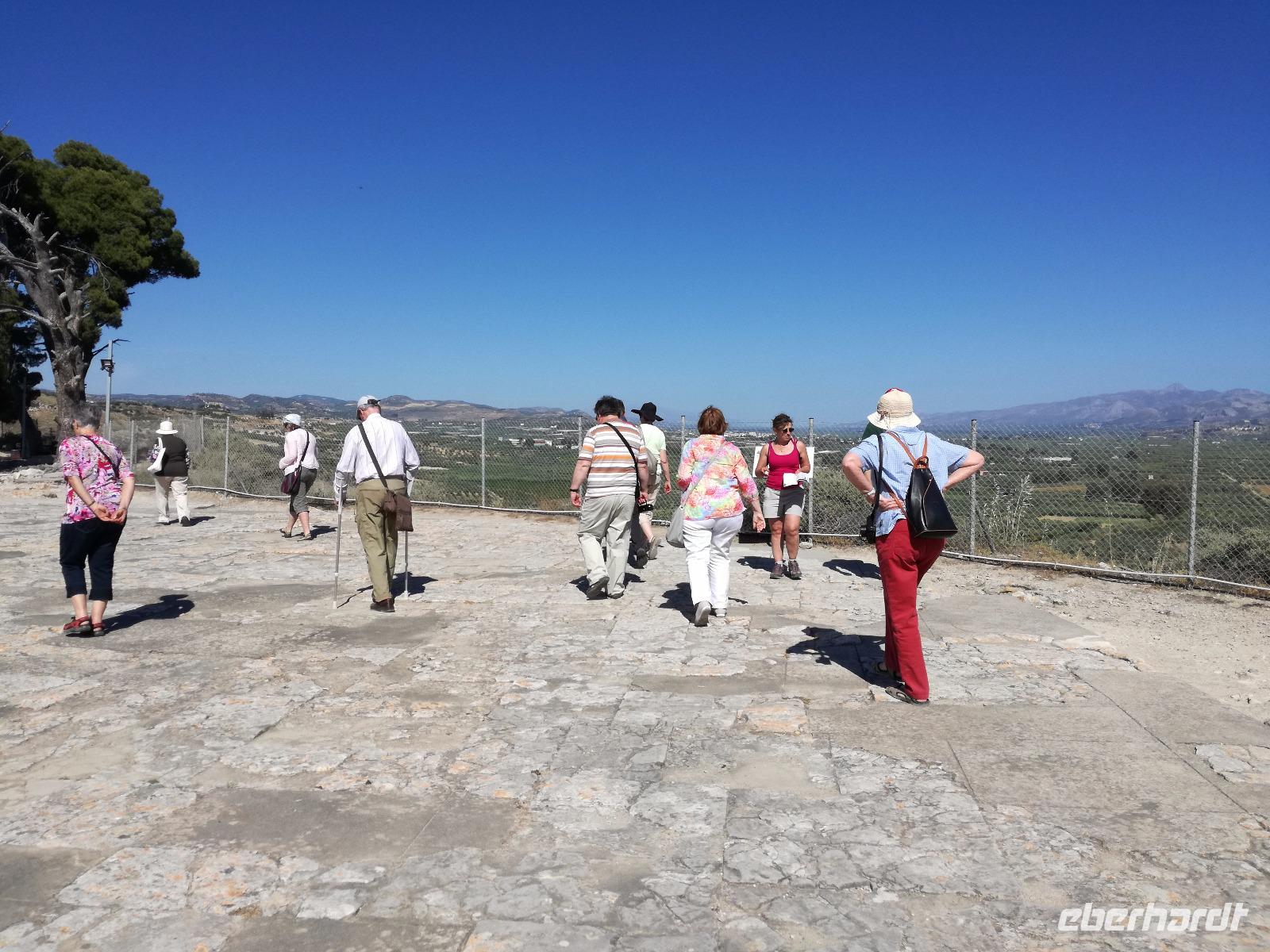 Die Erkundung der Insel ist noch lange nicht zu Ende. Wir fahren Richtung Heraklion, aber anstatt weiter Richtung Westen zu fahren, sondern in den Süden. Wir durchqueren Agia Varvara um nach Gortys zu gelangen. In der Mythologie ist dies der Ort an dem Zeus mit der entführten Europa seine Söhne zeugte. Aber auch geschichtlich hat dieser Ort einiges zu bieten. Aber zunächst kommt man an der Titus Basilika vorbei, die aus dem 6. Jhd. v. Chr. stammt. Ihren Namen hat sie von einem der Begleiter des Apostels Paulus. Titus ist heute noch Schutzheiliger der Insel. Wir gehen weiter durch die ehemalige Stadt und kommen zu den gut erhaltenen Treppen aus Marmor, die auf das Theater hindeuten, das hier einmal stand. In unmittelbarer Nähe können wir die berühmten Gesetze von Gortys stammen aus dem 500 Jhd. v. Chr. Diesee bildeten in der Vergangenheit die Grundlage für zivil-und strafrechtliche Entscheidungen wie auch Entscheidungen über Erb- und Scheidungsverfahren. Rena führt uns noch zu der Terasse der Stadt, wo eine uralte Plantane steht. Nachdem alle Bilder geschossen wurden, fahren wir weiter zum Hippie Dorf Matala. Natürlich ist dieser Ort auch Teil der griechischen Mythologie, hier soll Zeus mit der Europa aus dem Wasser gestiegen sein. Interessant sind auch die Hippiehöhle, die aber nicht in den 60er Jahren entstanden, sondern schon in der Steinzeit zum Schutz der Menschen. 1960 wurden diese dann von den Aussteigern des Lebens genutzt um zum einfachen Leben zurückzufinden. Angeblich auch von Bob Dylan und Cat Stevans. Ein wunderbarer Ort um durch die Straßen zu schlendern und am Strand zu entspannen. Nach der Mittagspause fahren wir nach Festos, auch Phaistos genannt, die zweitgrößte minoische Ausgrabungsstätte. Wegen der Ähnlichkeit im Aufbau zu Knossos wird vermutet, dass es sich hierbei auch um einen Palast handelt. Die ersten Ausgrabungen fanden im Jahre 1990 statt und heute kann man durch frühere Vorratskammern, das Theater und die Überreste der Königsgemächer schlendern. Außerdem haben wir einen atemberaubenden Blick auf die Messara Ebene. Nach diesem langen Ausflugstag freuen wir uns auf das reichhaltige Buffett in unserem Hotel.