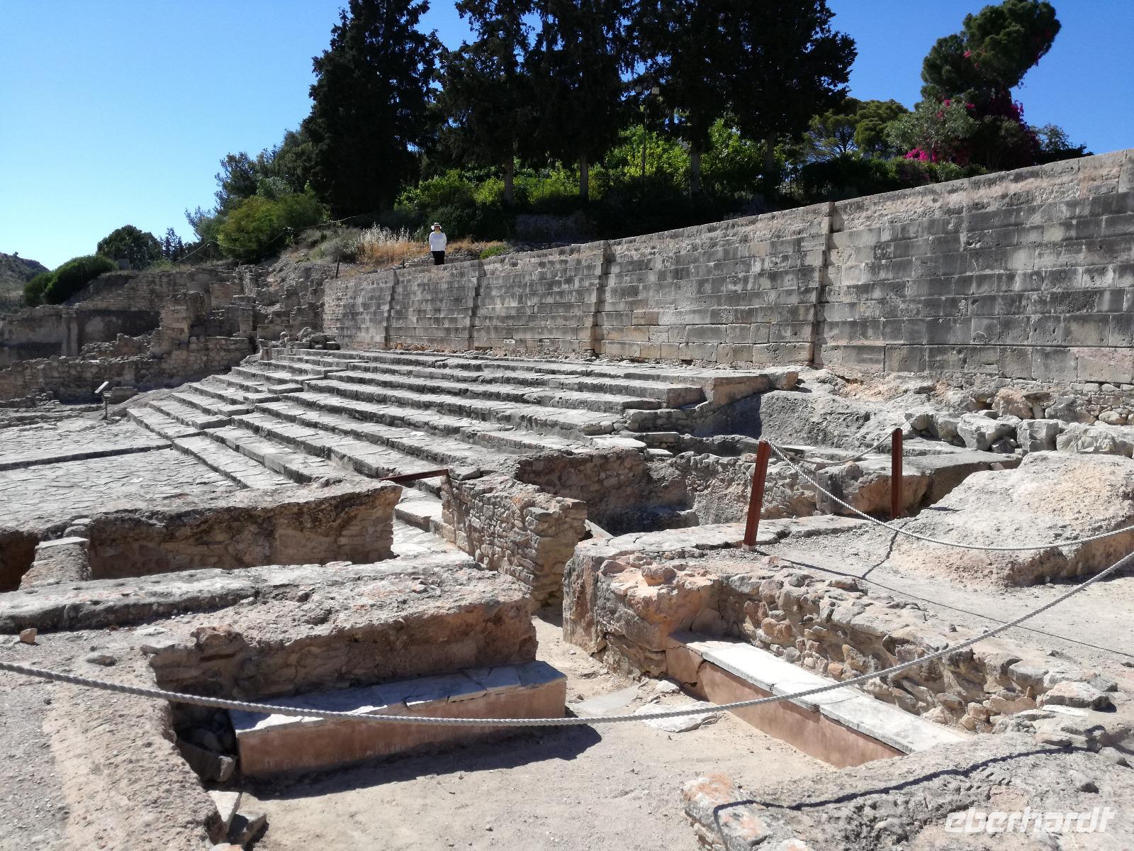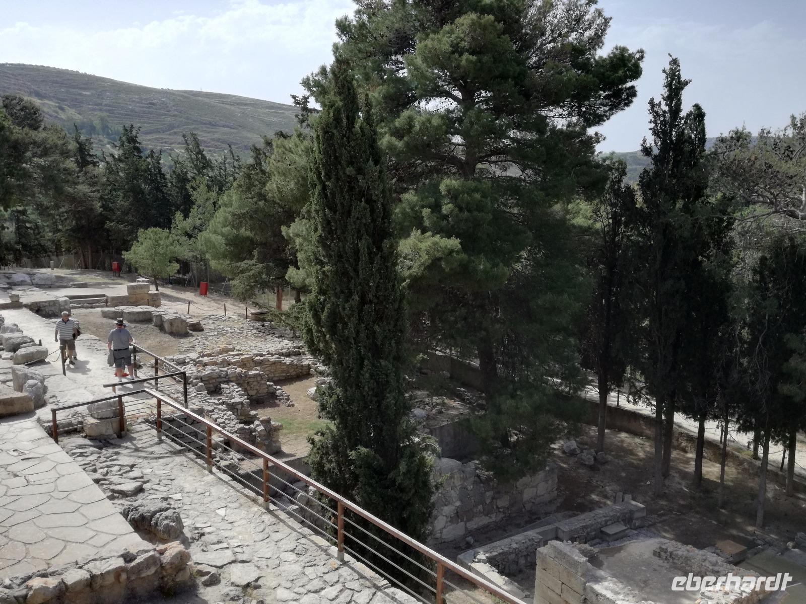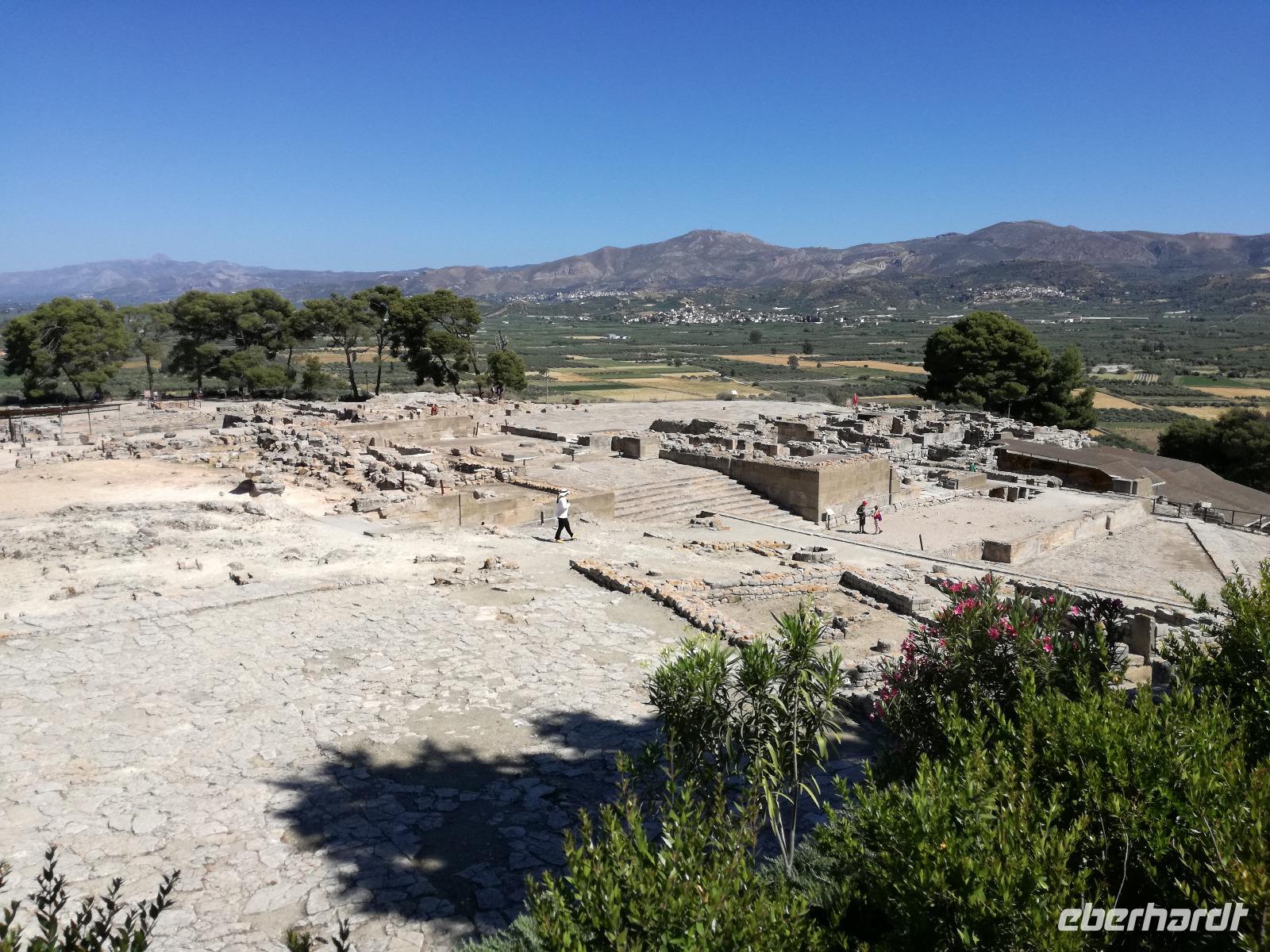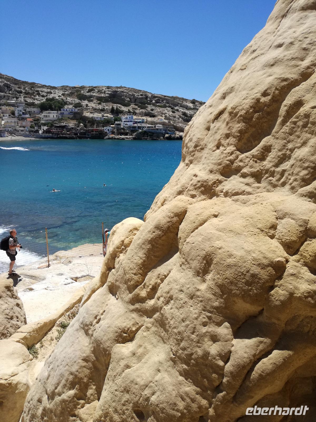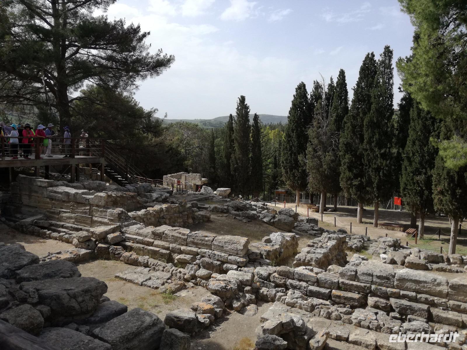 Die Erkundung der Insel ist noch lange nicht zu Ende. Wir fahren Richtung Heraklion, aber anstatt weiter Richtung Westen zu fahren, sondern in den Süden. Wir durchqueren Agia Varvara um nach Gortys zu gelangen. In der Mythologie ist dies der Ort an dem Zeus mit der entführten Europa seine Söhne zeugte. Aber auch geschichtlich hat dieser Ort einiges zu bieten. Aber zunächst kommt man an der Titus Basilika vorbei, die aus dem 6. Jhd. v. Chr. stammt. Ihren Namen hat sie von einem der Begleiter des Apostels Paulus. Titus ist heute noch Schutzheiliger der Insel. Wir gehen weiter durch die ehemalige Stadt und kommen zu den gut erhaltenen Treppen aus Marmor, die auf das Theater hindeuten, das hier einmal stand. In unmittelbarer Nähe können wir die berühmten Gesetze von Gortys stammen aus dem 500 Jhd. v. Chr. Diesee bildeten in der Vergangenheit die Grundlage für zivil-und strafrechtliche Entscheidungen wie auch Entscheidungen über Erb- und Scheidungsverfahren. Rena führt uns noch zu der Terasse der Stadt, wo eine uralte Plantane steht. Nachdem alle Bilder geschossen wurden, fahren wir weiter zum Hippie Dorf Matala. Natürlich ist dieser Ort auch Teil der griechischen Mythologie, hier soll Zeus mit der Europa aus dem Wasser gestiegen sein. Interessant sind auch die Hippiehöhle, die aber nicht in den 60er Jahren entstanden, sondern schon in der Steinzeit zum Schutz der Menschen. 1960 wurden diese dann von den Aussteigern des Lebens genutzt um zum einfachen Leben zurückzufinden. Angeblich auch von Bob Dylan und Cat Stevans. Ein wunderbarer Ort um durch die Straßen zu schlendern und am Strand zu entspannen. Nach der Mittagspause fahren wir nach Festos, auch Phaistos genannt, die zweitgrößte minoische Ausgrabungsstätte. Wegen der Ähnlichkeit im Aufbau zu Knossos wird vermutet, dass es sich hierbei auch um einen Palast handelt. Die ersten Ausgrabungen fanden im Jahre 1990 statt und heute kann man durch frühere Vorratskammern, das Theater und die Überreste der Königsgemächer schlendern. Außerdem haben wir einen atemberaubenden Blick auf die Messara Ebene. Nach diesem langen Ausflugstag freuen wir uns auf das reichhaltige Buffett in unserem Hotel.