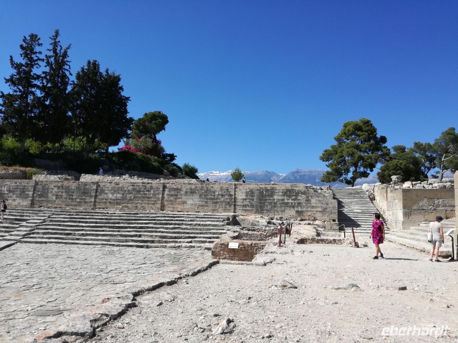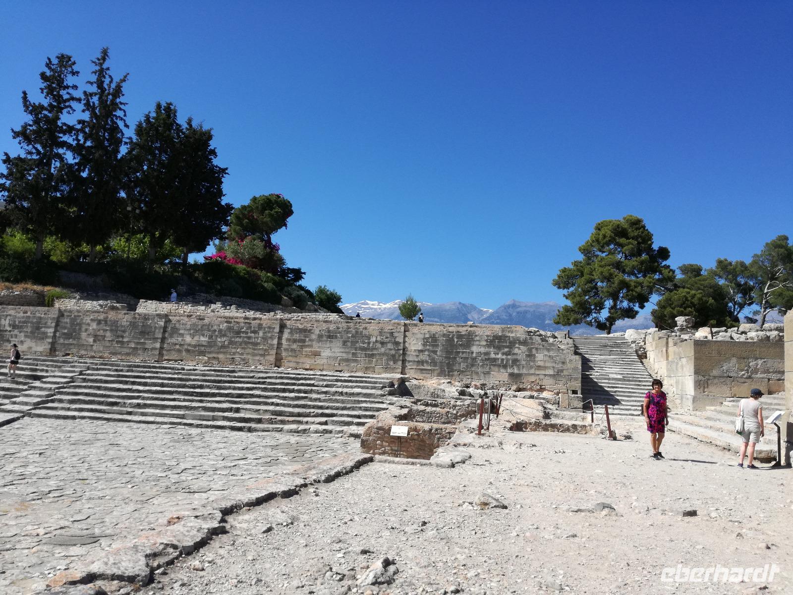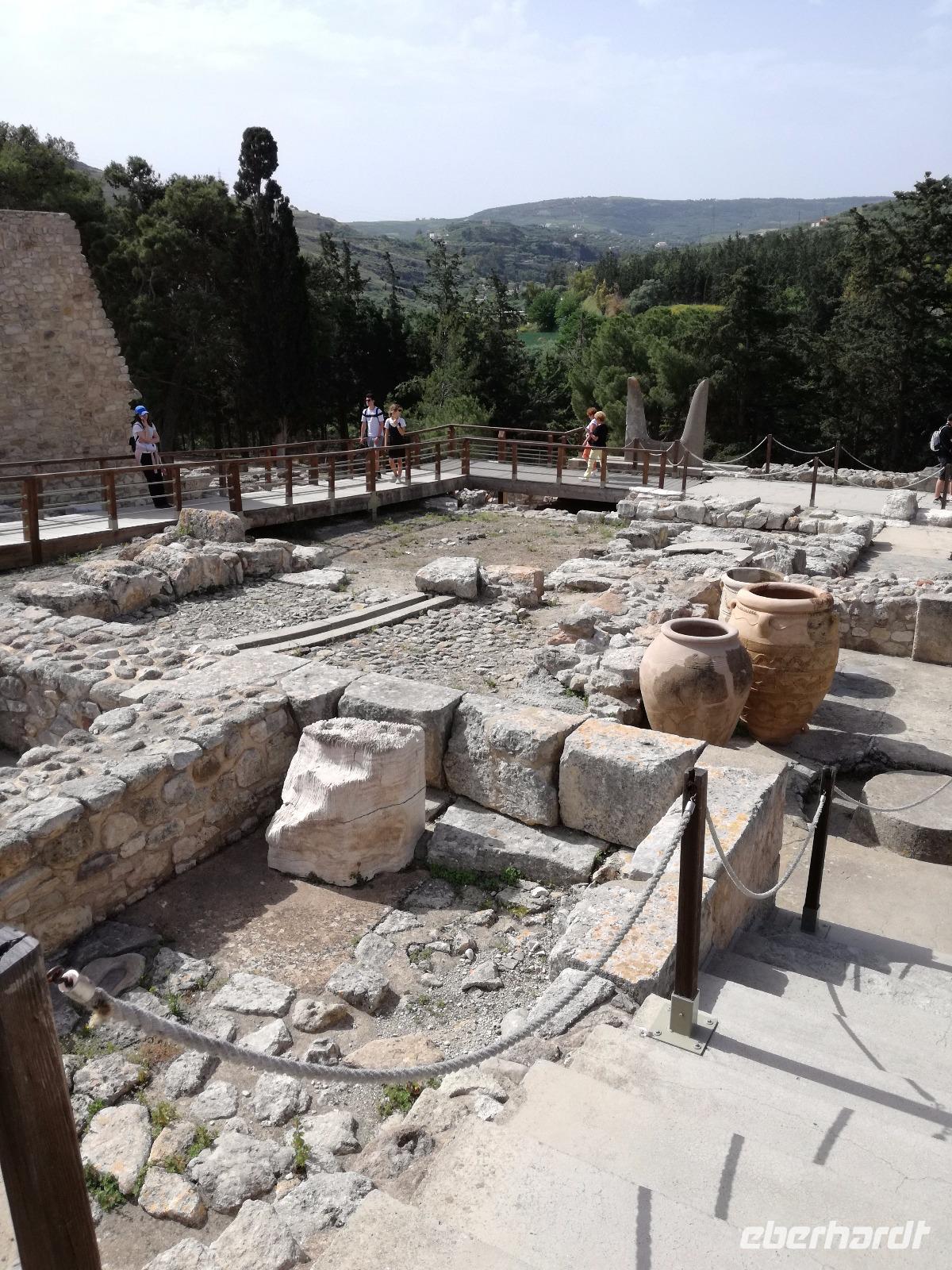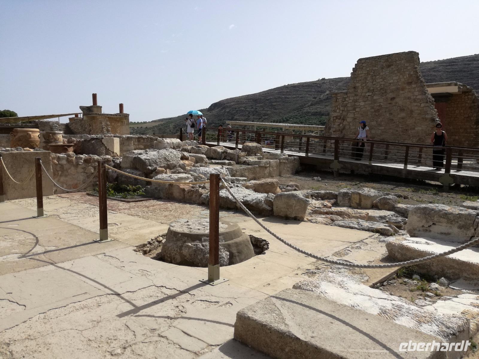 Die Erkundung der Insel ist noch lange nicht zu Ende. Wir fahren Richtung Heraklion, aber anstatt weiter Richtung Westen zu fahren, sondern in den Süden. Wir durchqueren Agia Varvara um nach Gortys zu gelangen. In der Mythologie ist dies der Ort an dem Zeus mit der entführten Europa seine Söhne zeugte. Aber auch geschichtlich hat dieser Ort einiges zu bieten. Aber zunächst kommt man an der Titus Basilika vorbei, die aus dem 6. Jhd. v. Chr. stammt. Ihren Namen hat sie von einem der Begleiter des Apostels Paulus. Titus ist heute noch Schutzheiliger der Insel. Wir gehen weiter durch die ehemalige Stadt und kommen zu den gut erhaltenen Treppen aus Marmor, die auf das Theater hindeuten, das hier einmal stand. In unmittelbarer Nähe können wir die berühmten Gesetze von Gortys stammen aus dem 500 Jhd. v. Chr. Diesee bildeten in der Vergangenheit die Grundlage für zivil-und strafrechtliche Entscheidungen wie auch Entscheidungen über Erb- und Scheidungsverfahren. Rena führt uns noch zu der Terasse der Stadt, wo eine uralte Plantane steht. Nachdem alle Bilder geschossen wurden, fahren wir weiter zum Hippie Dorf Matala. Natürlich ist dieser Ort auch Teil der griechischen Mythologie, hier soll Zeus mit der Europa aus dem Wasser gestiegen sein. Interessant sind auch die Hippiehöhle, die aber nicht in den 60er Jahren entstanden, sondern schon in der Steinzeit zum Schutz der Menschen. 1960 wurden diese dann von den Aussteigern des Lebens genutzt um zum einfachen Leben zurückzufinden. Angeblich auch von Bob Dylan und Cat Stevans. Ein wunderbarer Ort um durch die Straßen zu schlendern und am Strand zu entspannen. Nach der Mittagspause fahren wir nach Festos, auch Phaistos genannt, die zweitgrößte minoische Ausgrabungsstätte. Wegen der Ähnlichkeit im Aufbau zu Knossos wird vermutet, dass es sich hierbei auch um einen Palast handelt. Die ersten Ausgrabungen fanden im Jahre 1990 statt und heute kann man durch frühere Vorratskammern, das Theater und die Überreste der Königsgemächer schlendern. Außerdem haben wir einen atemberaubenden Blick auf die Messara Ebene. Nach diesem langen Ausflugstag freuen wir uns auf das reichhaltige Buffett in unserem Hotel.