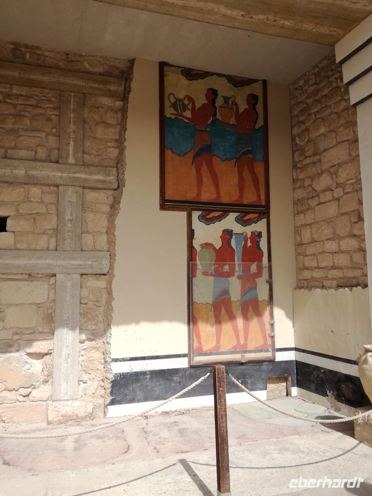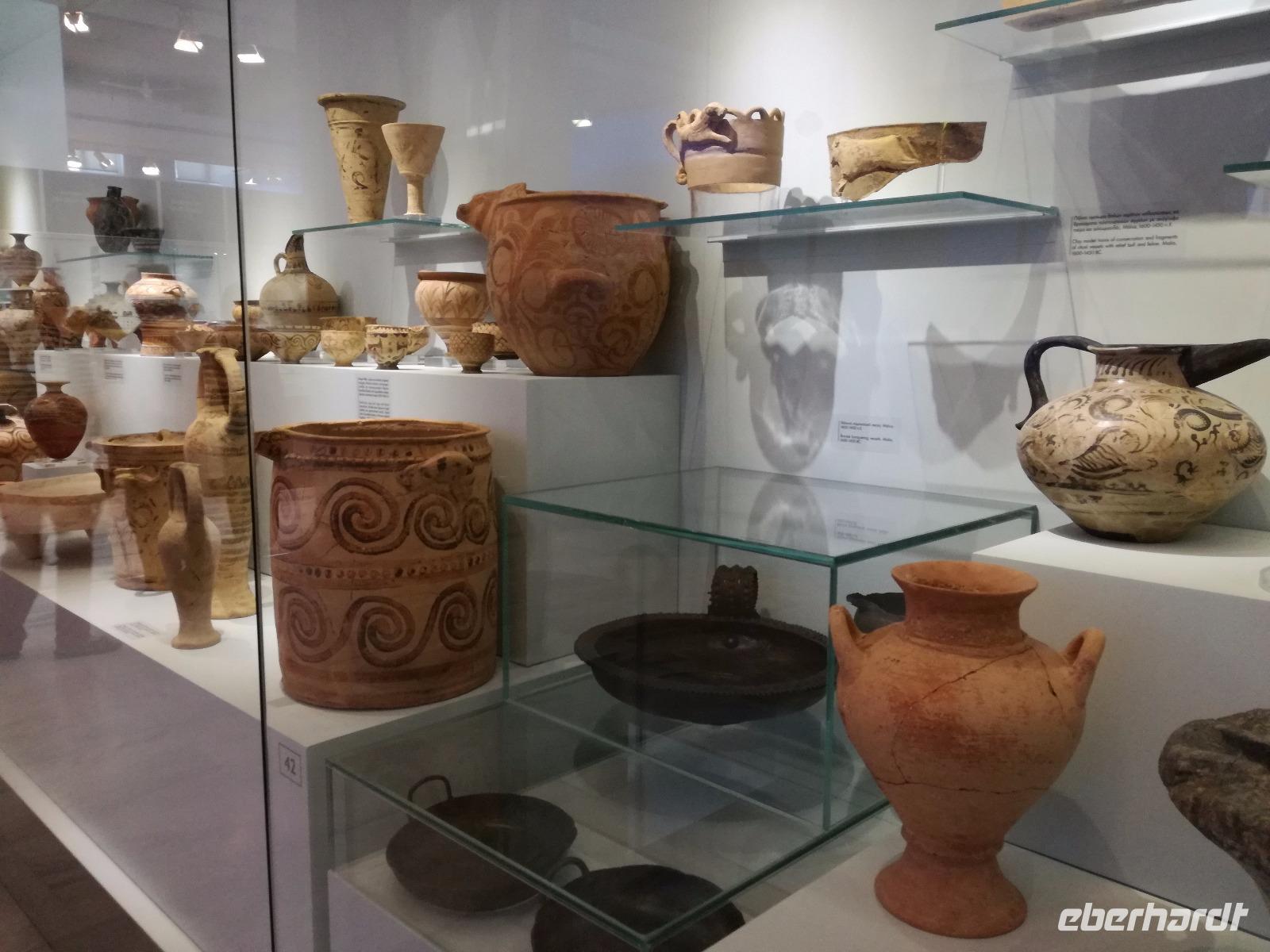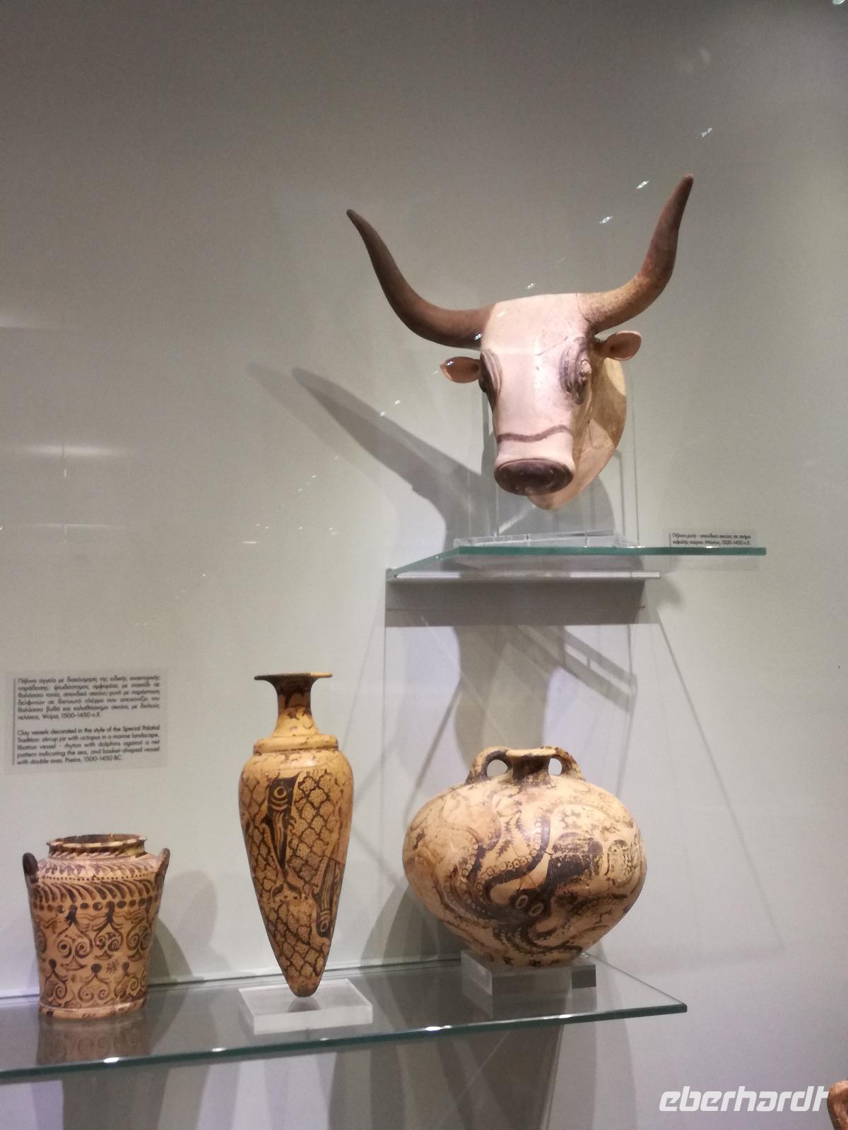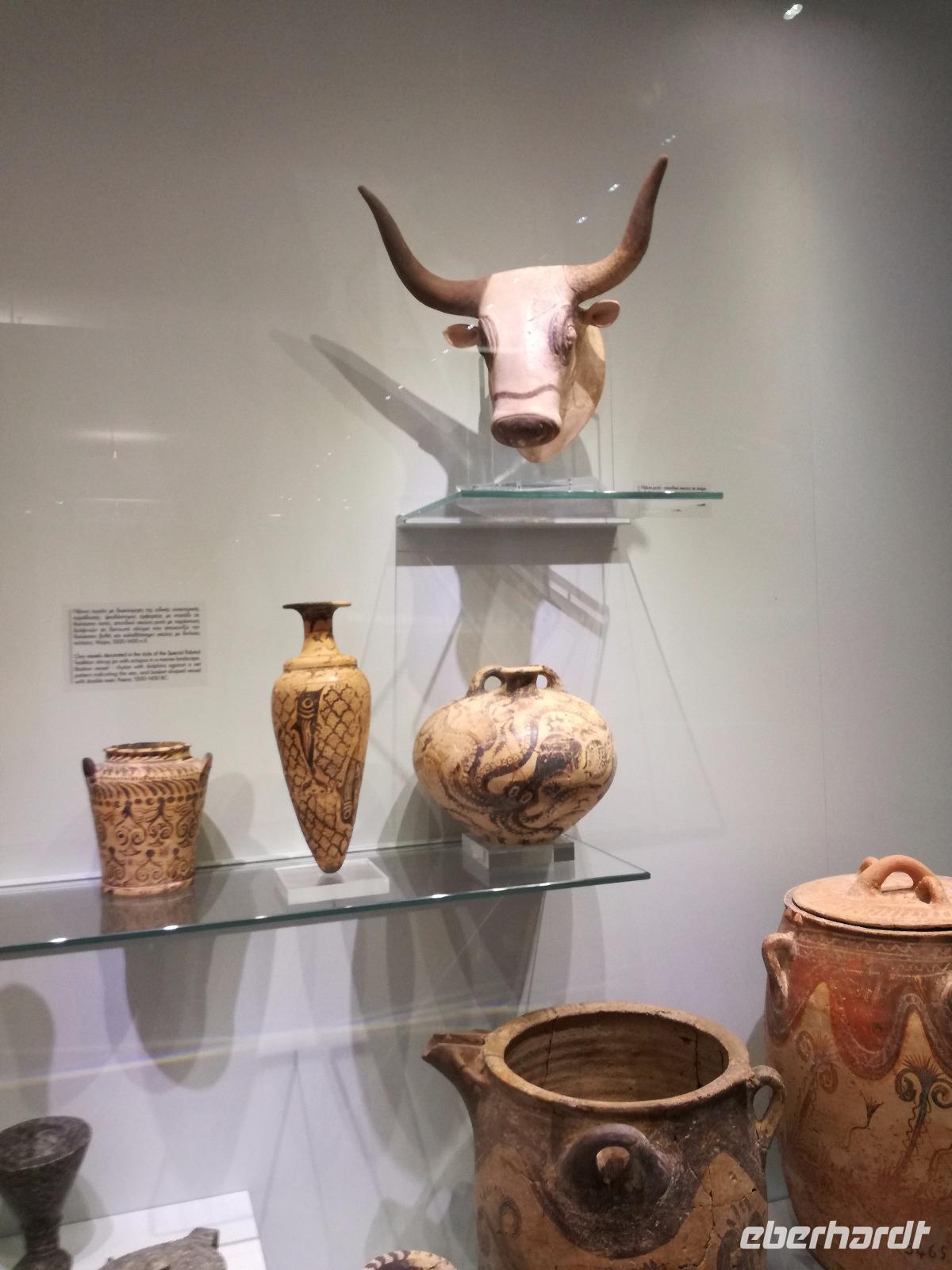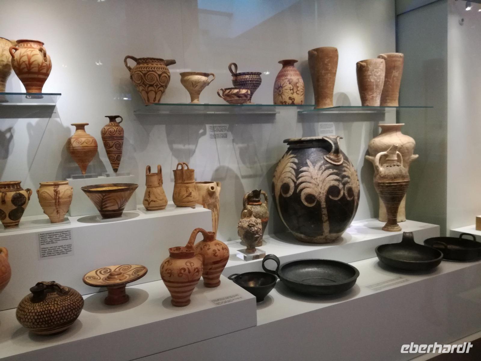Wir starten gut gestärkt in den ersten Ausflugstag, da wir uns zuvor schon an dem ausladenden Frühstücksbuffett bedienen konnten. Unser erstes Ziel der Reise muss ein jedermann, der die Insel Kreta besichtigt, gesehen haben. Wir fahren in westlicher Richtung zu der wichtigsten Ausgrabungsstätte, dem Palast von Knossos. Der Palast selbst wurde das erste Mal ca. 2000 v.Chr. errichtet. Er wurde einige Male durch Kriege und Naturkatastrophen in Mitleidenschaft gezogen, aber immer wieder aufgebaut, dadurch dass er als Machtzentrum Kretas galt. Man vermutet, dass die ganze Insel von diesem Palast regiert wurde. Diese Periode dauerte bis ca. 1400 v.Chr. an. Dann wurde der Palast bei einem Brand zerstört und verlor an Bedeutung. Der Palast umfasste eine Fläche von ca. 21000 qm² mit insgesamt ca. 1300 Räumen und einer Höhe von 5 Stockwerken. Entdeckt wurden die Überreste der Anlage von Sir Arthur Evans und teilweise wieder aufgebaut. Man kann heute nicht nur erahnen wie der Palast ausgesehen hat, sondern hat durch die Rekonstruktionen ein anschauliches Bild der alten Zeit. Die verwinkelte Bauweise ist wahrscheinlich auch Grundlage für den Mythos des Minotaurus. Rena führt uns durch die ehemaligen Wohn-, Kultur-, Repräsentations- und Lagerräume und wir gewinnen einen Eindruck über die Ausmaße der minoischen Kultur. Nach der Führung geht es für uns mit dem Bus weiter zu einer Töpferei. Dort können wir die filigranen Arbeiten bestaunen und bekommen eine Vorführung, wie diese hergestellt werden. Mit einer Leichtigkeit formt der Mann die Vasen und Töpfen, dass das aber nicht so einfach ist, merke ich schnell, als ich es selbst einmal versuche. In dem kleinen Shop bleibt uns noch Zeit die bemalten Kunstwerke zu bewundern und der ein oder andere kauft auch ein kleines Souvenir. Anschließend fuhren wir für unsere Mittagspause in die Hauptstadt nach Heraklion. Wir machen einen kleinen Stadtrundgang durch die lebhafte Stadt vorbei am Löwenplatz und am Morisini Brunnen bis hin zur prachtvollen St. Minas Kathedrale. Danach haben wir die Möglichkeit die Stadt noch einmal individuell zu erkunden. Einige gehen zum Hafen, andere finden sich in einer der zahlreichen Tavernen zum Mittagessen ein. Wir treffen uns wieder am Löwenplatz und gehen gemeinsam zum archäologischen Museum. Das Museum beherbergt viele Ausstellungsstücke der minoischen Zeit unter anderem auch aus dem Palast von Knossos. Nach diesem informationsreichen Ausflug begeben wir uns auf den Weg zurück zum Hotel und genießen ein gemeinsames Abendessen.