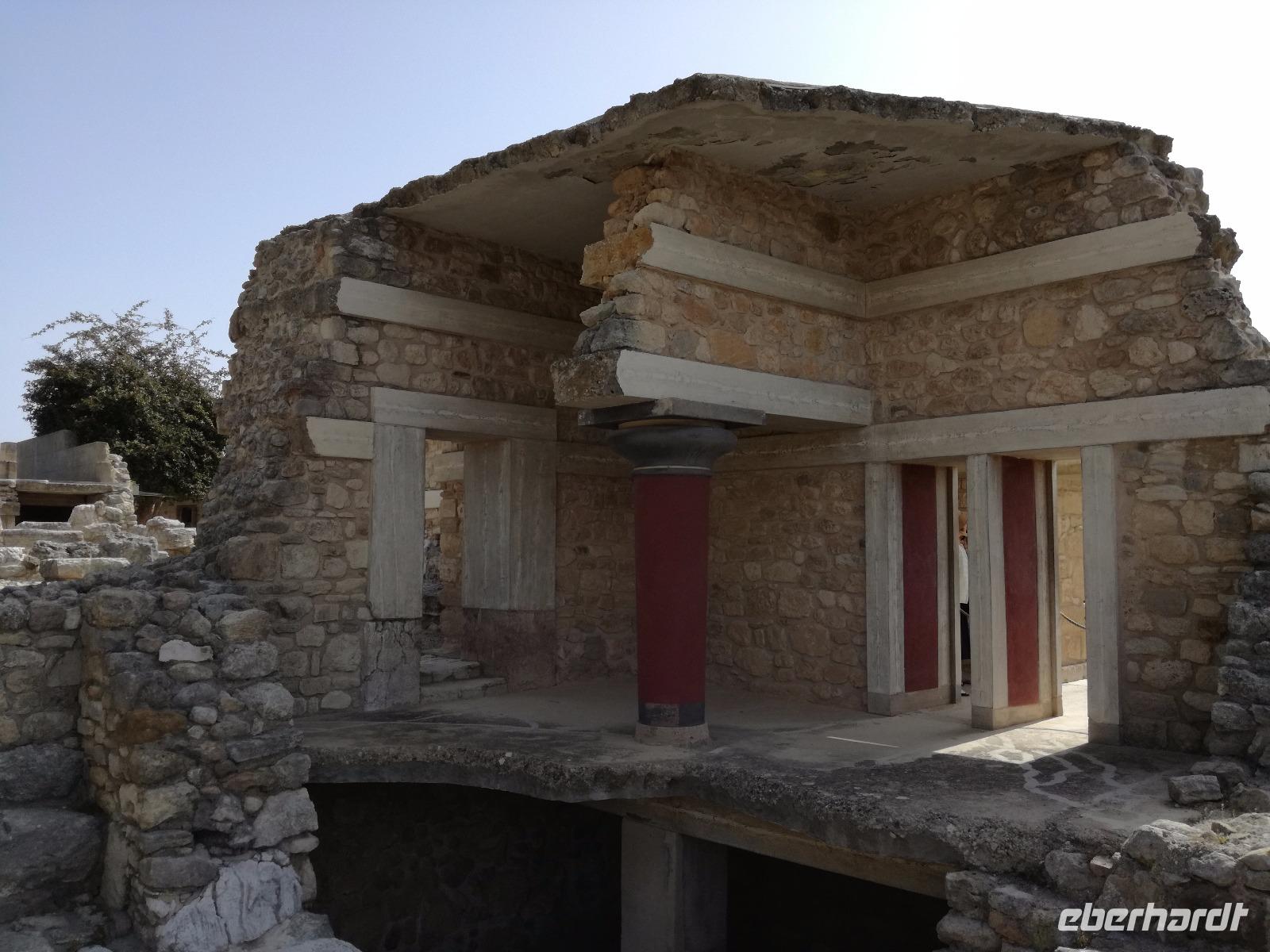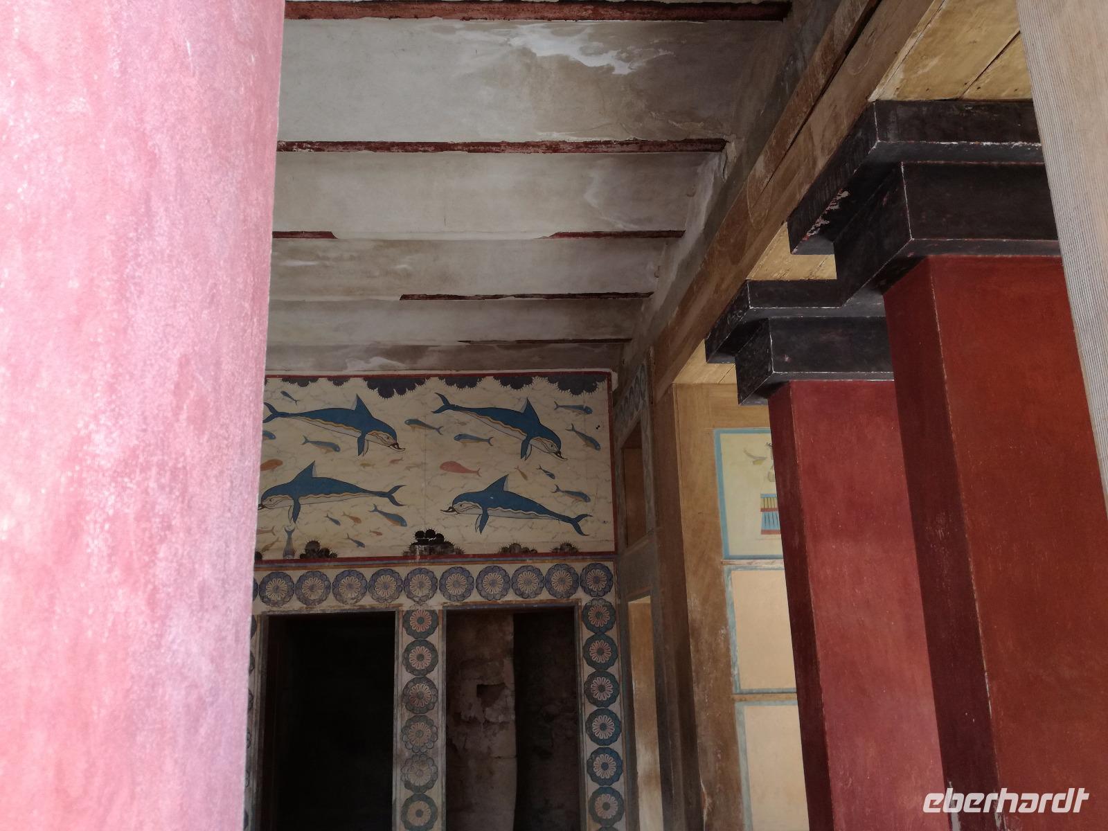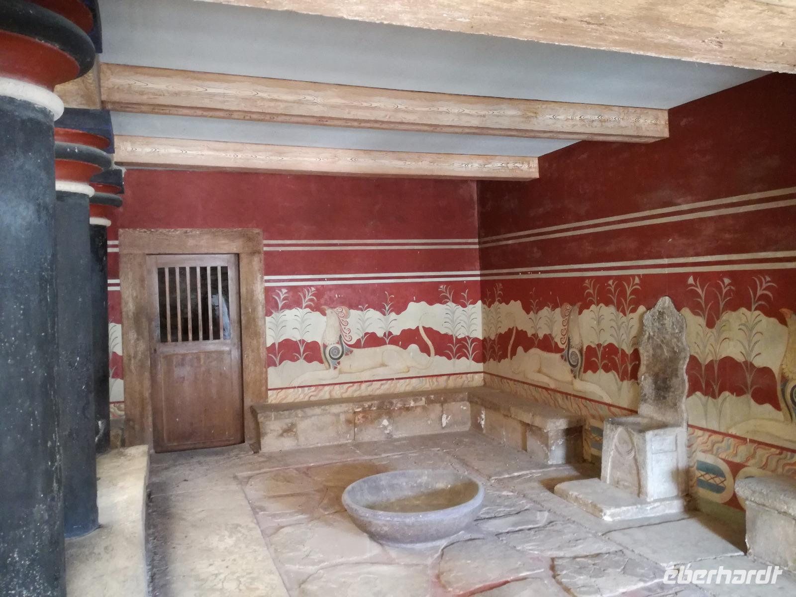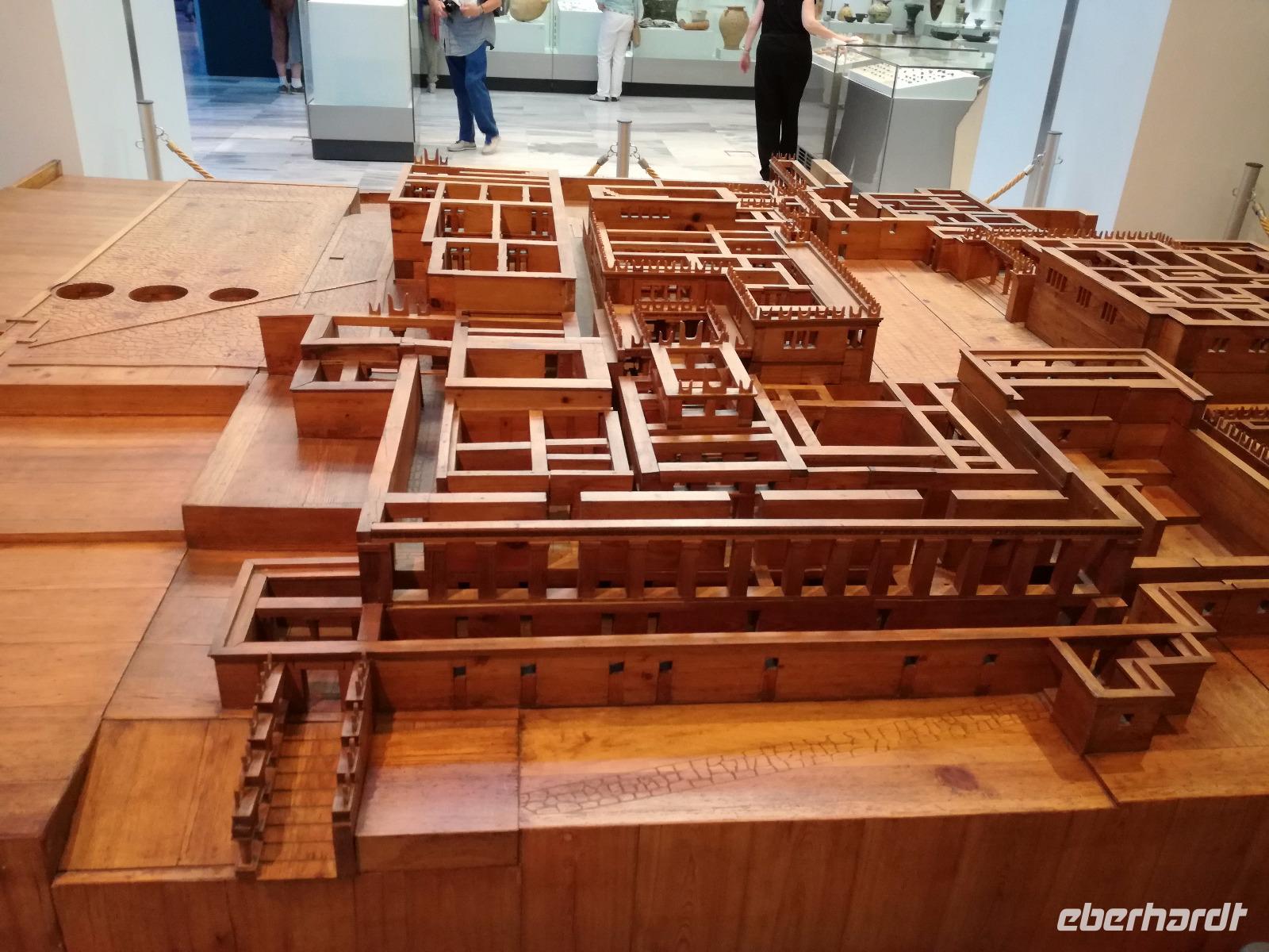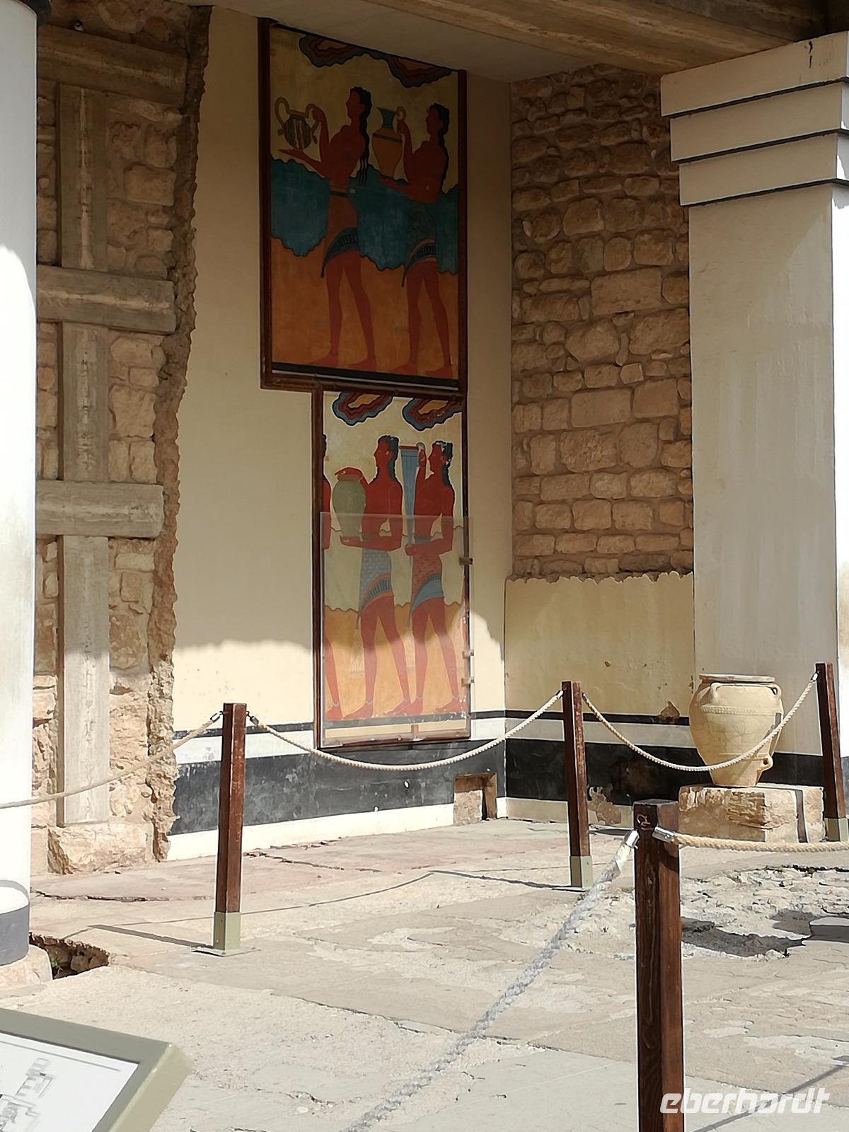 Wir starten gut gestärkt in den ersten Ausflugstag, da wir uns zuvor schon an dem ausladenden Frühstücksbuffett bedienen konnten. Unser erstes Ziel der Reise muss ein jedermann, der die Insel Kreta besichtigt, gesehen haben. Wir fahren in westlicher Richtung zu der wichtigsten Ausgrabungsstätte, dem Palast von Knossos. Der Palast selbst wurde das erste Mal ca. 2000 v.Chr. errichtet. Er wurde einige Male durch Kriege und Naturkatastrophen in Mitleidenschaft gezogen, aber immer wieder aufgebaut, dadurch dass er als Machtzentrum Kretas galt. Man vermutet, dass die ganze Insel von diesem Palast regiert wurde. Diese Periode dauerte bis ca. 1400 v.Chr. an. Dann wurde der Palast bei einem Brand zerstört und verlor an Bedeutung. Der Palast umfasste eine Fläche von ca. 21000 qm² mit insgesamt ca. 1300 Räumen und einer Höhe von 5 Stockwerken. Entdeckt wurden die Überreste der Anlage von Sir Arthur Evans und teilweise wieder aufgebaut. Man kann heute nicht nur erahnen wie der Palast ausgesehen hat, sondern hat durch die Rekonstruktionen ein anschauliches Bild der alten Zeit. Die verwinkelte Bauweise ist wahrscheinlich auch Grundlage für den Mythos des Minotaurus. Rena führt uns durch die ehemaligen Wohn-, Kultur-, Repräsentations- und Lagerräume und wir gewinnen einen Eindruck über die Ausmaße der minoischen Kultur. Nach der Führung geht es für uns mit dem Bus weiter zu einer Töpferei. Dort können wir die filigranen Arbeiten bestaunen und bekommen eine Vorführung, wie diese hergestellt werden. Mit einer Leichtigkeit formt der Mann die Vasen und Töpfen, dass das aber nicht so einfach ist, merke ich schnell, als ich es selbst einmal versuche. In dem kleinen Shop bleibt uns noch Zeit die bemalten Kunstwerke zu bewundern und der ein oder andere kauft auch ein kleines Souvenir. Anschließend fuhren wir für unsere Mittagspause in die Hauptstadt nach Heraklion. Wir machen einen kleinen Stadtrundgang durch die lebhafte Stadt vorbei am Löwenplatz und am Morisini Brunnen bis hin zur prachtvollen St. Minas Kathedrale. Danach haben wir die Möglichkeit die Stadt noch einmal individuell zu erkunden. Einige gehen zum Hafen, andere finden sich in einer der zahlreichen Tavernen zum Mittagessen ein. Wir treffen uns wieder am Löwenplatz und gehen gemeinsam zum archäologischen Museum. Das Museum beherbergt viele Ausstellungsstücke der minoischen Zeit unter anderem auch aus dem Palast von Knossos. Nach diesem informationsreichen Ausflug begeben wir uns auf den Weg zurück zum Hotel und genießen ein gemeinsames Abendessen.