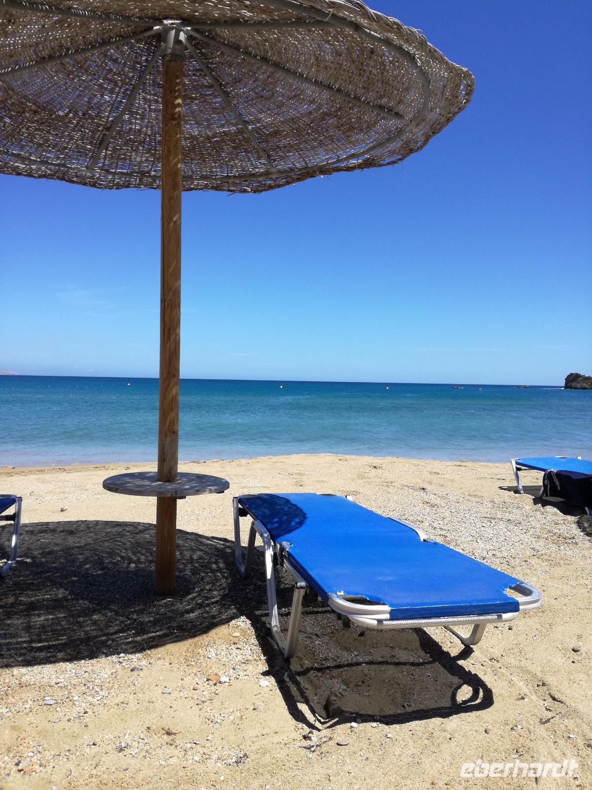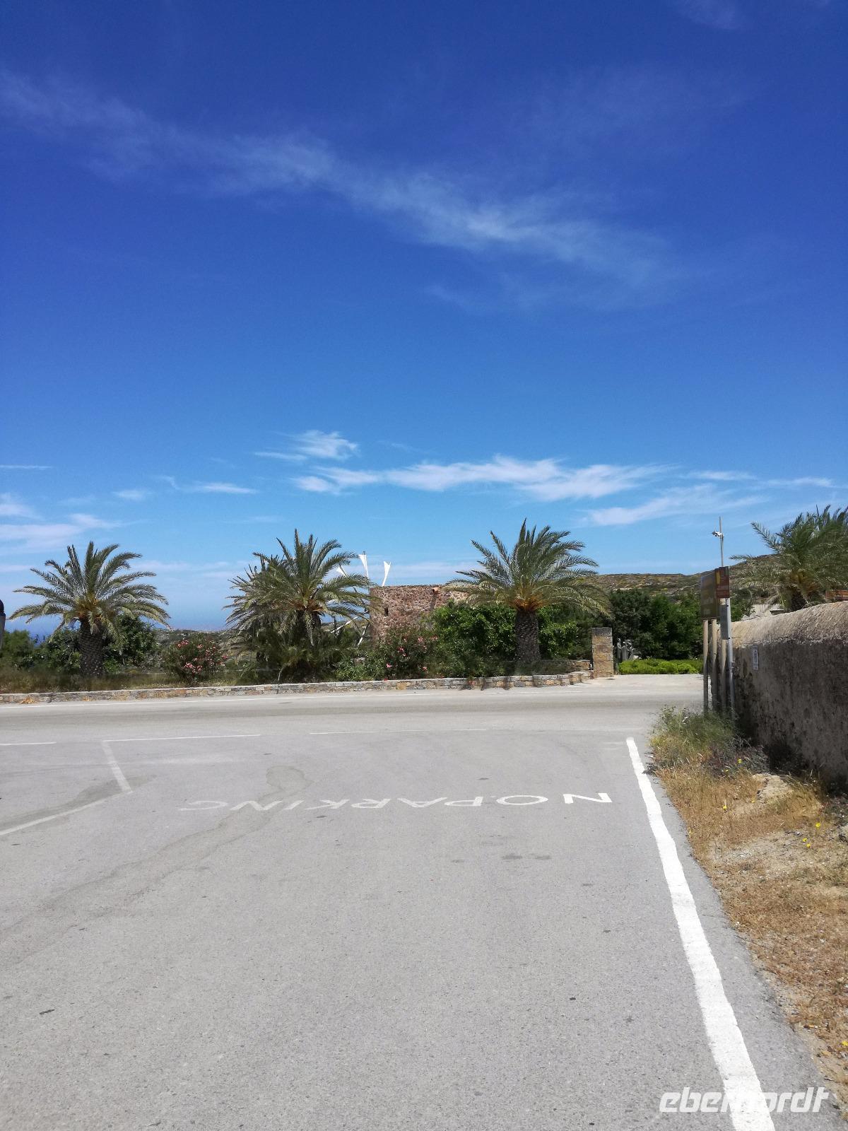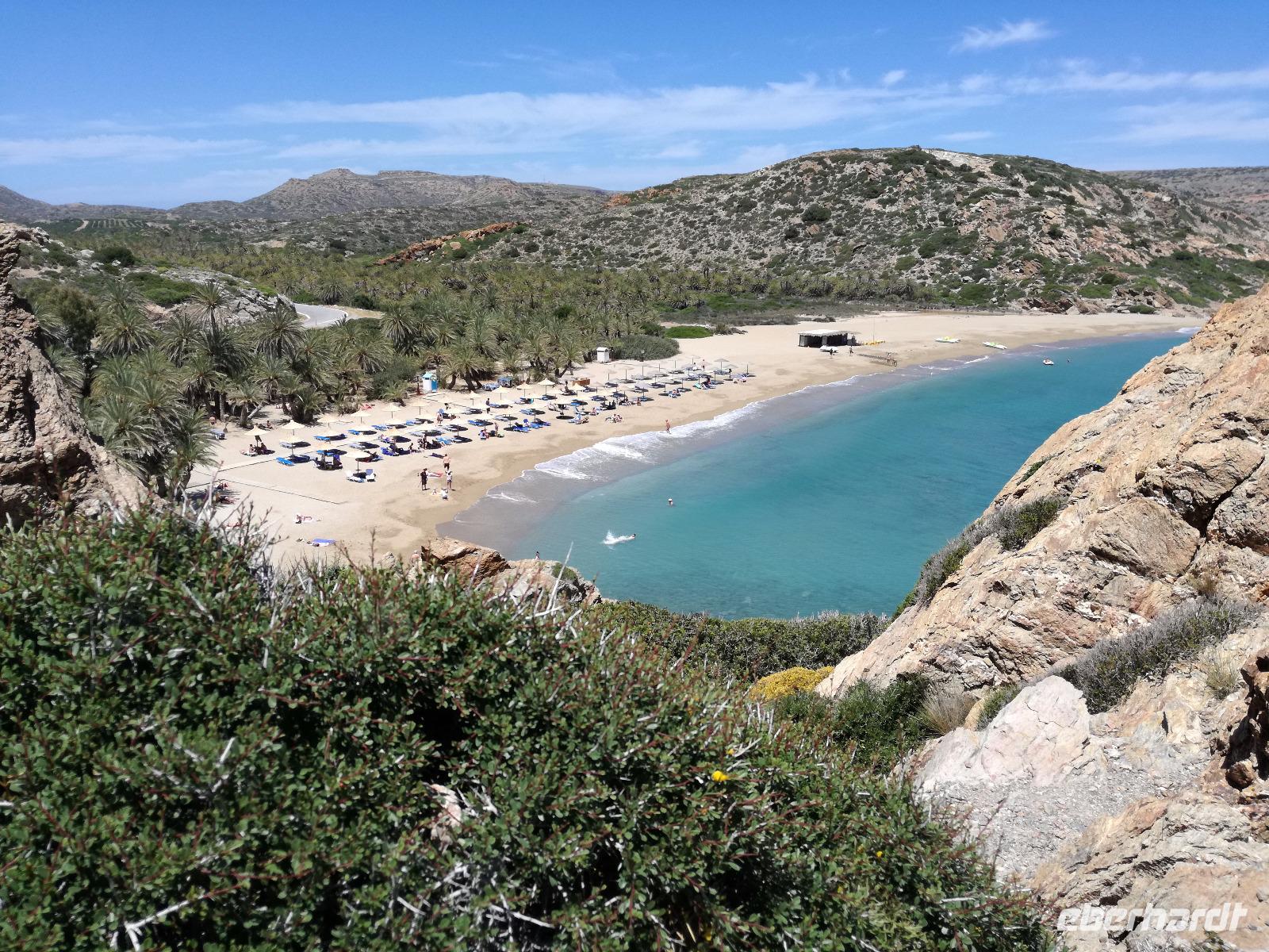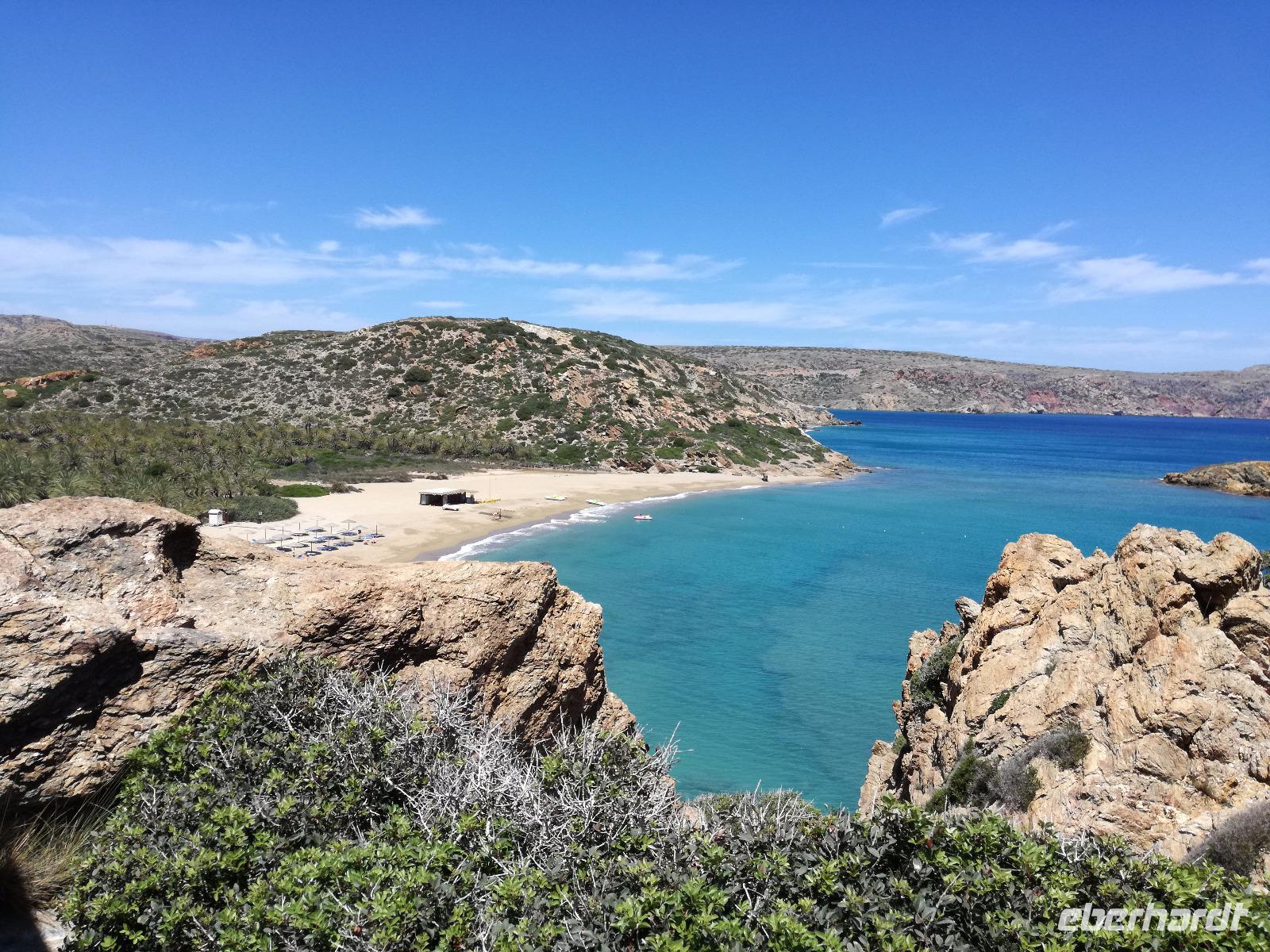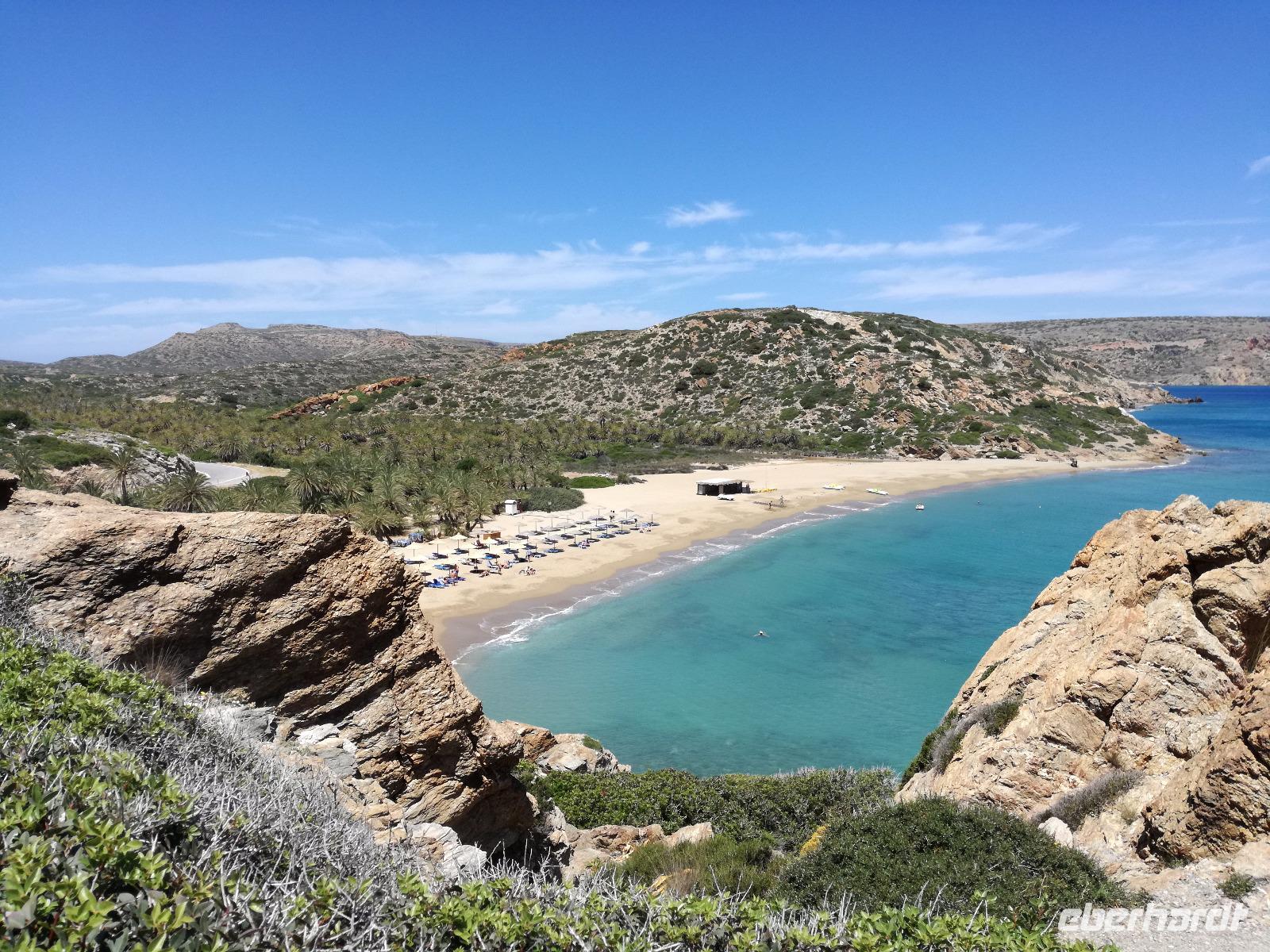 „Kalimera" tönt es bereits vom Ende der Treppe der Hotels als wir hinunter gehen. Das ist griechisch und bedeutet so viel wie „Guten Morgen". Wir fahren entlang der Küste in Richtung Osten. Zahlreiche Olivenbäume säumen den Weg. An der früheren minoischen Stadt Gournia, die an der schmalsten Stelle Ostkretas liegt halten wir um ein paar Bilder zu schießen. Im Gegensatz zu den anderen Ausgrabungsstätten der Insel Knossos und Festos, ist diese vollständig freigelegt. Da aber hier keine Restaurationen stattfanden braucht man viel Fantasie um sich die Stadt vorzustellen, die hier einmal war. Weiter ging unsere kurvenreiche Fahrt zum Kloster Toplou. Von Sitia kommend wirkt das Kloster eher wie eine Festung. Auch das stillgelegte Windrad, das vor dem Kloster steht, passt in das Bild. Wie viele Mönche hier noch wohnen wird nicht verraten. Doch es ist nicht verwunderlich, dass das Kloster wie eine Festung wirkt, da dieses sich in der Vergangenheit gegen Überfälle und Plünderungen wehren musste. Im Inneren kann man ein Kieselsteinmosaik bewundern und auch die Klosterkirche ist einen Besuch wert. Das Prachtstück der Kirche ist ein Bild aus dem Jahr 1770, das viele verschiedene biblische Themen darstellt, die fließend ineinander übergehen. Es bleibt noch Zeit für ein paar Bilder bevor wir uns zum einzigen Palmenstrand Europas aufmachen. Hier kommt Urlaubsstimmung auf, bei strahlend blauem Himmel haben meine Gäste die Möglichkeit den Sprung ins kühle Nass zu wagen oder ein Mittagessen in der Taverne einzunehmen. Gegen späten Nachmittag machen wir uns auch schon wieder auf den Weg zurück zum Hotel. Doch nicht ohne an dem Banenstrand an der Straße zu halten um uns Bananen zu kaufen, die laut Rena „so viel aromatischer als deutsche Bananen" sind. Mit vielen neuen Eindrücken machen wir uns auf den Weg zurück zum Hotel.