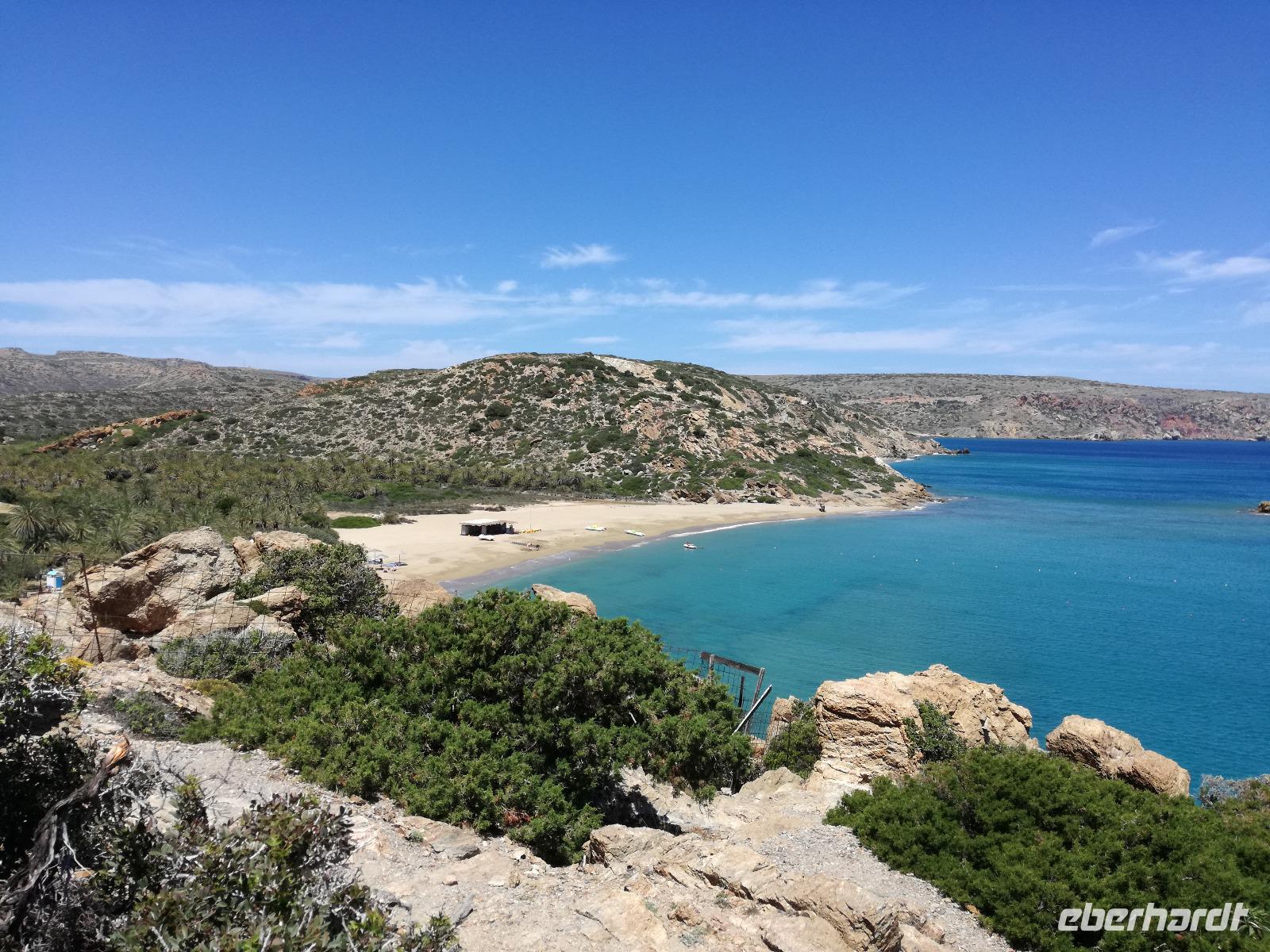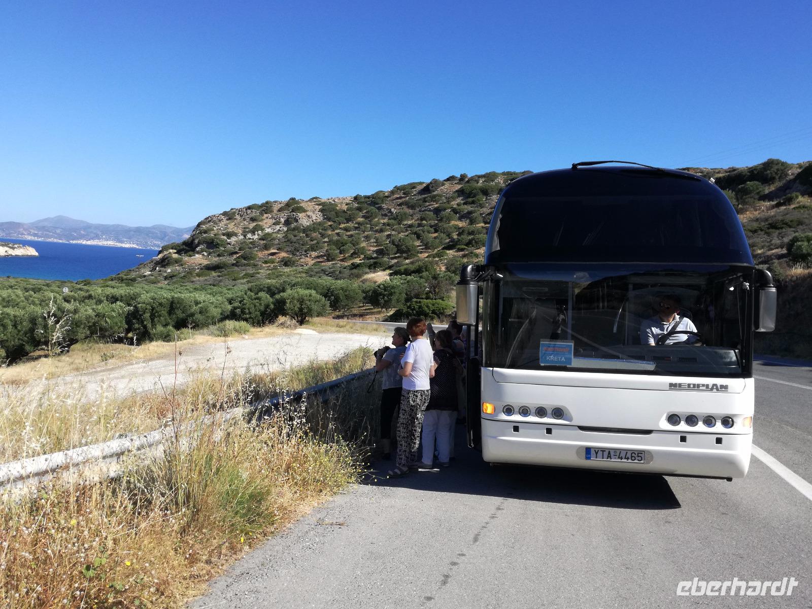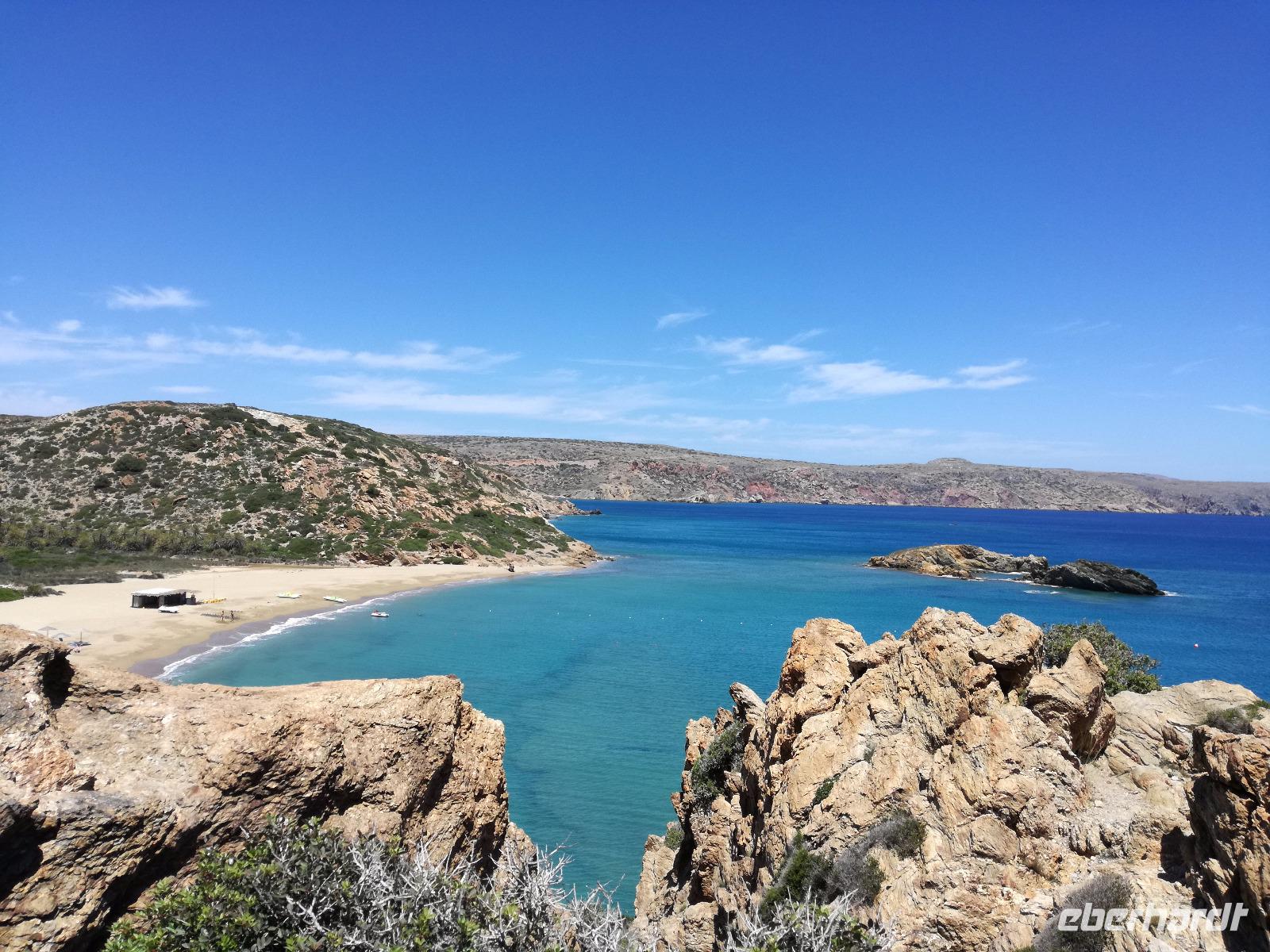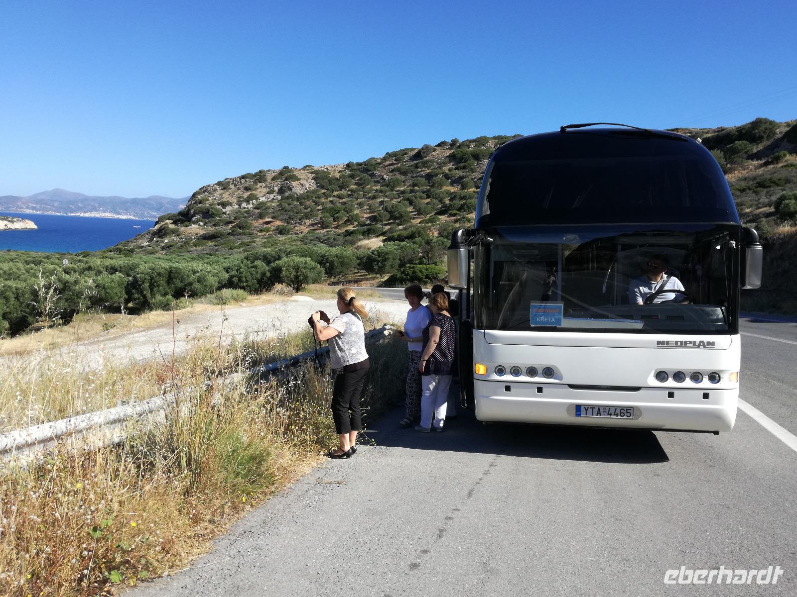 „Kalimera" tönt es bereits vom Ende der Treppe der Hotels als wir hinunter gehen. Das ist griechisch und bedeutet so viel wie „Guten Morgen". Wir fahren entlang der Küste in Richtung Osten. Zahlreiche Olivenbäume säumen den Weg. An der früheren minoischen Stadt Gournia, die an der schmalsten Stelle Ostkretas liegt halten wir um ein paar Bilder zu schießen. Im Gegensatz zu den anderen Ausgrabungsstätten der Insel Knossos und Festos, ist diese vollständig freigelegt. Da aber hier keine Restaurationen stattfanden braucht man viel Fantasie um sich die Stadt vorzustellen, die hier einmal war. Weiter ging unsere kurvenreiche Fahrt zum Kloster Toplou. Von Sitia kommend wirkt das Kloster eher wie eine Festung. Auch das stillgelegte Windrad, das vor dem Kloster steht, passt in das Bild. Wie viele Mönche hier noch wohnen wird nicht verraten. Doch es ist nicht verwunderlich, dass das Kloster wie eine Festung wirkt, da dieses sich in der Vergangenheit gegen Überfälle und Plünderungen wehren musste. Im Inneren kann man ein Kieselsteinmosaik bewundern und auch die Klosterkirche ist einen Besuch wert. Das Prachtstück der Kirche ist ein Bild aus dem Jahr 1770, das viele verschiedene biblische Themen darstellt, die fließend ineinander übergehen. Es bleibt noch Zeit für ein paar Bilder bevor wir uns zum einzigen Palmenstrand Europas aufmachen. Hier kommt Urlaubsstimmung auf, bei strahlend blauem Himmel haben meine Gäste die Möglichkeit den Sprung ins kühle Nass zu wagen oder ein Mittagessen in der Taverne einzunehmen. Gegen späten Nachmittag machen wir uns auch schon wieder auf den Weg zurück zum Hotel. Doch nicht ohne an dem Banenstrand an der Straße zu halten um uns Bananen zu kaufen, die laut Rena „so viel aromatischer als deutsche Bananen" sind. Mit vielen neuen Eindrücken machen wir uns auf den Weg zurück zum Hotel.