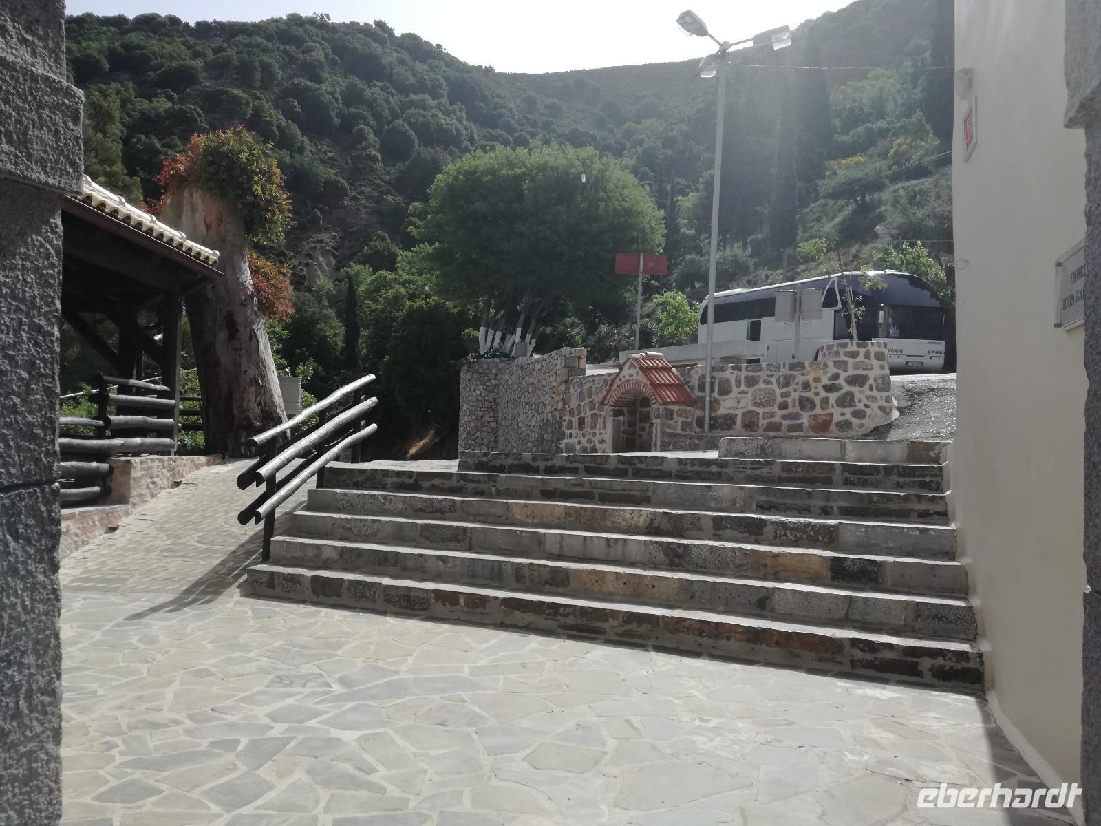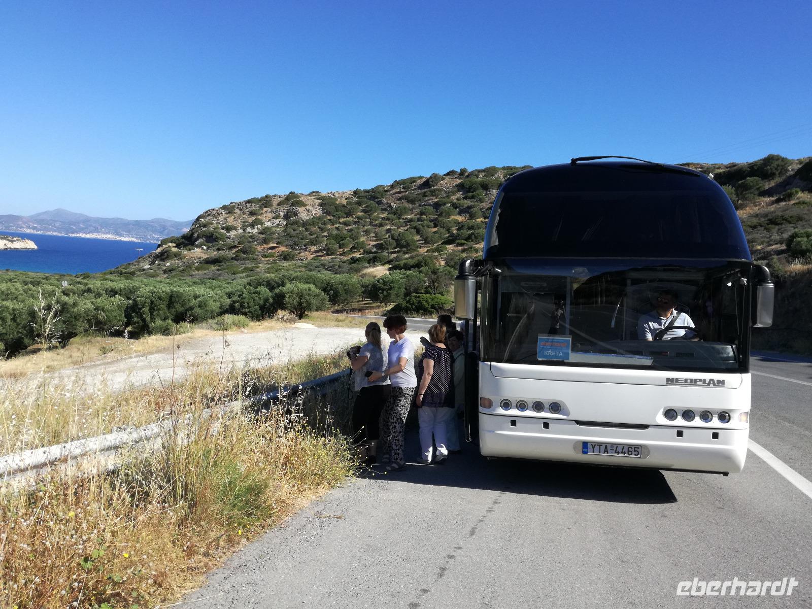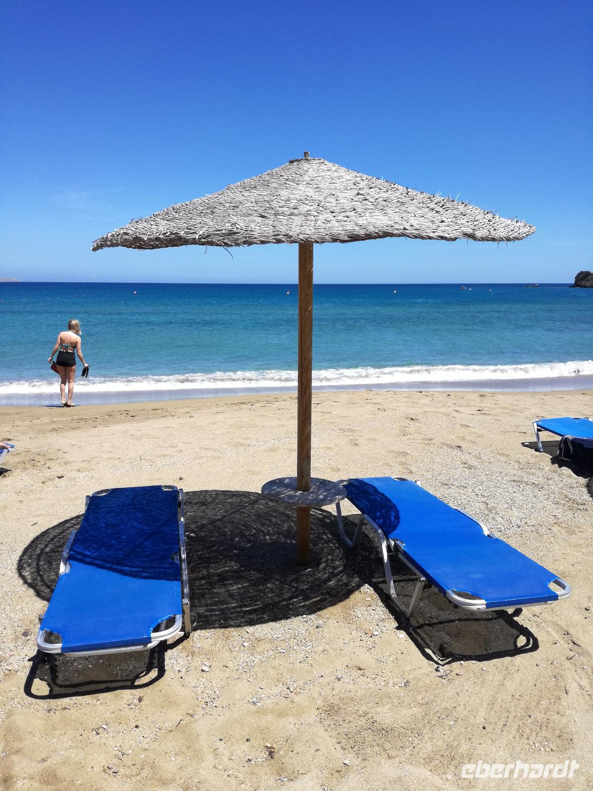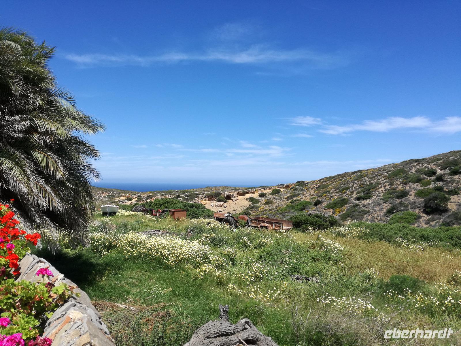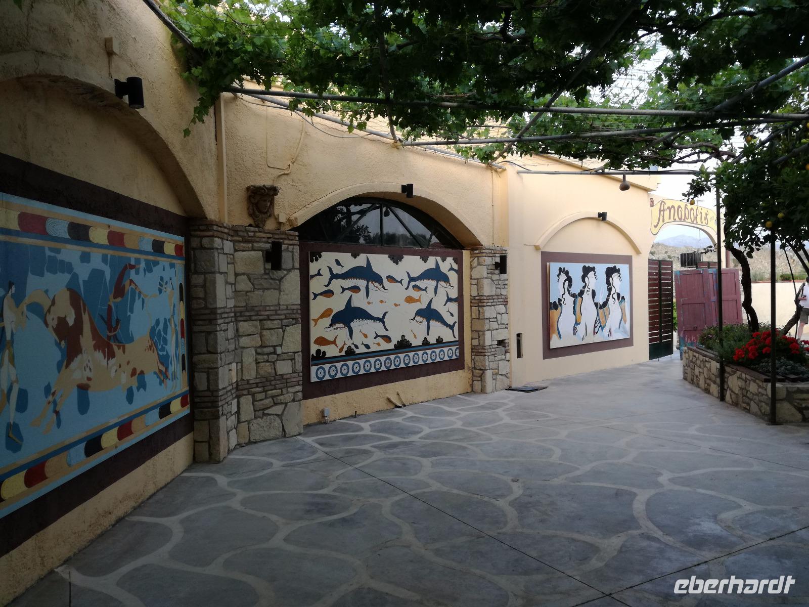 „Kalimera" tönt es bereits vom Ende der Treppe der Hotels als wir hinunter gehen. Das ist griechisch und bedeutet so viel wie „Guten Morgen". Wir fahren entlang der Küste in Richtung Osten. Zahlreiche Olivenbäume säumen den Weg. An der früheren minoischen Stadt Gournia, die an der schmalsten Stelle Ostkretas liegt halten wir um ein paar Bilder zu schießen. Im Gegensatz zu den anderen Ausgrabungsstätten der Insel Knossos und Festos, ist diese vollständig freigelegt. Da aber hier keine Restaurationen stattfanden braucht man viel Fantasie um sich die Stadt vorzustellen, die hier einmal war. Weiter ging unsere kurvenreiche Fahrt zum Kloster Toplou. Von Sitia kommend wirkt das Kloster eher wie eine Festung. Auch das stillgelegte Windrad, das vor dem Kloster steht, passt in das Bild. Wie viele Mönche hier noch wohnen wird nicht verraten. Doch es ist nicht verwunderlich, dass das Kloster wie eine Festung wirkt, da dieses sich in der Vergangenheit gegen Überfälle und Plünderungen wehren musste. Im Inneren kann man ein Kieselsteinmosaik bewundern und auch die Klosterkirche ist einen Besuch wert. Das Prachtstück der Kirche ist ein Bild aus dem Jahr 1770, das viele verschiedene biblische Themen darstellt, die fließend ineinander übergehen. Es bleibt noch Zeit für ein paar Bilder bevor wir uns zum einzigen Palmenstrand Europas aufmachen. Hier kommt Urlaubsstimmung auf, bei strahlend blauem Himmel haben meine Gäste die Möglichkeit den Sprung ins kühle Nass zu wagen oder ein Mittagessen in der Taverne einzunehmen. Gegen späten Nachmittag machen wir uns auch schon wieder auf den Weg zurück zum Hotel. Doch nicht ohne an dem Banenstrand an der Straße zu halten um uns Bananen zu kaufen, die laut Rena „so viel aromatischer als deutsche Bananen" sind. Mit vielen neuen Eindrücken machen wir uns auf den Weg zurück zum Hotel.