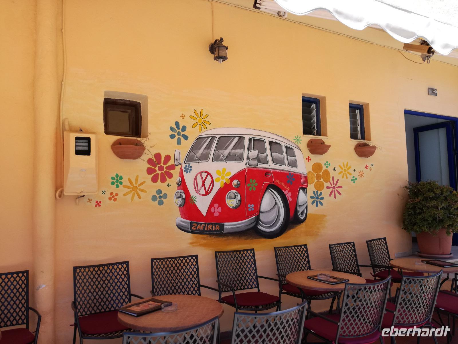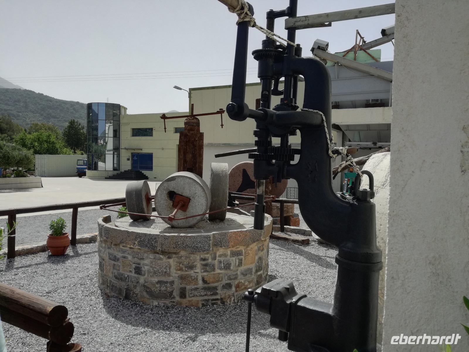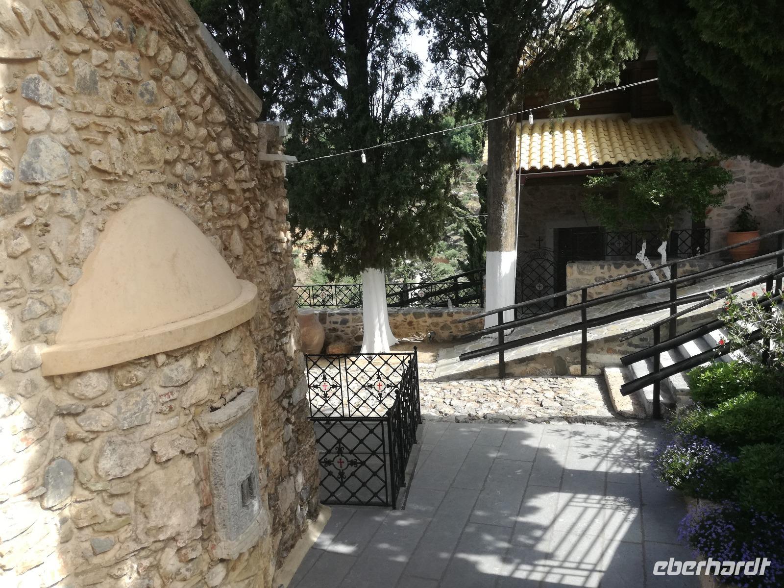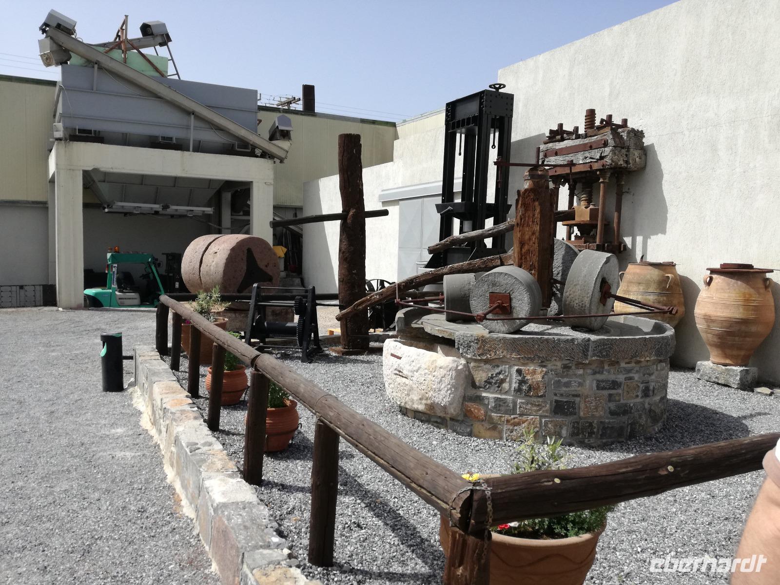 „Kalimera" tönt es bereits vom Ende der Treppe der Hotels als wir hinunter gehen. Das ist griechisch und bedeutet so viel wie „Guten Morgen". Wir fahren entlang der Küste in Richtung Osten. Zahlreiche Olivenbäume säumen den Weg. An der früheren minoischen Stadt Gournia, die an der schmalsten Stelle Ostkretas liegt halten wir um ein paar Bilder zu schießen. Im Gegensatz zu den anderen Ausgrabungsstätten der Insel Knossos und Festos, ist diese vollständig freigelegt. Da aber hier keine Restaurationen stattfanden braucht man viel Fantasie um sich die Stadt vorzustellen, die hier einmal war. Weiter ging unsere kurvenreiche Fahrt zum Kloster Toplou. Von Sitia kommend wirkt das Kloster eher wie eine Festung. Auch das stillgelegte Windrad, das vor dem Kloster steht, passt in das Bild. Wie viele Mönche hier noch wohnen wird nicht verraten. Doch es ist nicht verwunderlich, dass das Kloster wie eine Festung wirkt, da dieses sich in der Vergangenheit gegen Überfälle und Plünderungen wehren musste. Im Inneren kann man ein Kieselsteinmosaik bewundern und auch die Klosterkirche ist einen Besuch wert. Das Prachtstück der Kirche ist ein Bild aus dem Jahr 1770, das viele verschiedene biblische Themen darstellt, die fließend ineinander übergehen. Es bleibt noch Zeit für ein paar Bilder bevor wir uns zum einzigen Palmenstrand Europas aufmachen. Hier kommt Urlaubsstimmung auf, bei strahlend blauem Himmel haben meine Gäste die Möglichkeit den Sprung ins kühle Nass zu wagen oder ein Mittagessen in der Taverne einzunehmen. Gegen späten Nachmittag machen wir uns auch schon wieder auf den Weg zurück zum Hotel. Doch nicht ohne an dem Banenstrand an der Straße zu halten um uns Bananen zu kaufen, die laut Rena „so viel aromatischer als deutsche Bananen" sind. Mit vielen neuen Eindrücken machen wir uns auf den Weg zurück zum Hotel.
